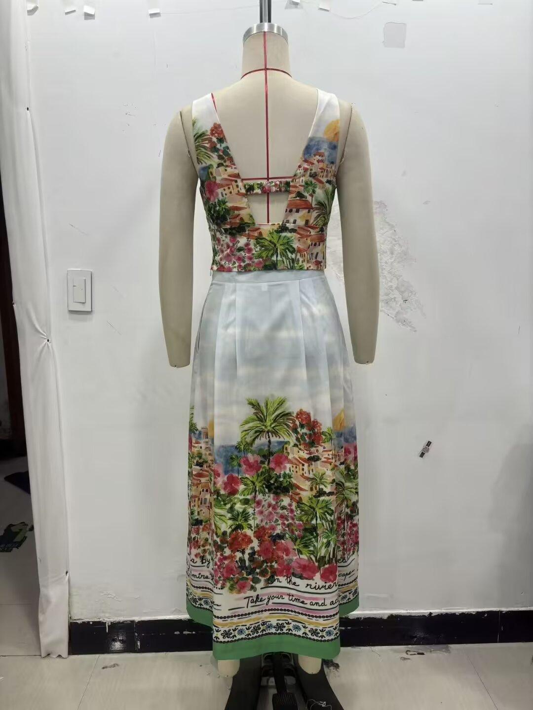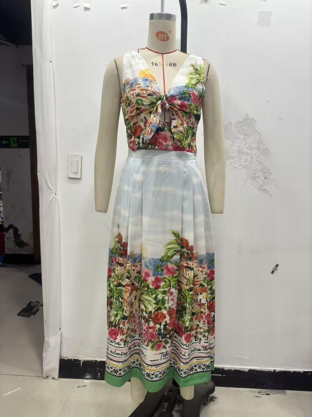 Estilo Europeo y Americano Amazon Aliexpress Tendencia de Moda Popular Versátil Top con Nudo Estampado Traje de Falda Midi