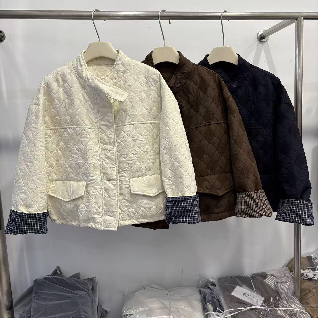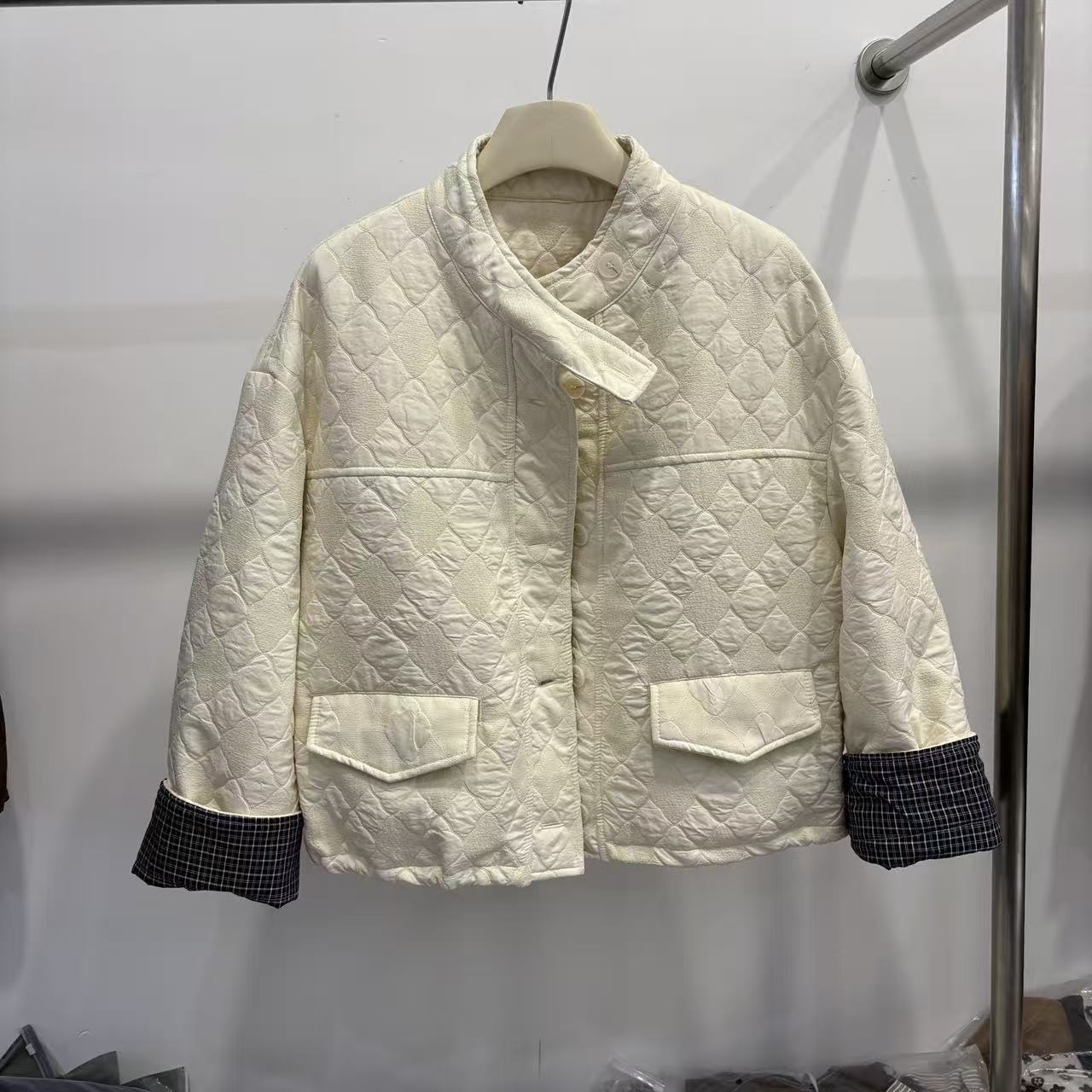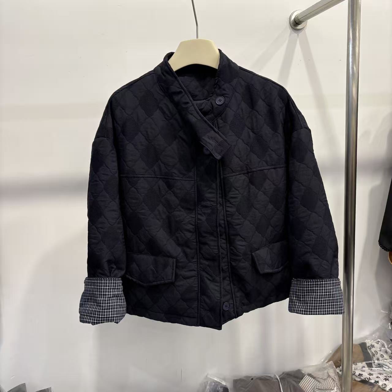 Chaqueta Fina de Algodón con Cuadros Patchwork de Cuello Alto Estilo Coreano Abrigo para Mujer 2025 Otoño Nuevo Suelto Petite Acolchado Trendy
