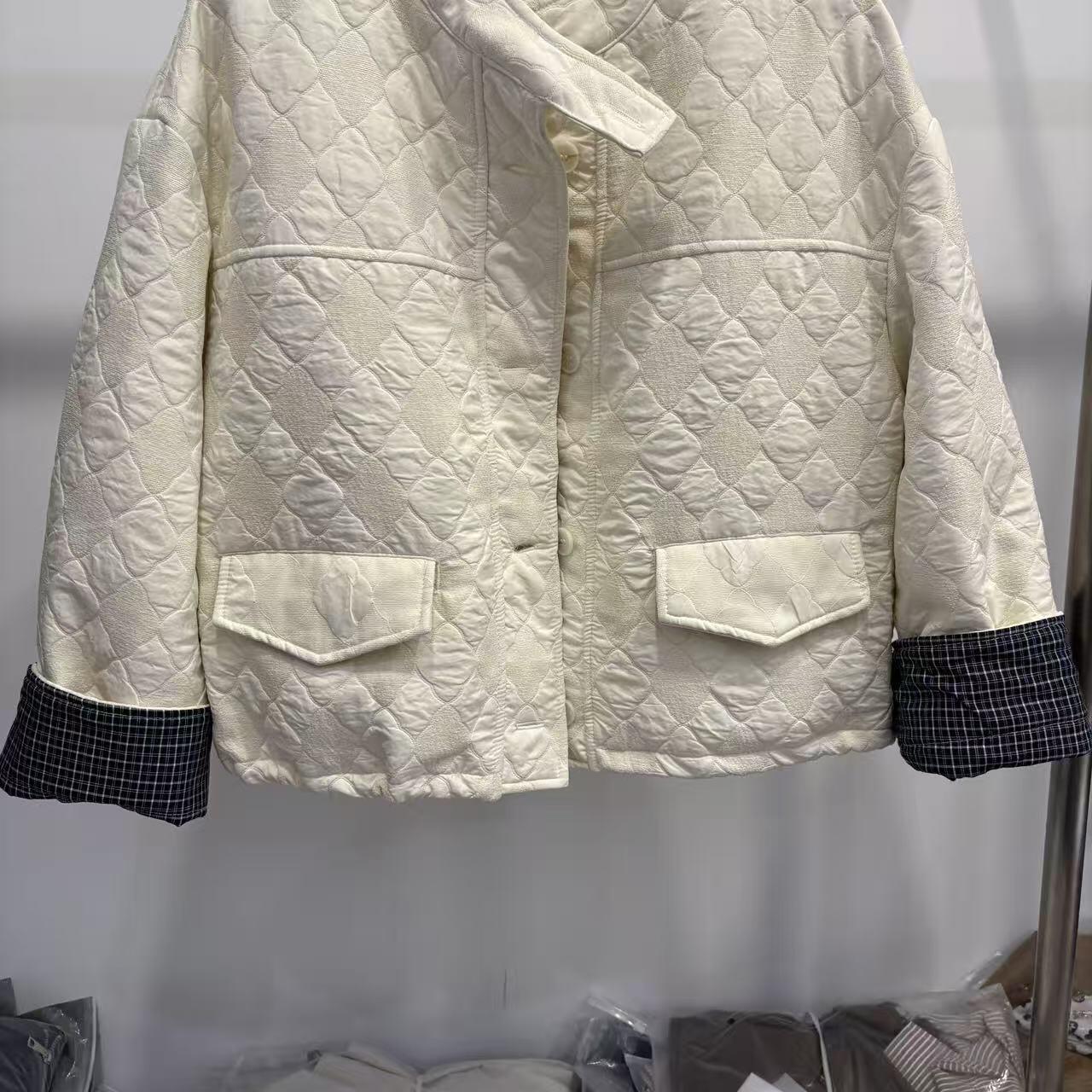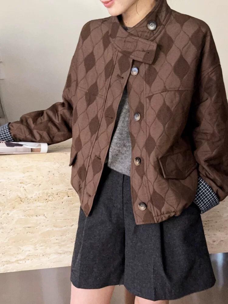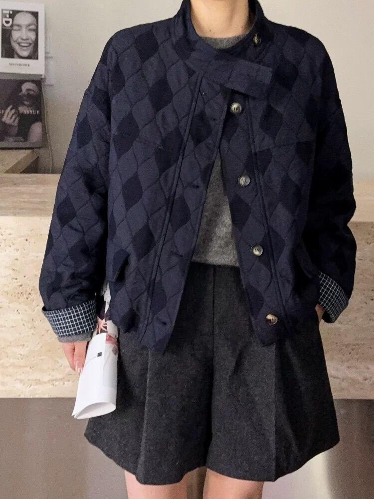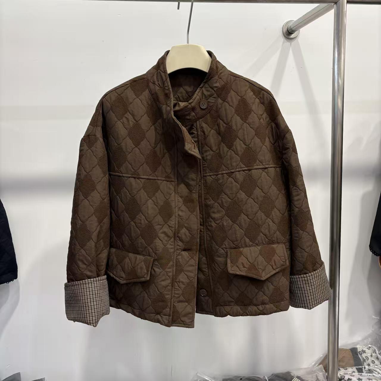 Chaqueta Fina de Algodón con Cuadros Patchwork de Cuello Alto Estilo Coreano Abrigo para Mujer 2025 Otoño Nuevo Suelto Petite Acolchado Trendy