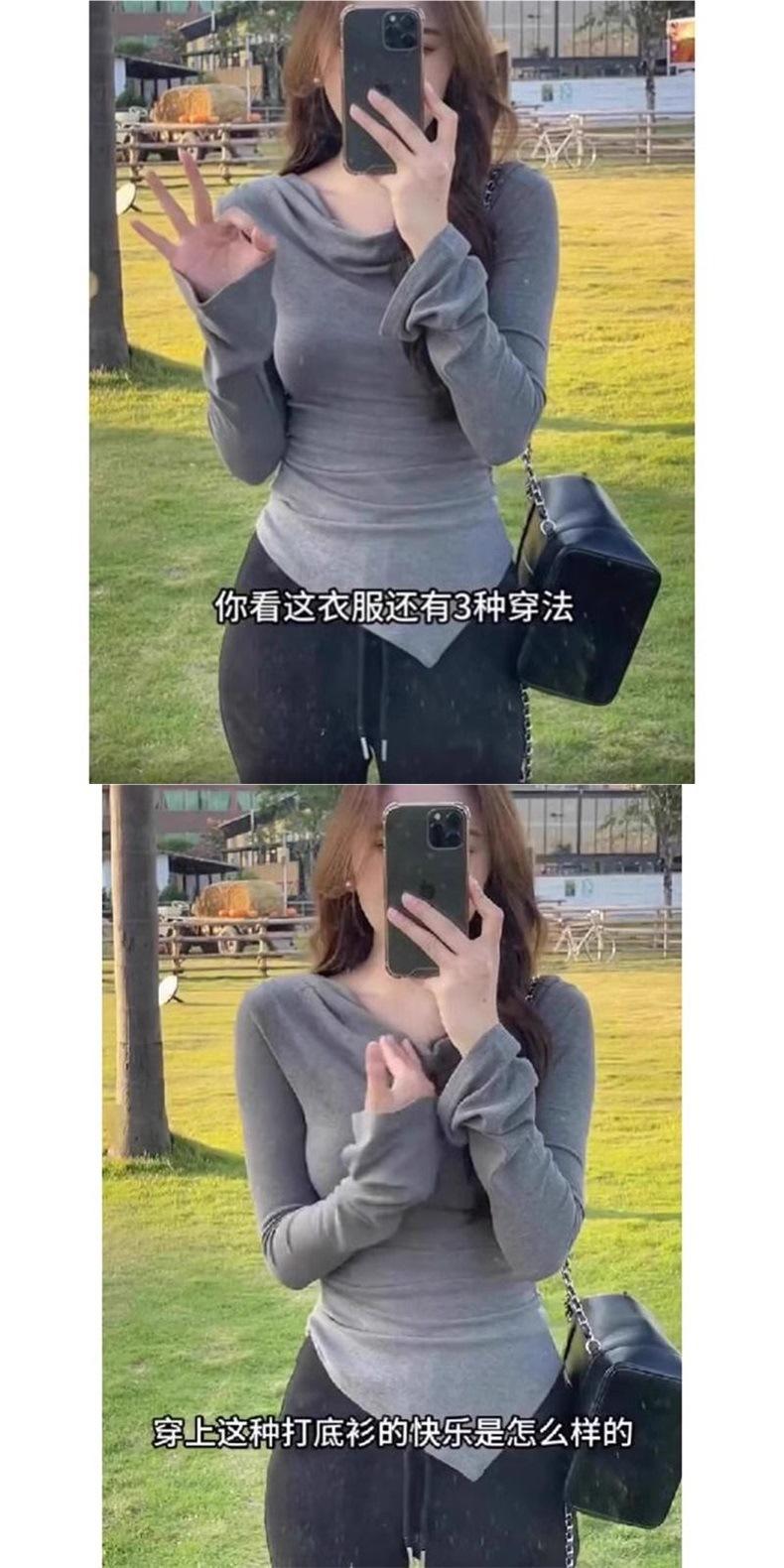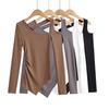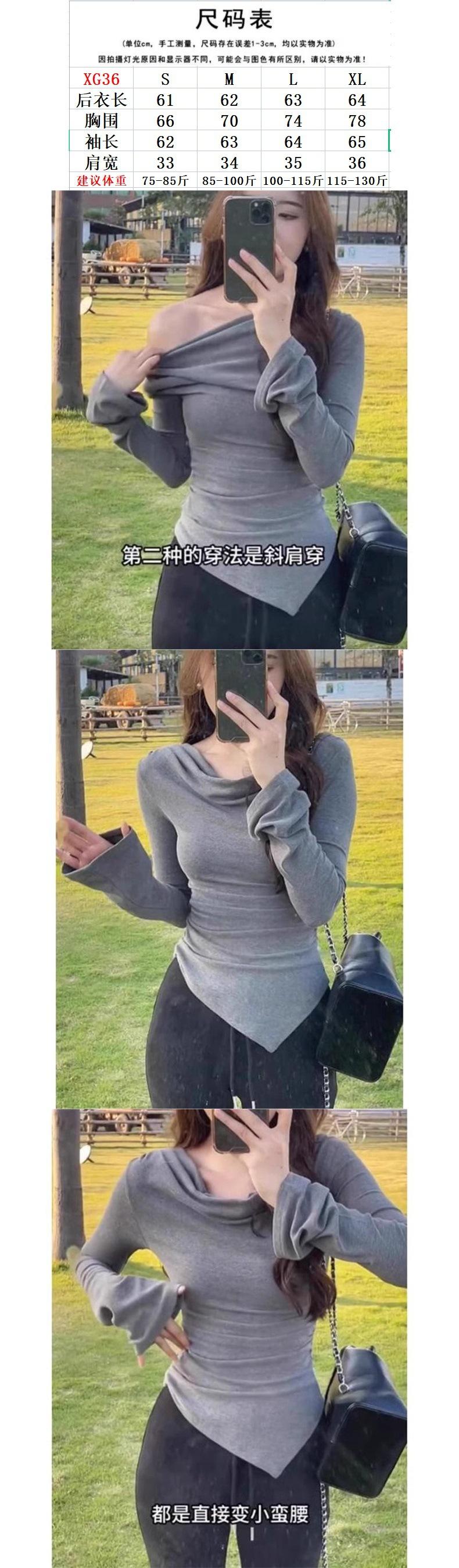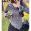 Camiseta de Manga Larga Irregular con Sentido del Diseño para Mujer Otoño Primavera Capa Base Gris Ajustada Hombro Descubierto Un Hombro Top Clavícula