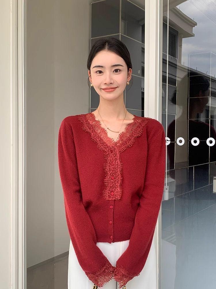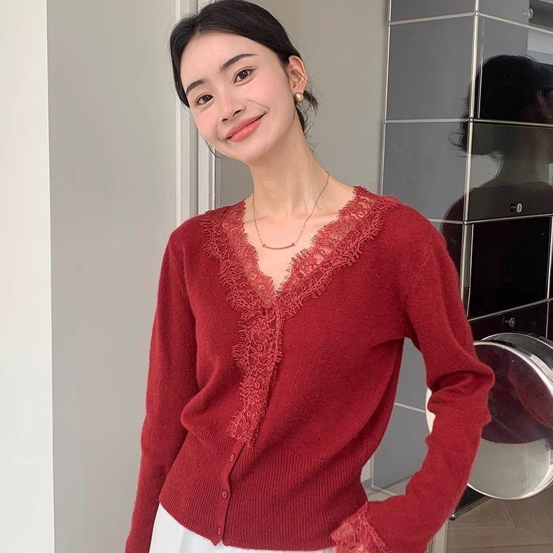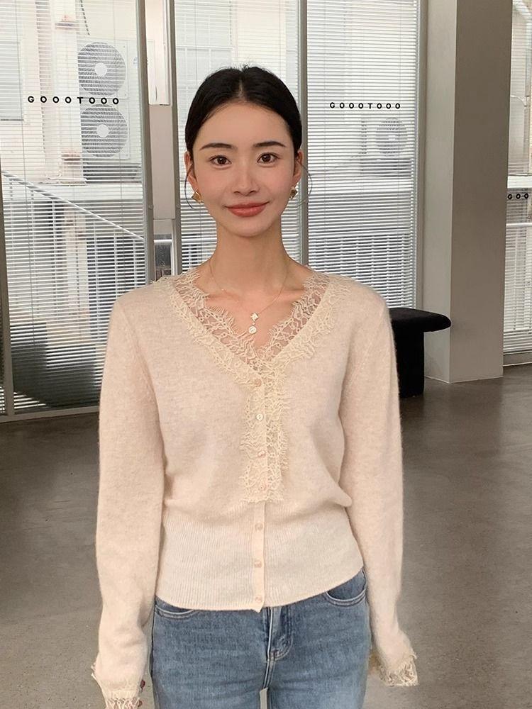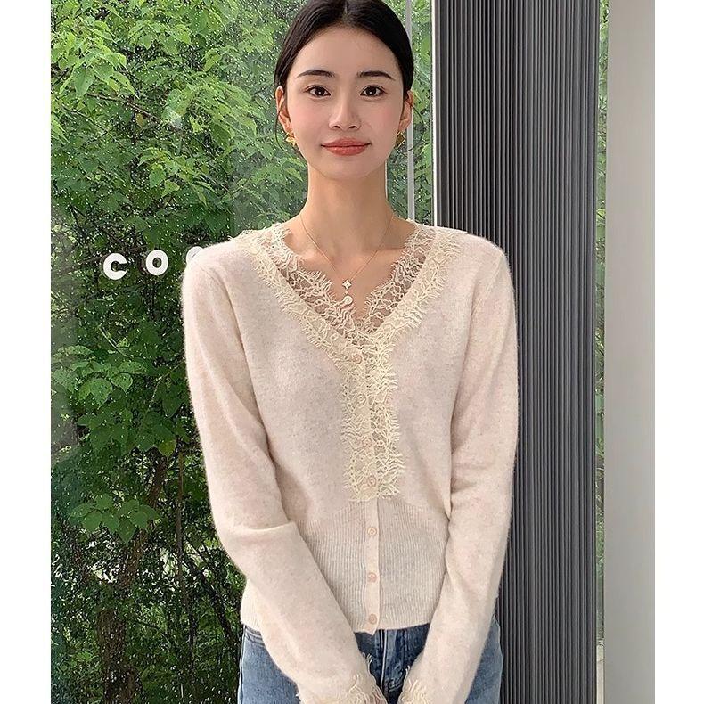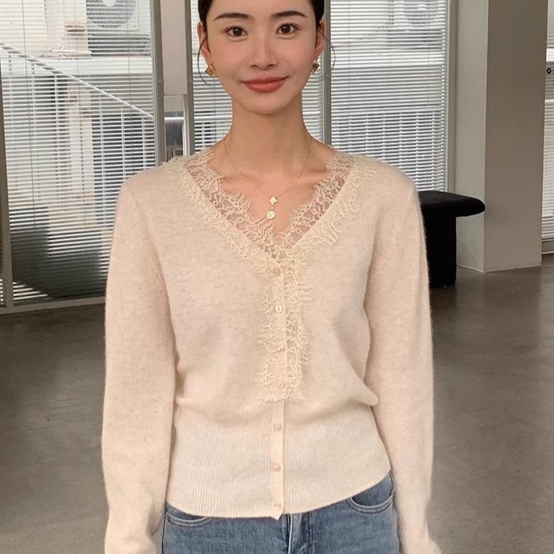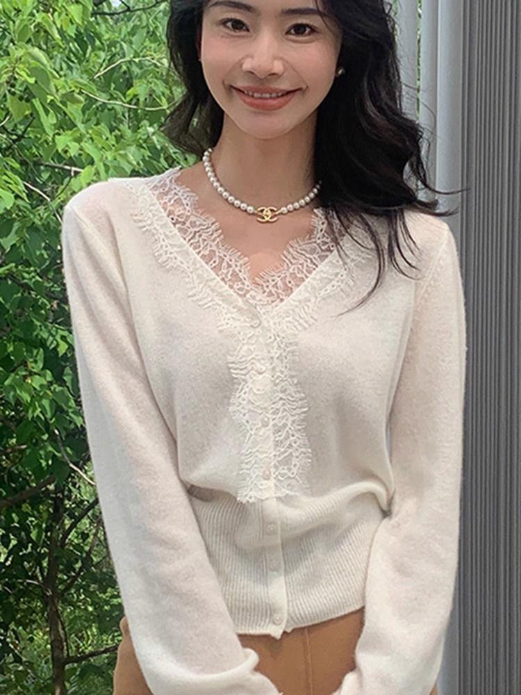 Cárdigan de Encaje Mujer Cuello en V Corto Suéter Exterior Delgado 2025 Nuevo Primavera Abrigo de Punto Dopamina Moda