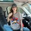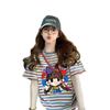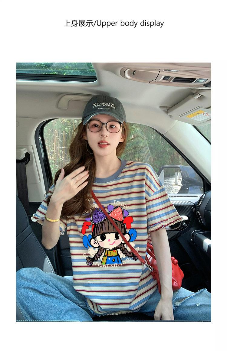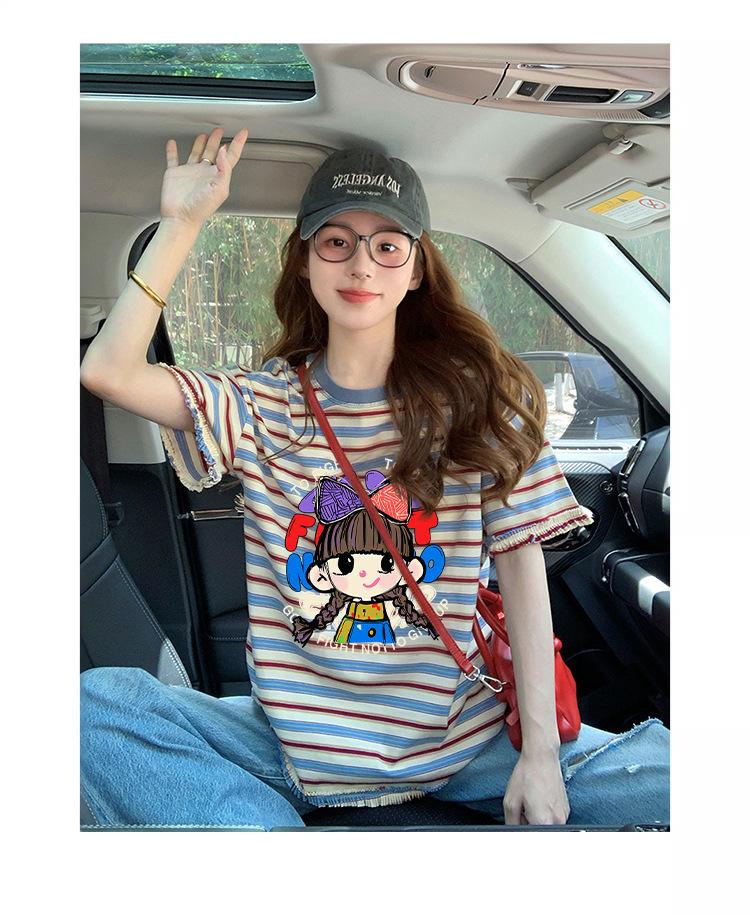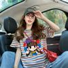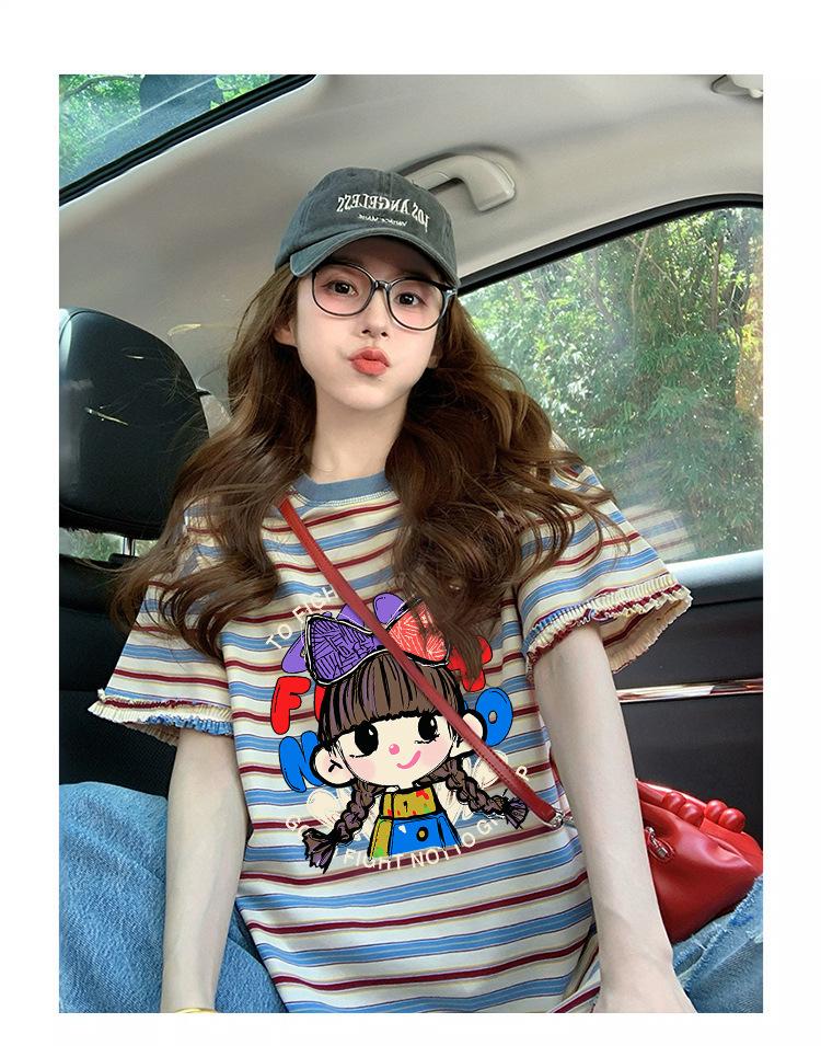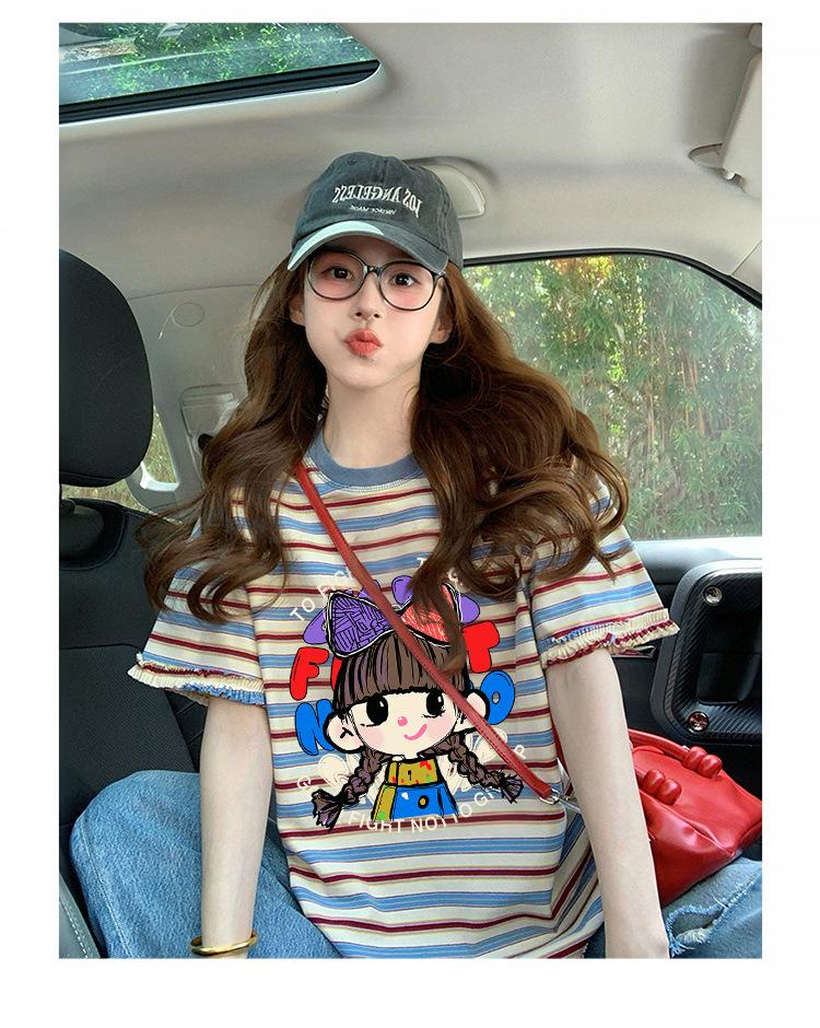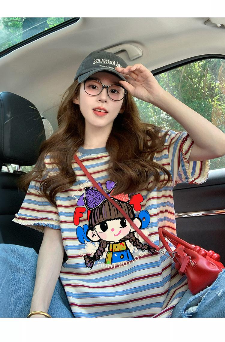 Camiseta de manga corta de algodón puro a rayas de bloques de color de alta gama para mujer, estilo suave, niña, grafiti, temperamento suelto, top de encaje ins