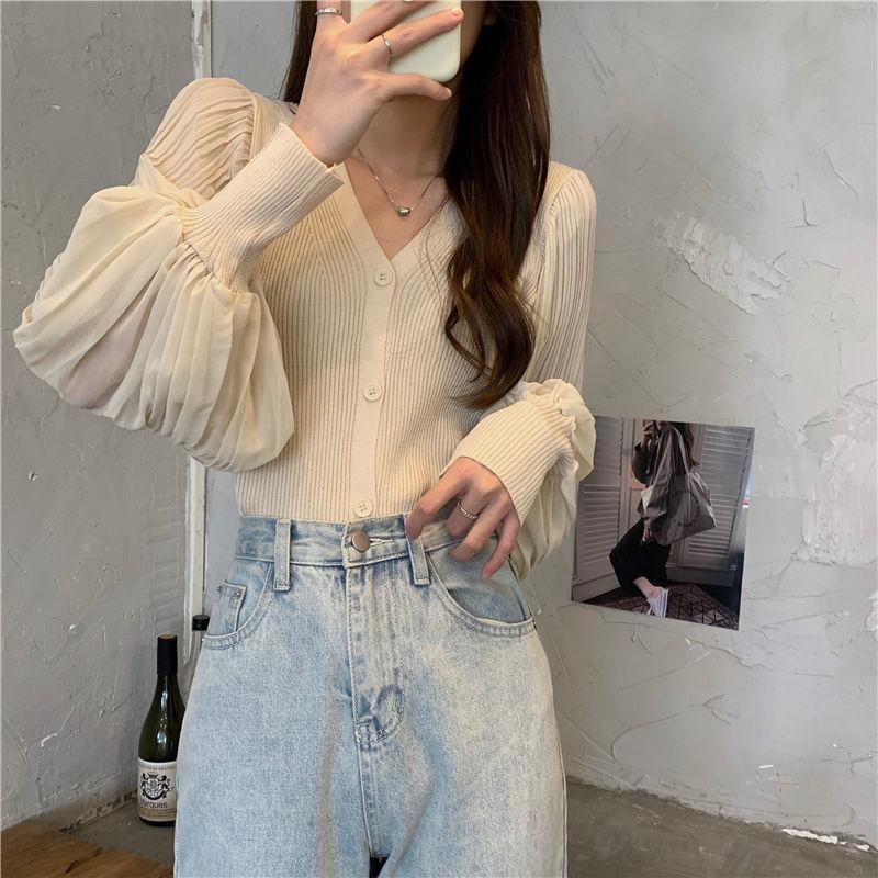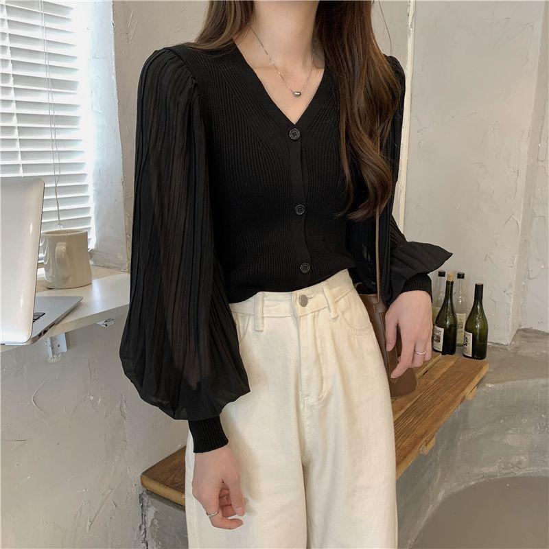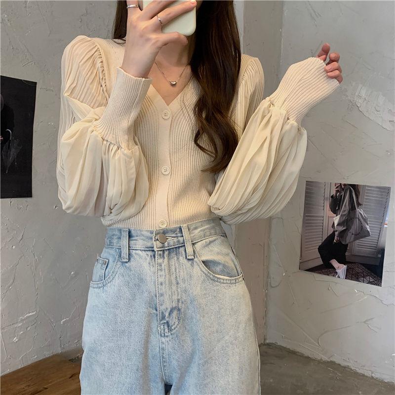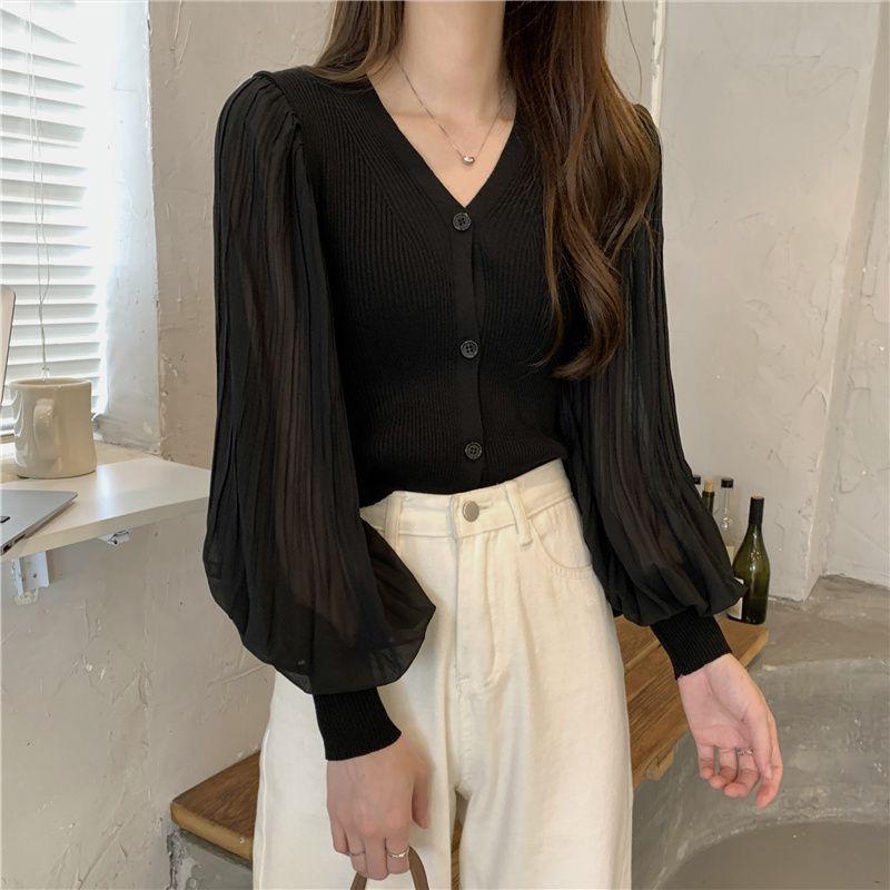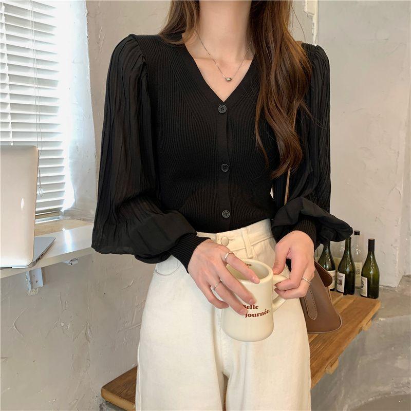 Primavera y Otoño Delgado Versátil Cuello en V Manga Larga Top de Punto Cárdigan Ropa Exterior Suéter Manga Farol Chaqueta Corta para Mujer Otoño/Invierno