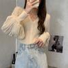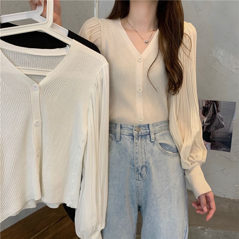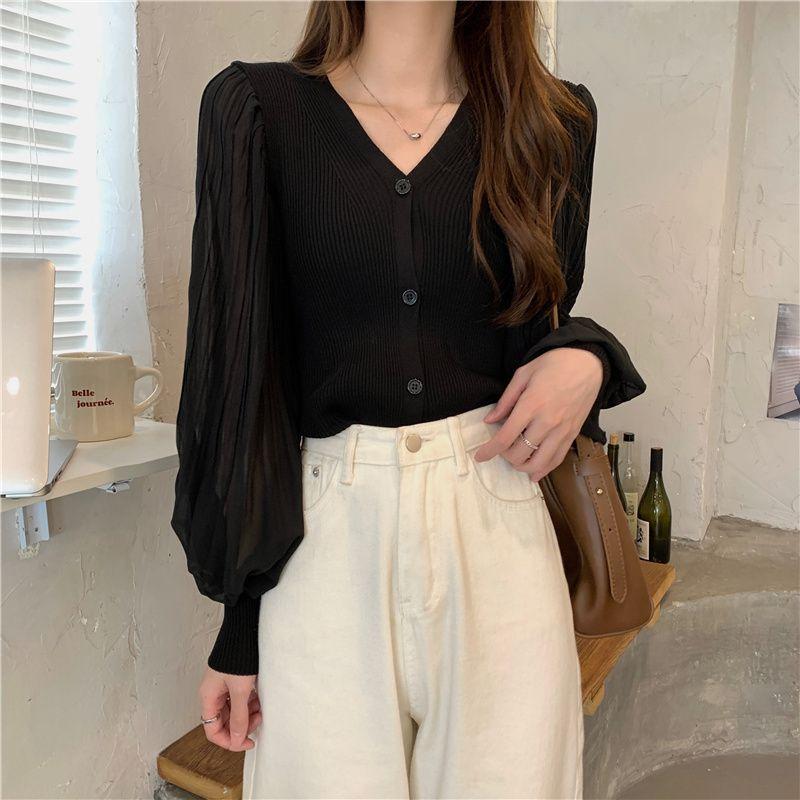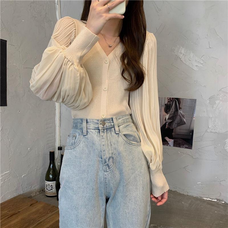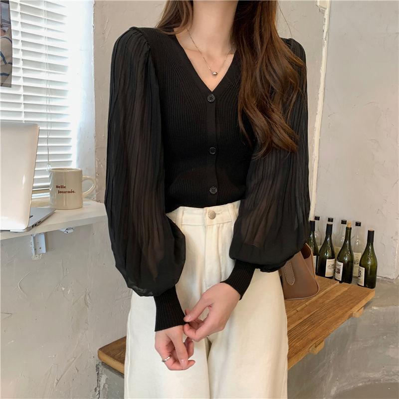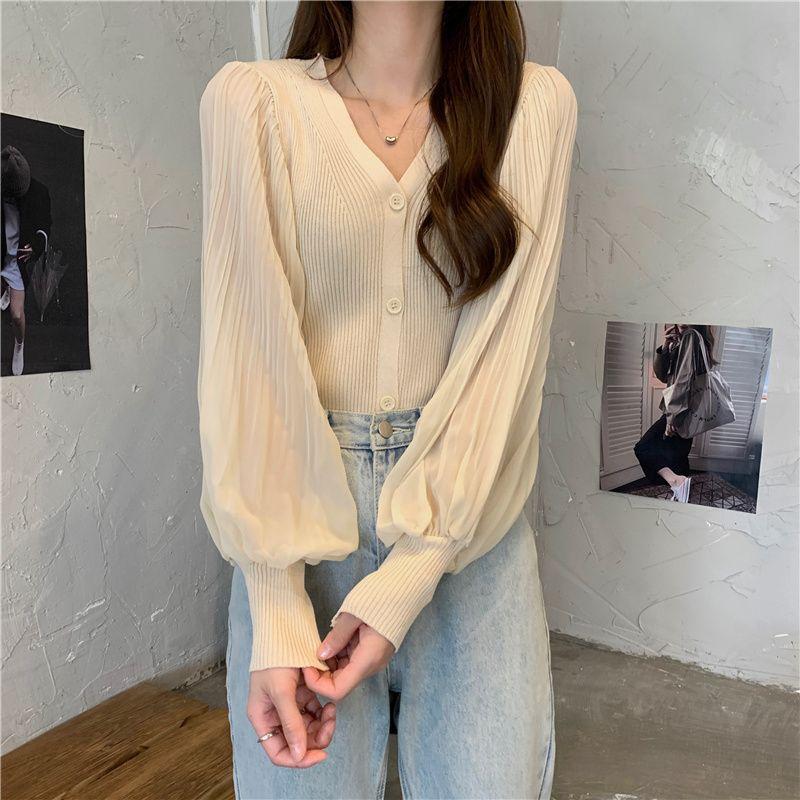 Primavera y Otoño Delgado Versátil Cuello en V Manga Larga Top de Punto Cárdigan Ropa Exterior Suéter Manga Farol Chaqueta Corta para Mujer Otoño/Invierno