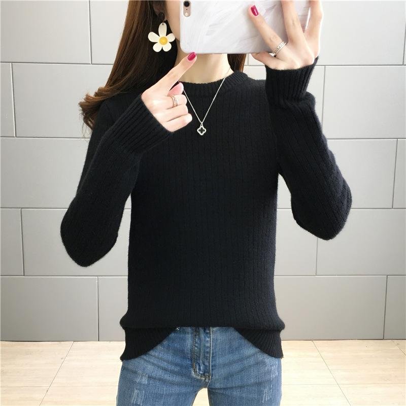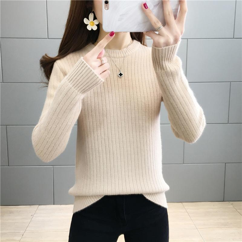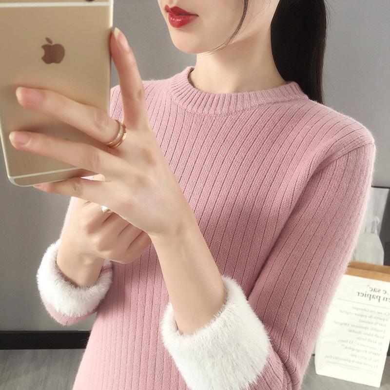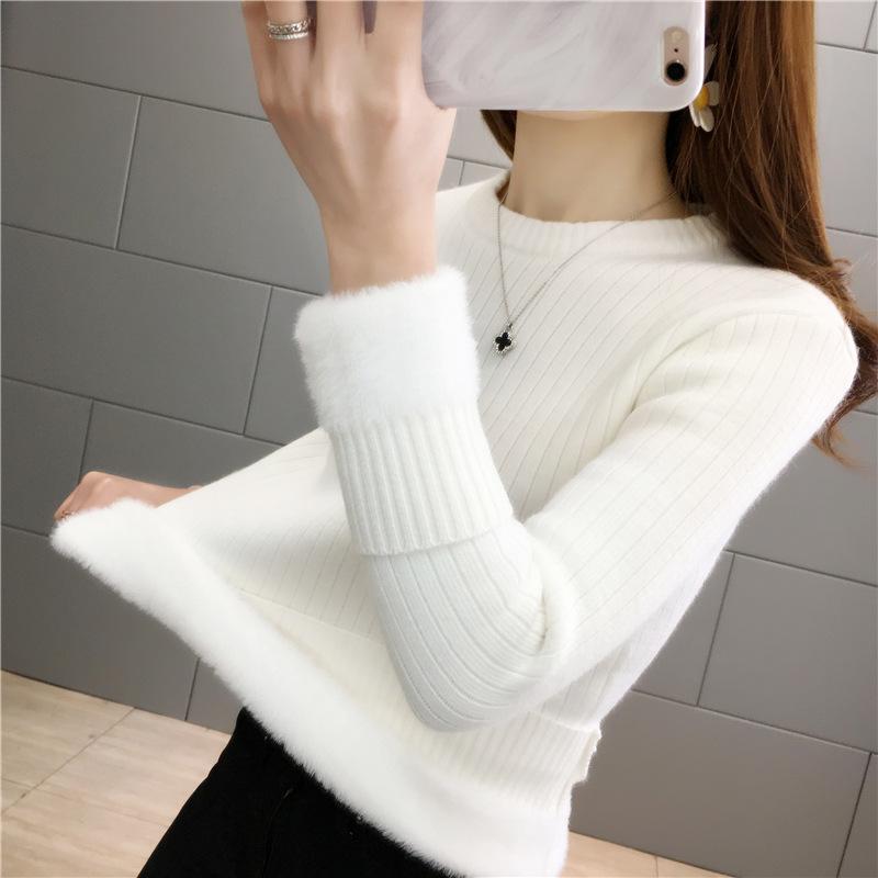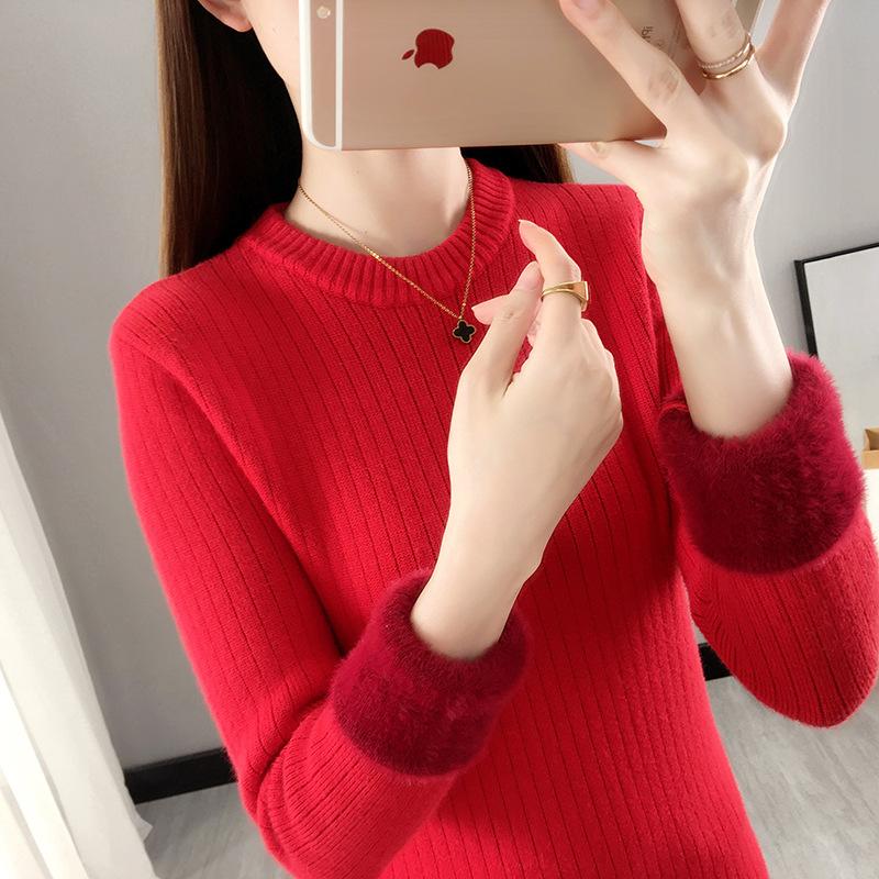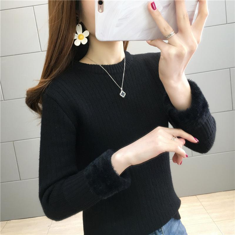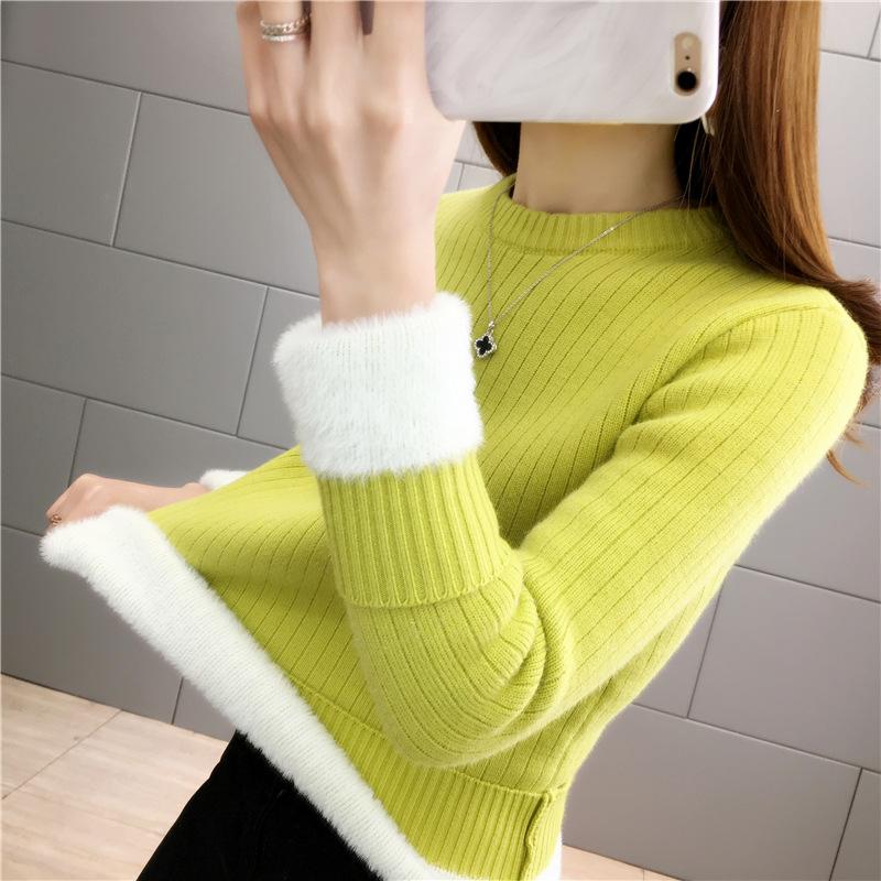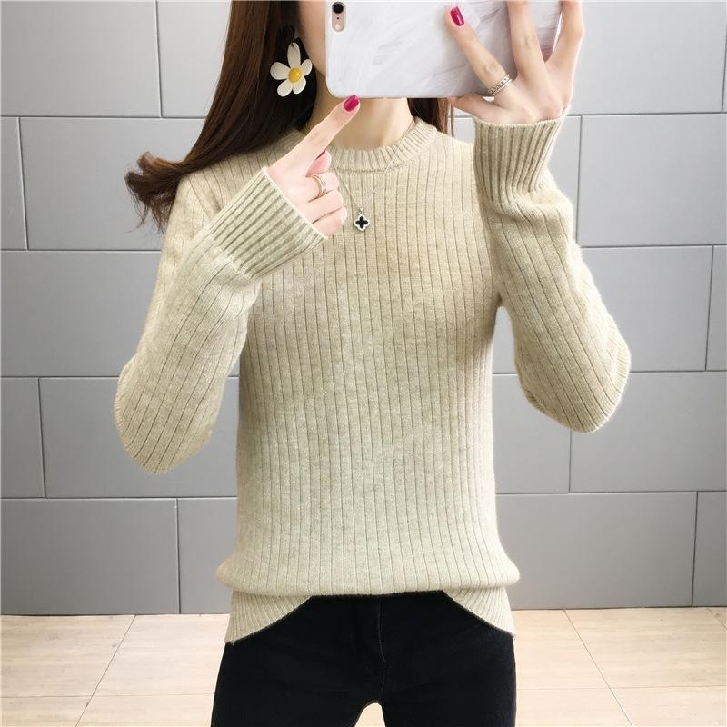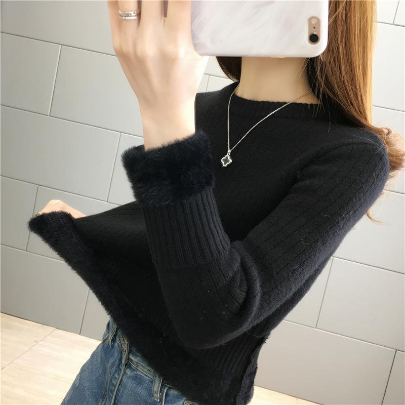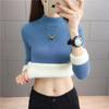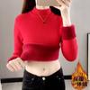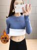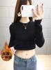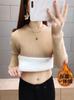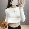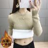 Suéter de lana de una pieza de cuello redondo forrado de vellón y engrosado para mujer, top de punto para otoño e invierno 2025, capa base ajustada, prenda interior de manga larga