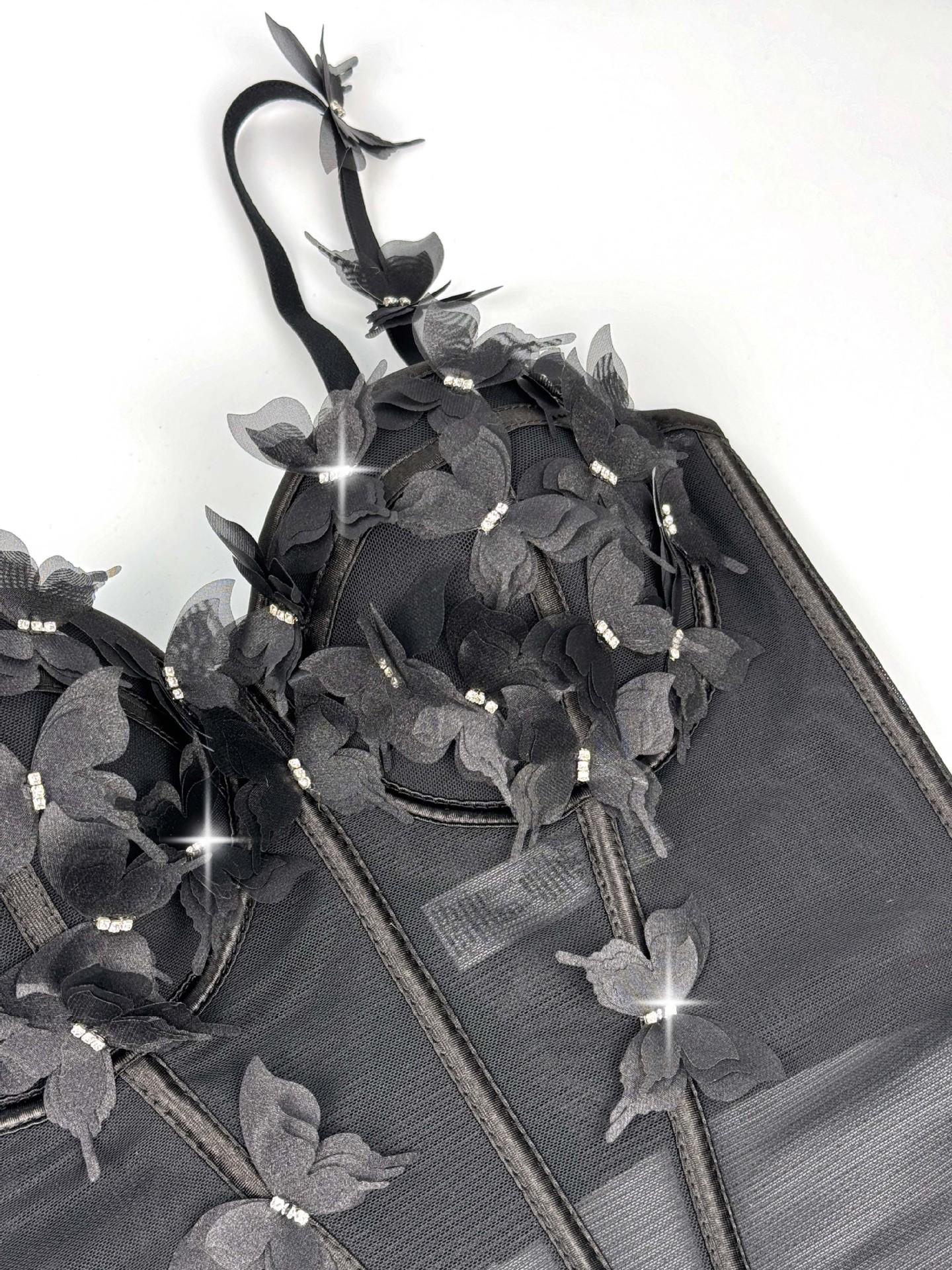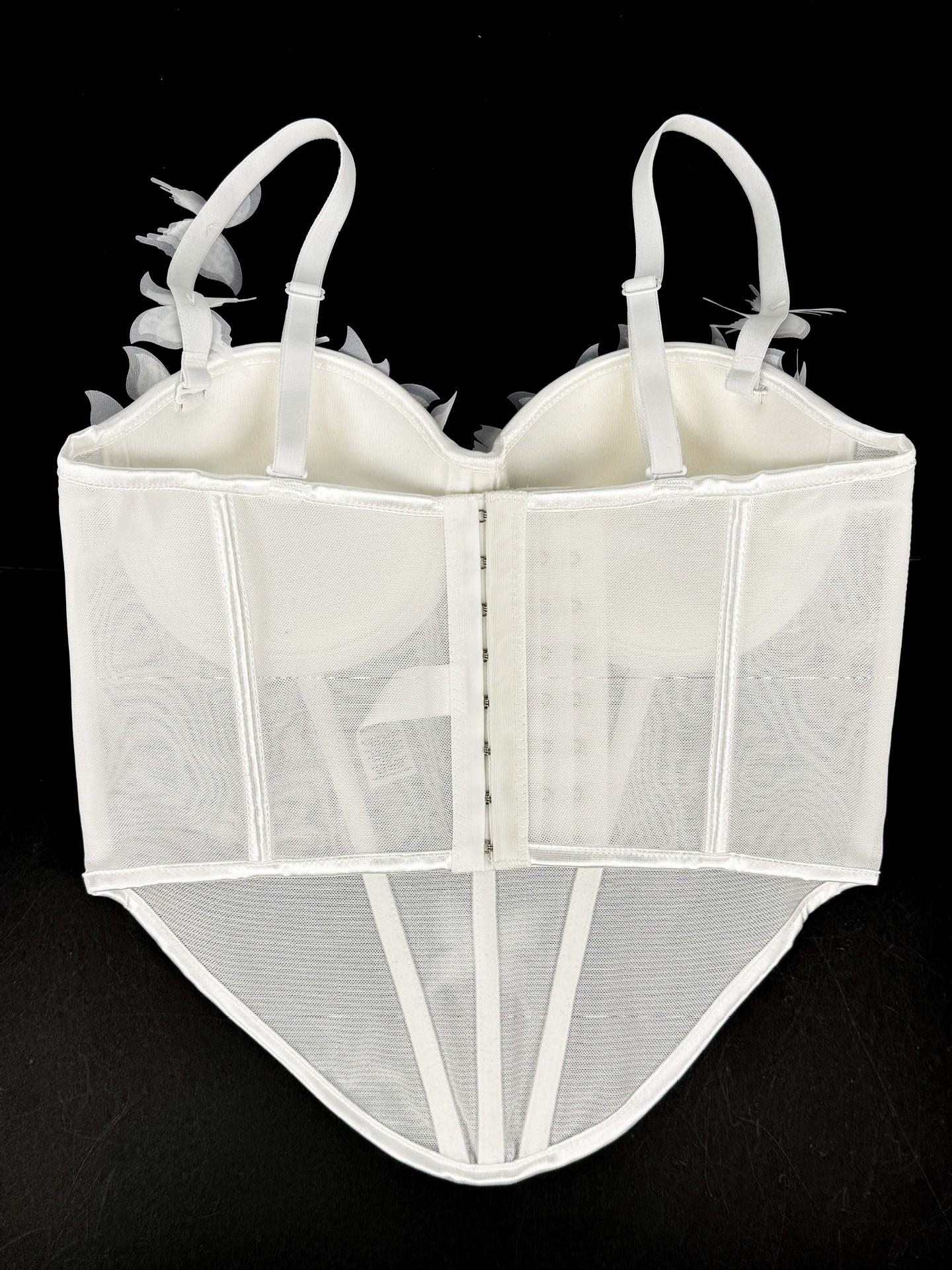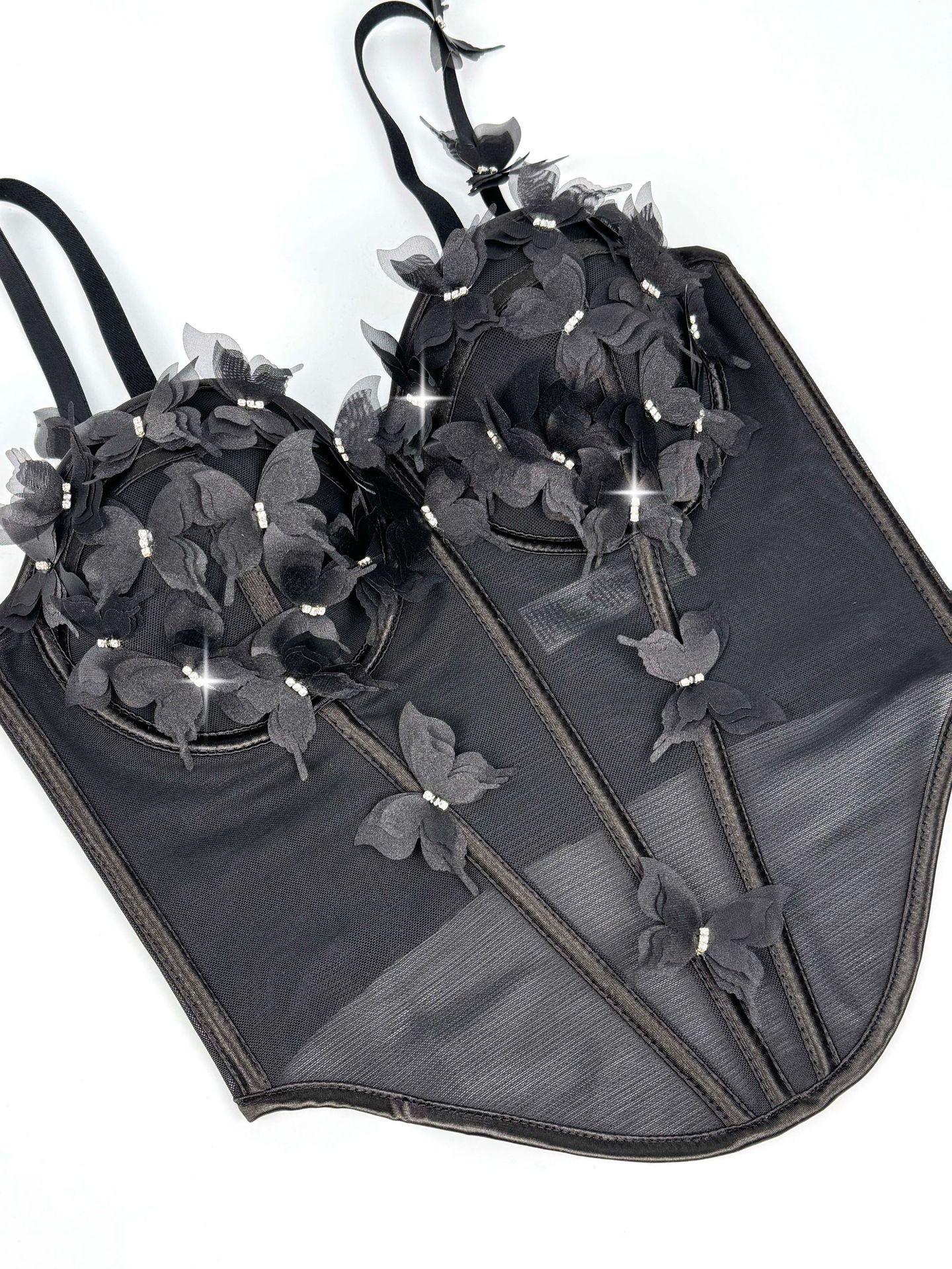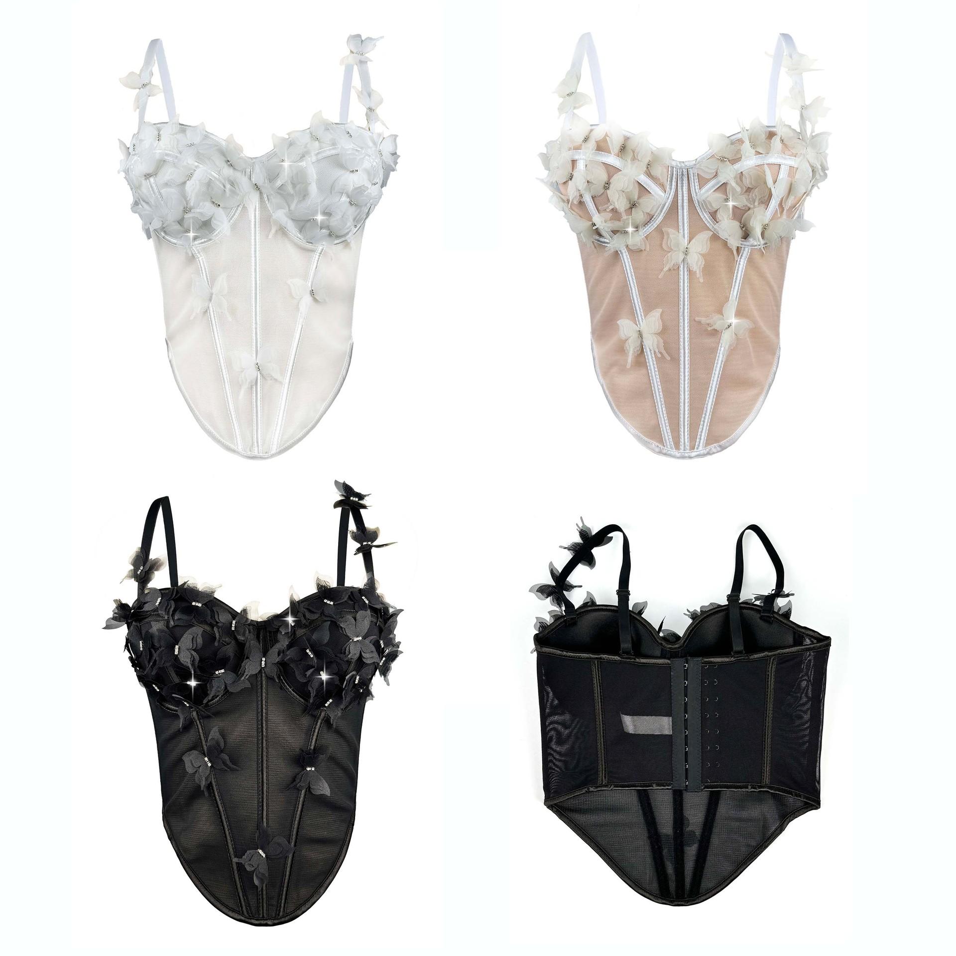 Sujetador corsé de tirantes con mariposa tridimensional de pedrería translúcido delgado con varillas nicho de alta gama temperamento sexy chaqueta corsé