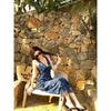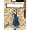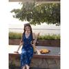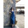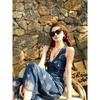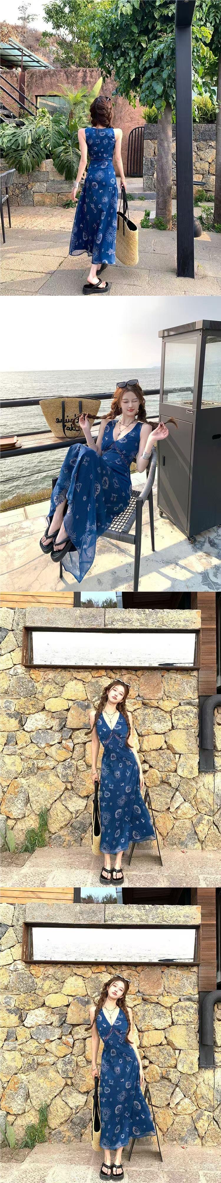 Vestido Retro Francés de Cuello en V Sin Mangas para Mujer Verano Temperamento Azul Marino Vestido Largo Nicho Adelgazante de Cintura Vestido Línea A