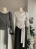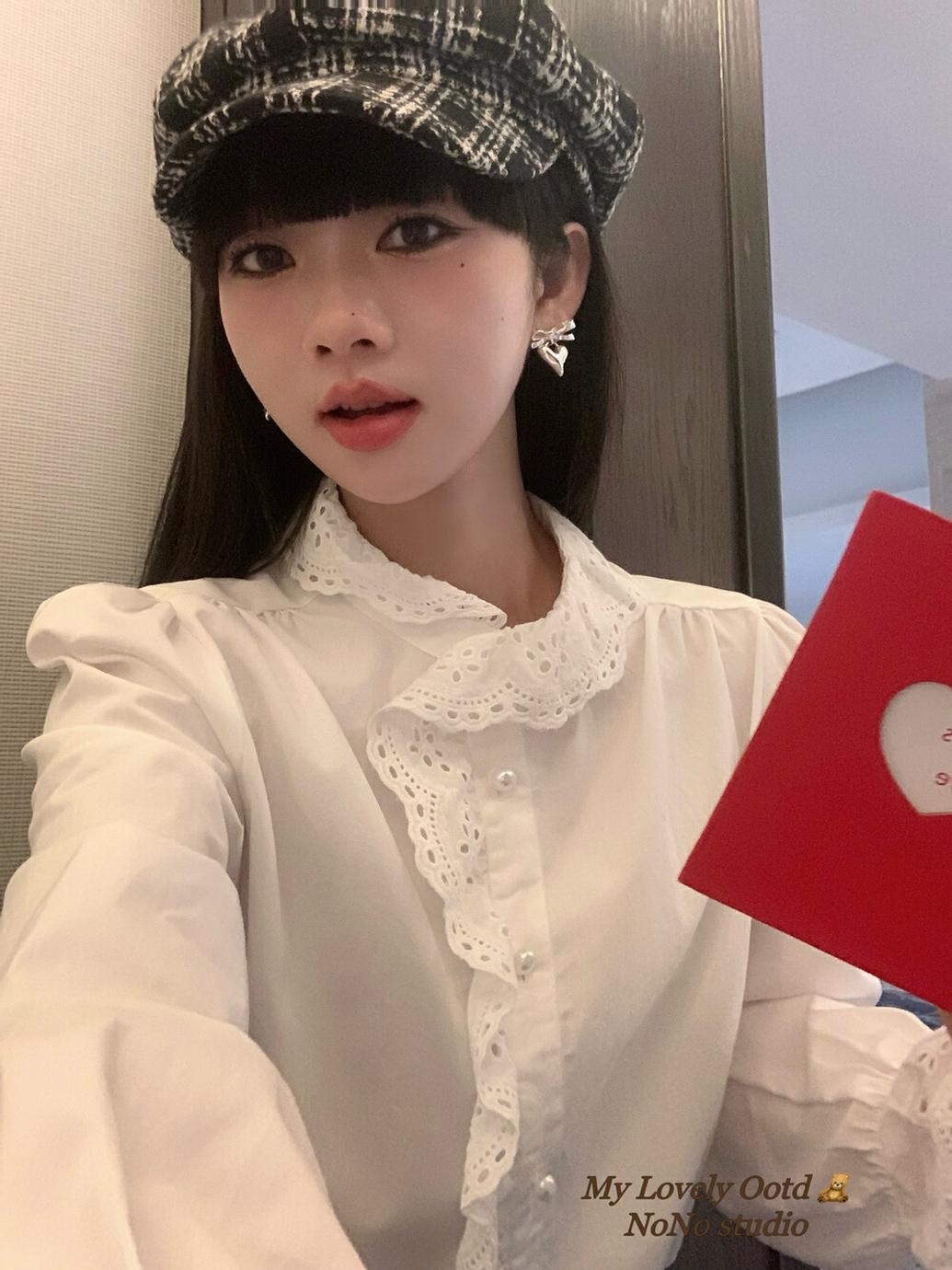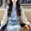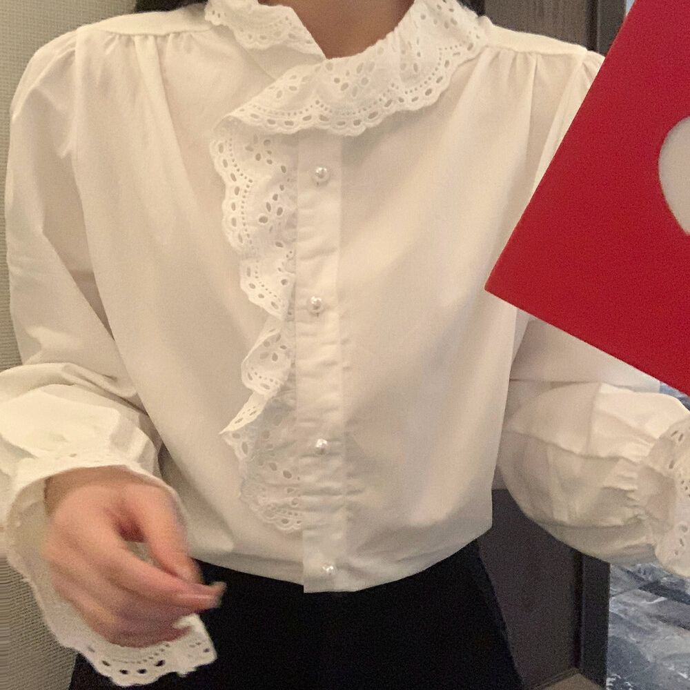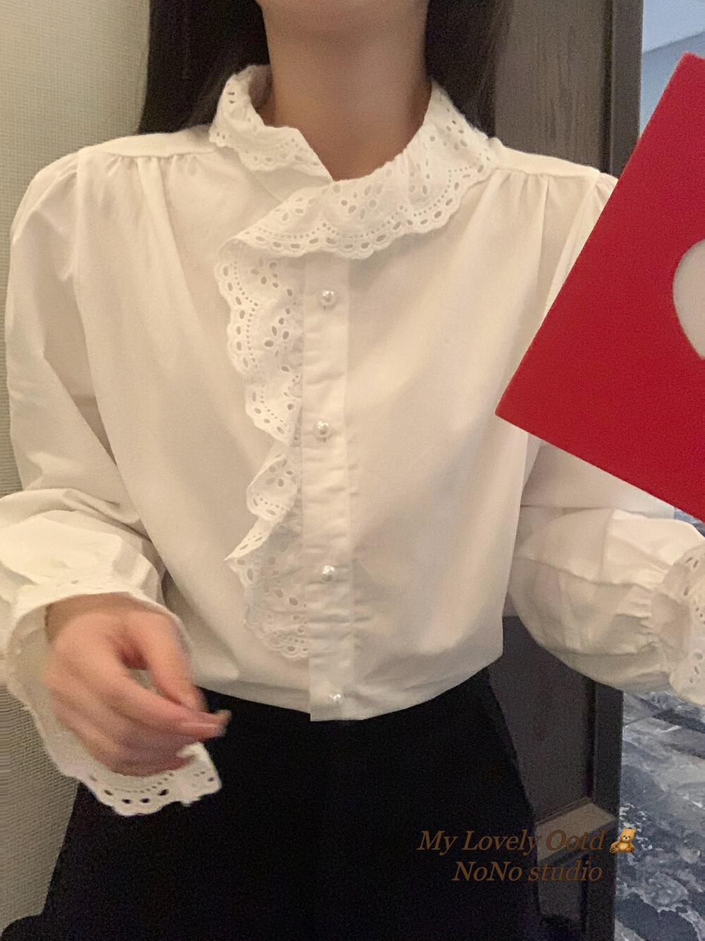Blusa con Cuello de Encaje Francés para Mujer Top de Moda Versátil Estilo Coreano Ropa Interior Camisa Blanca de Manga Acampanada