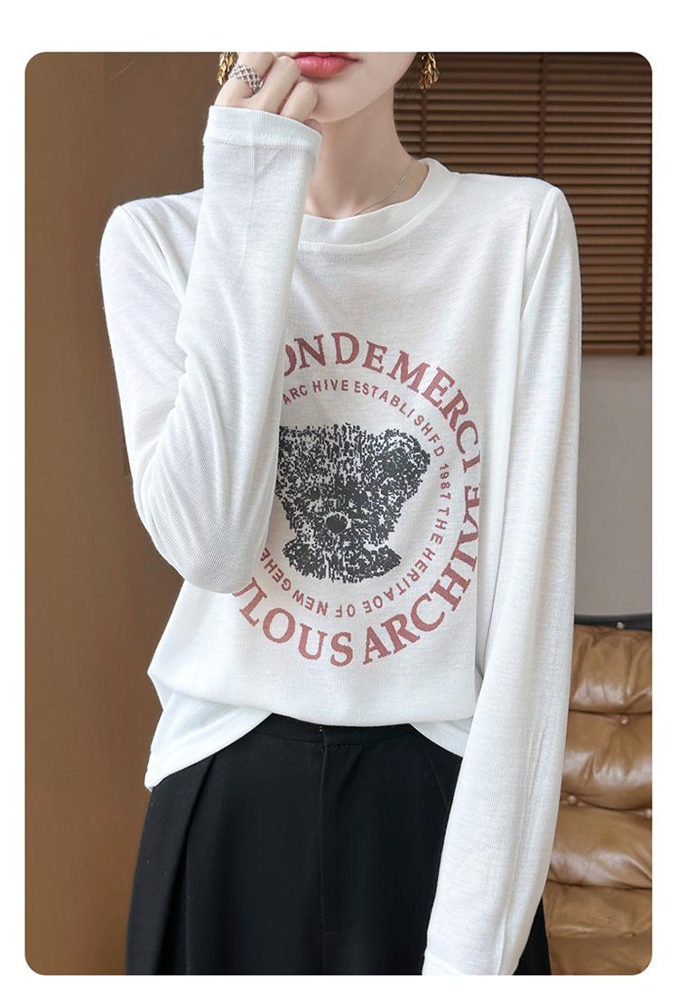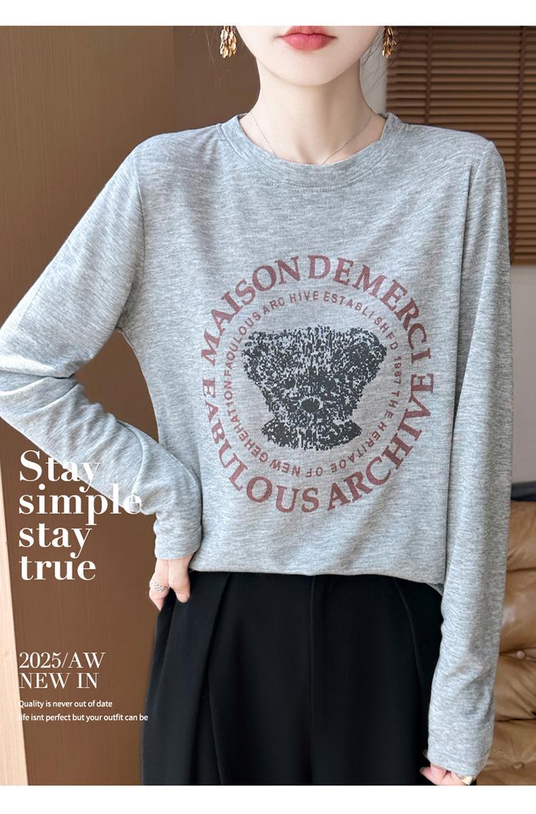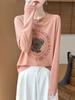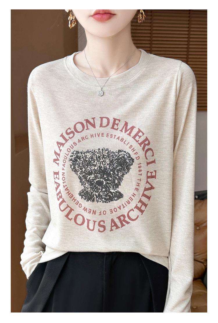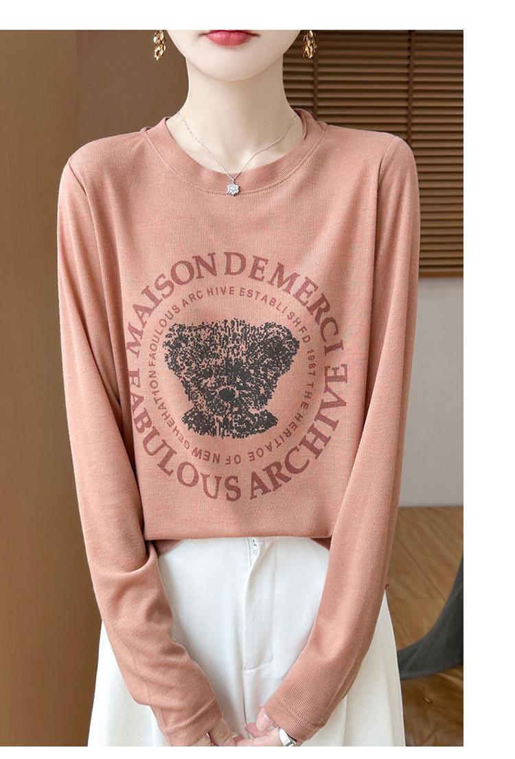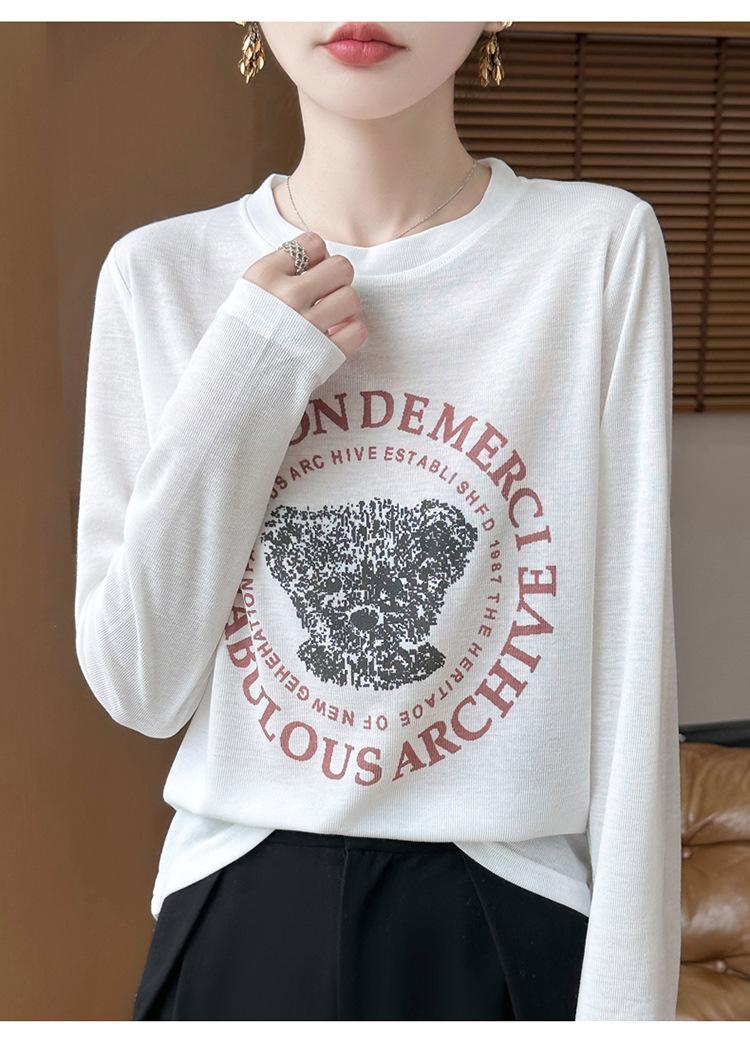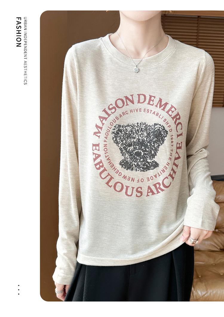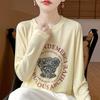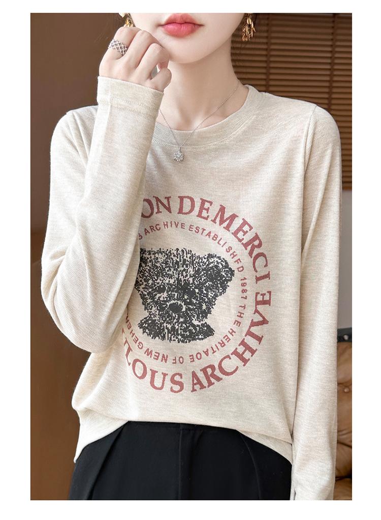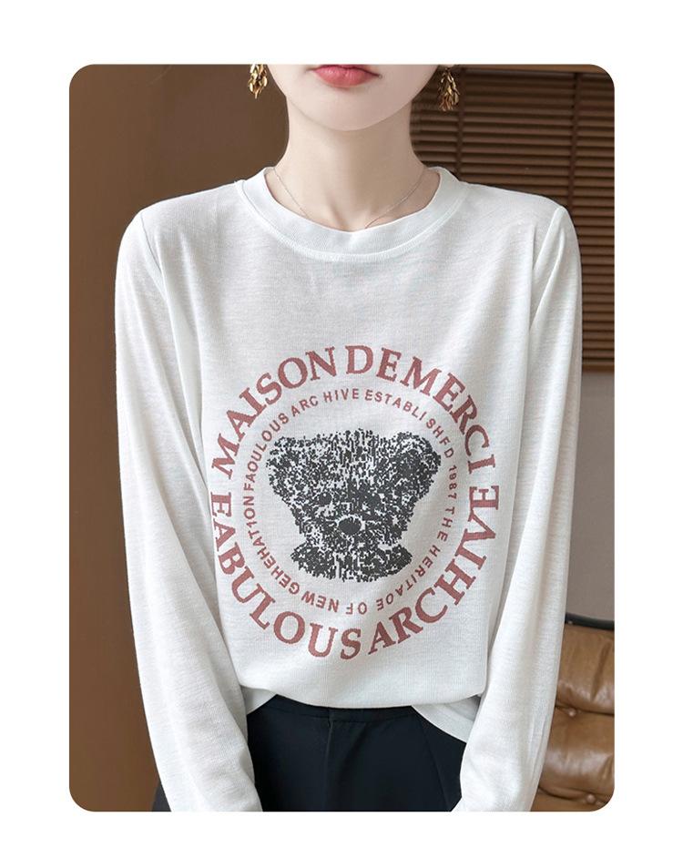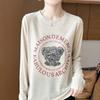 2025 Principios de Otoño Nuevo Tejido Fino Cuello Redondo Manga Larga Mujer Estampado de Oso Suéter Holgado Capa Base