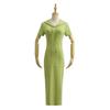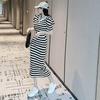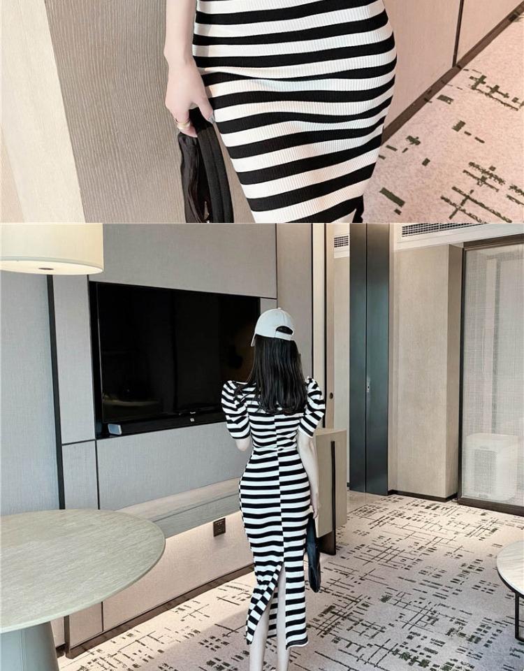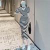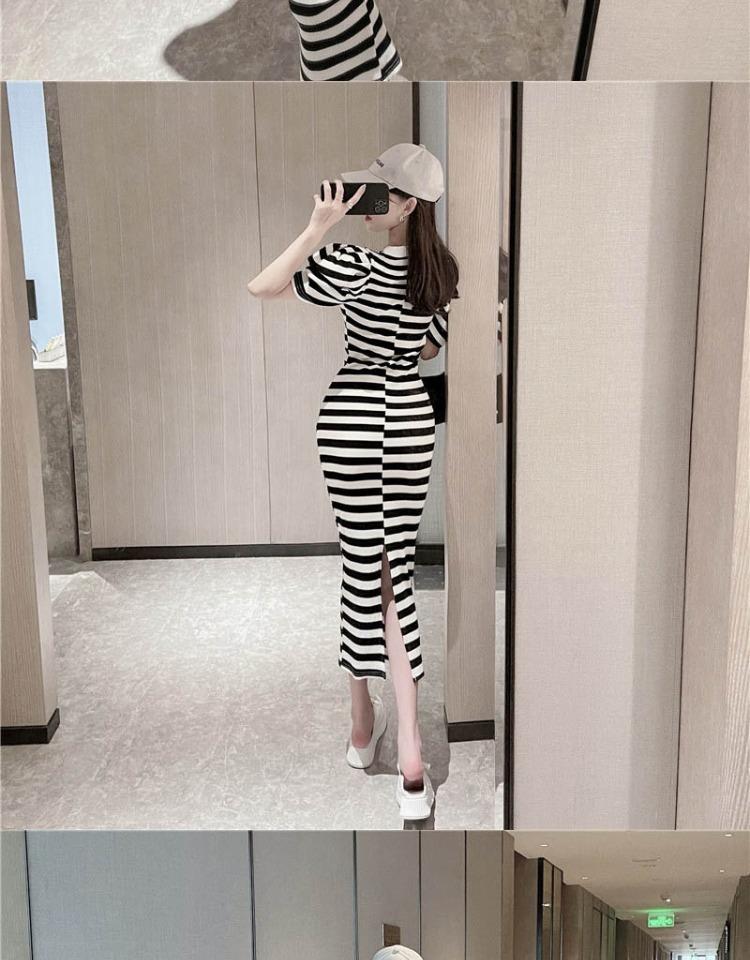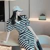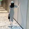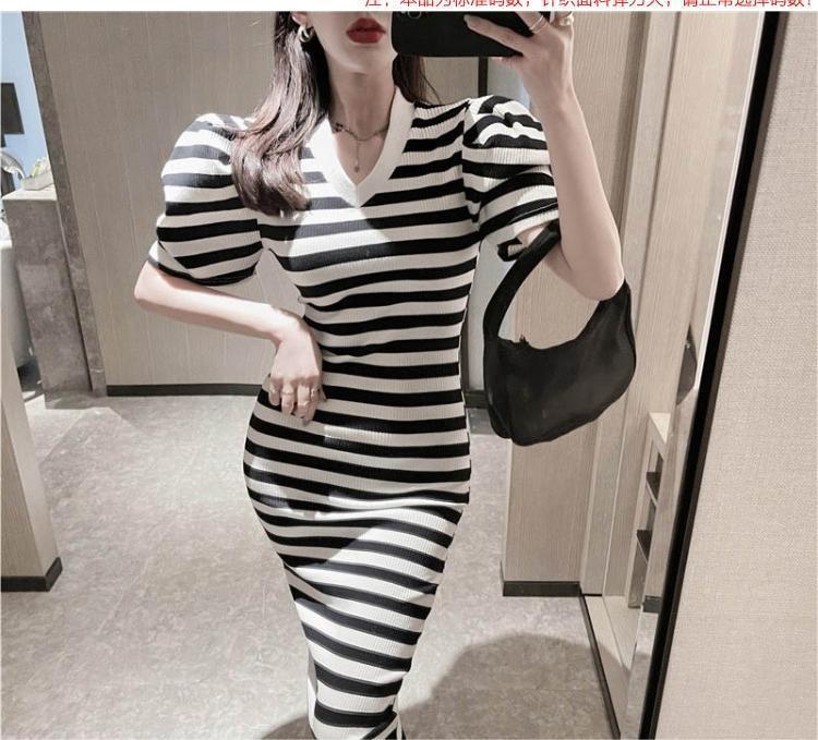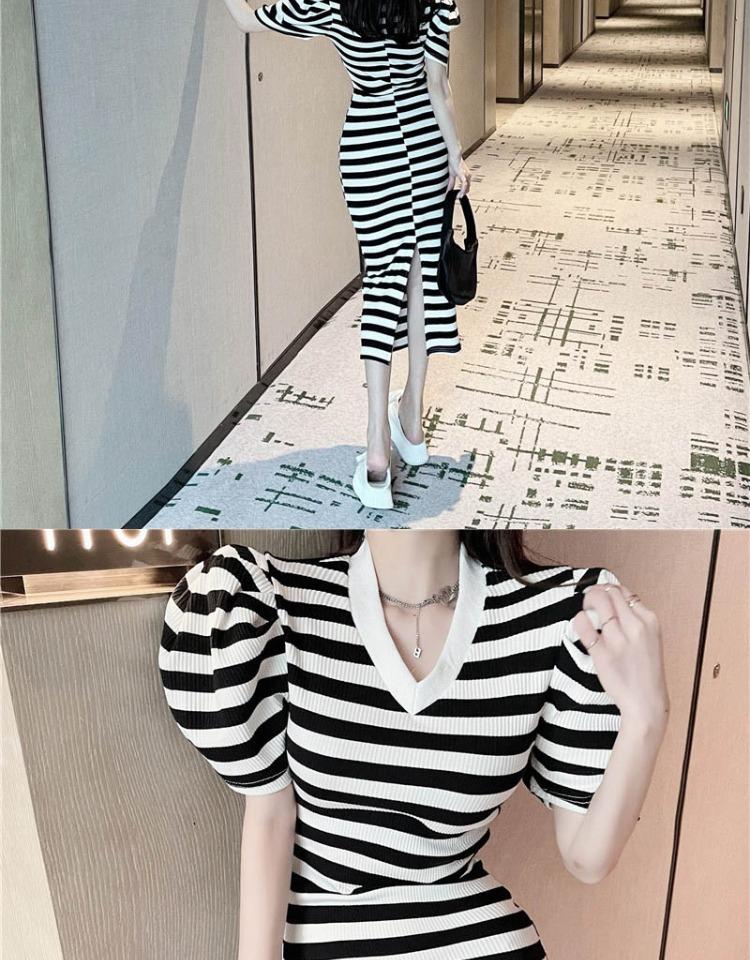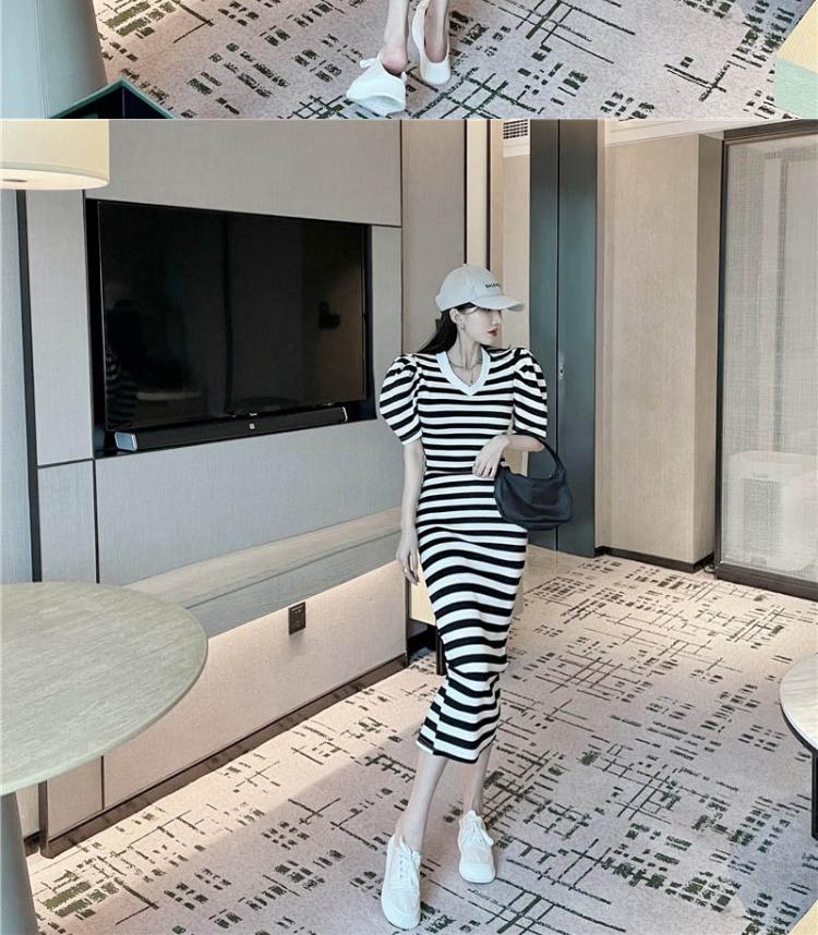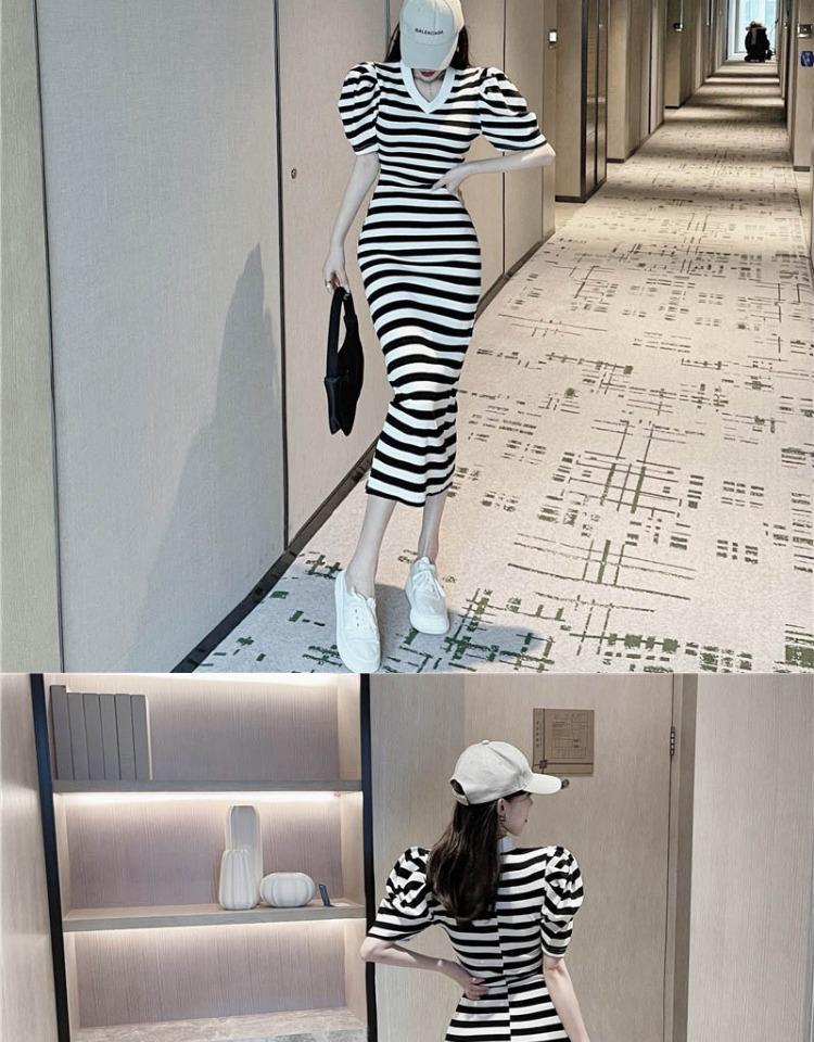 Vestido de Verano Manga Linterna Rayado Ajustado Camiseta Manga Corta Vestido de Mujer Largo Medio Hasta la Rodilla Vestido Super Largo Holgado Cuello en V