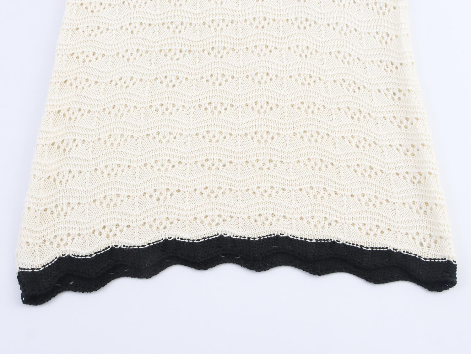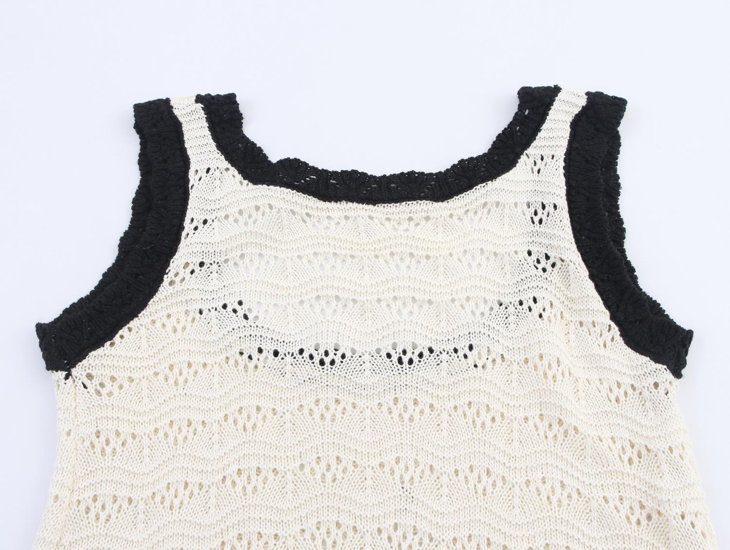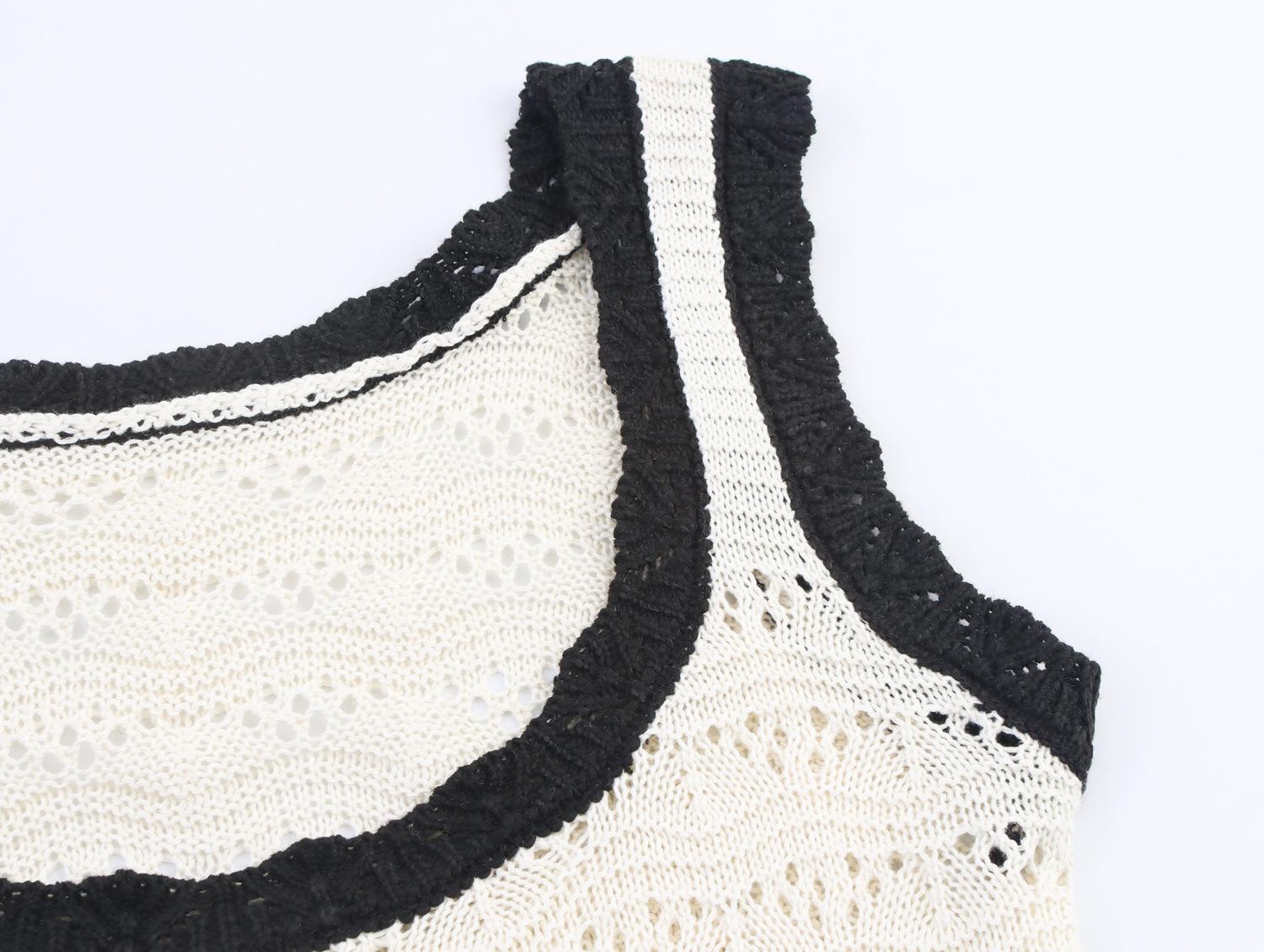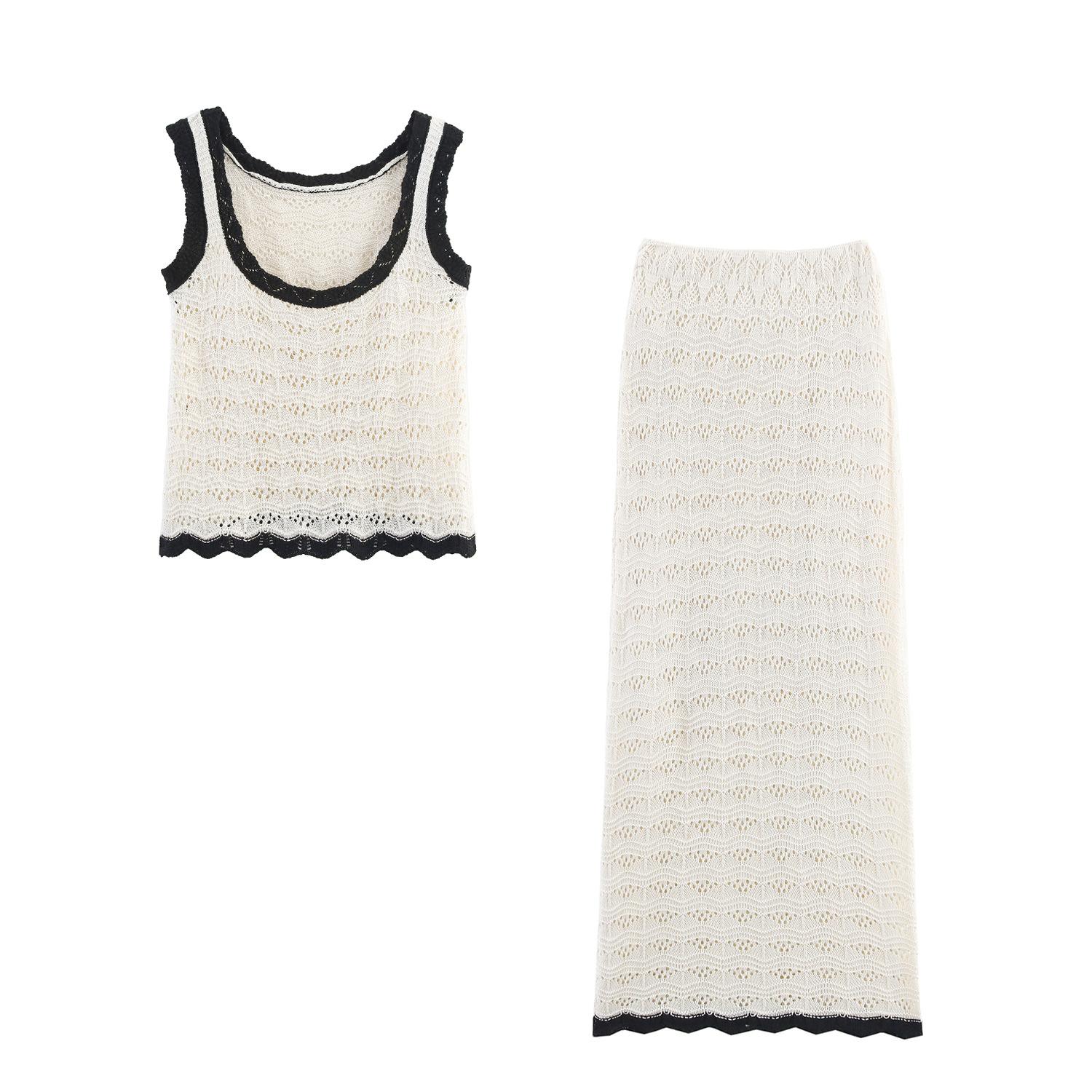 Ropa de Mujer al Por Mayor Transfronteriza Verano Nuevo Estilo Europeo y Americano Bloque de Color Tejido Calado Tirantes Espagueti + Set Falda Midi con Lazo en la Cintura