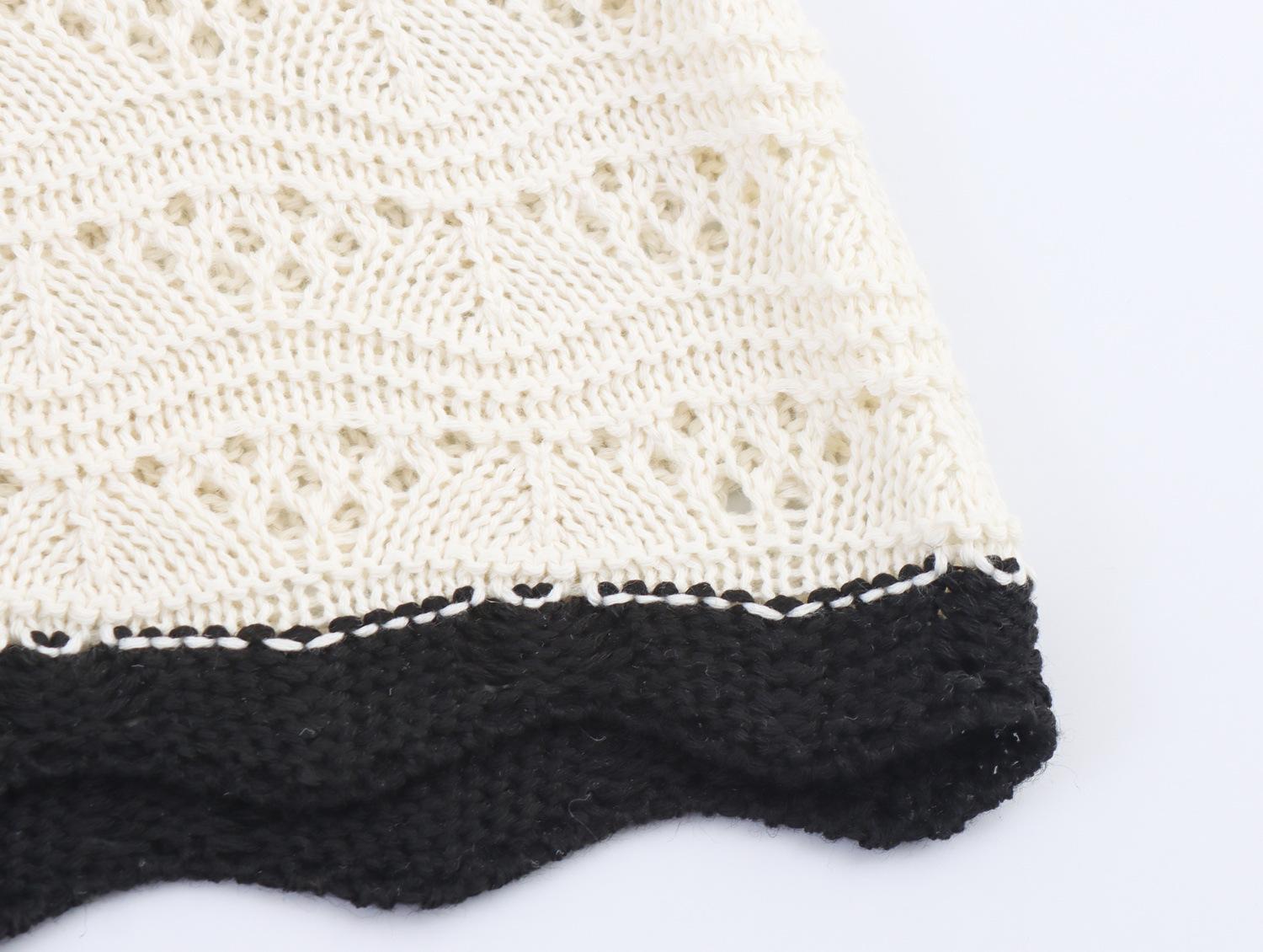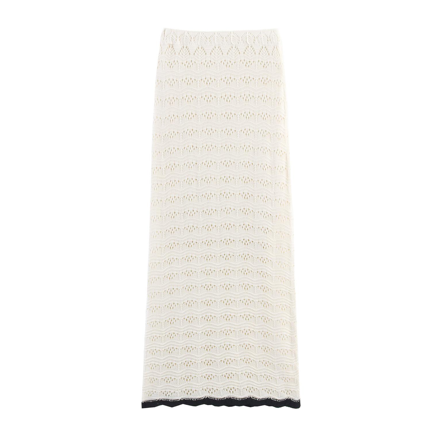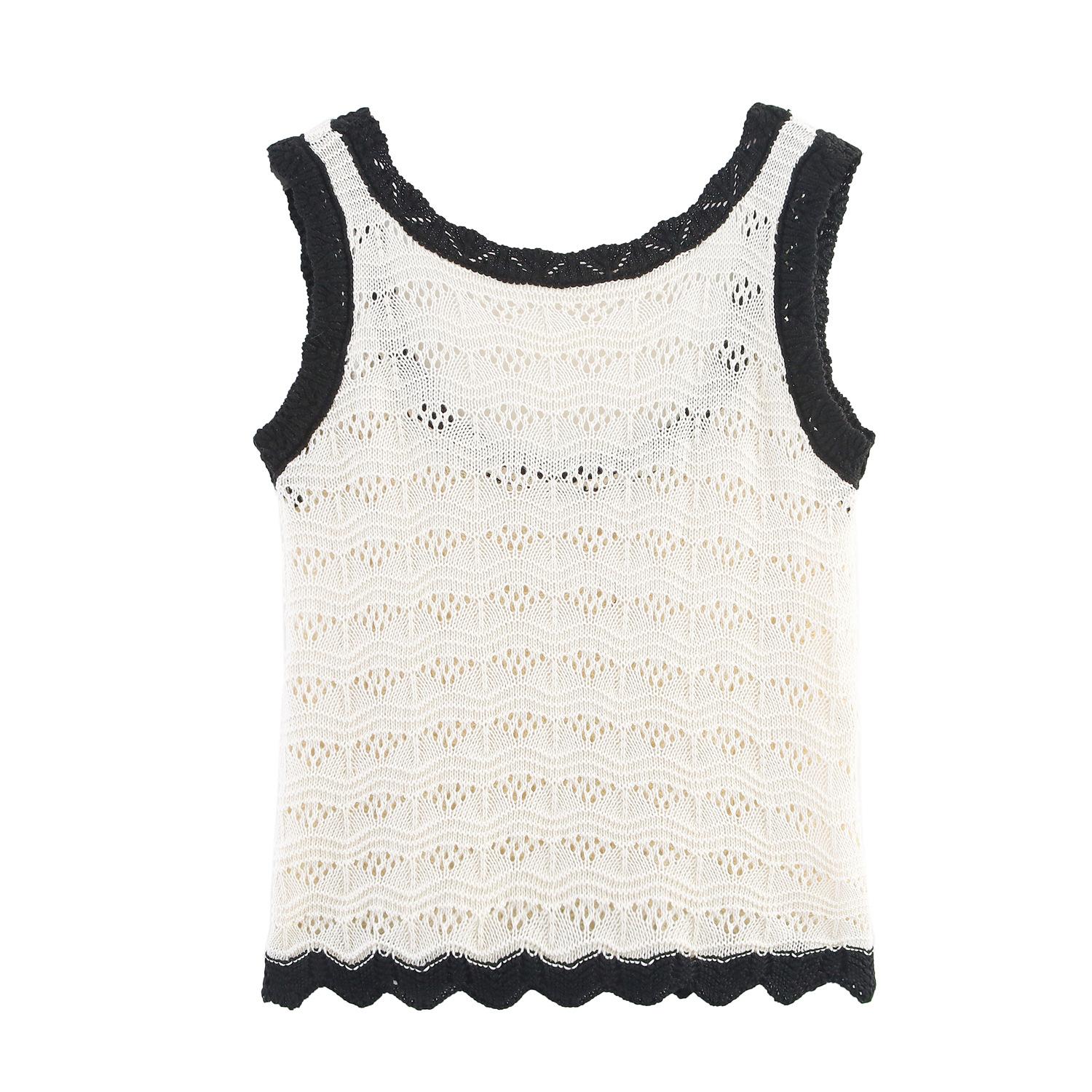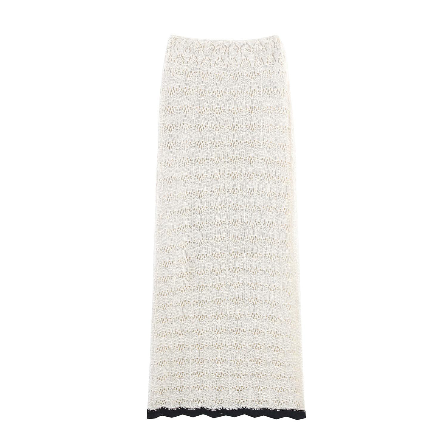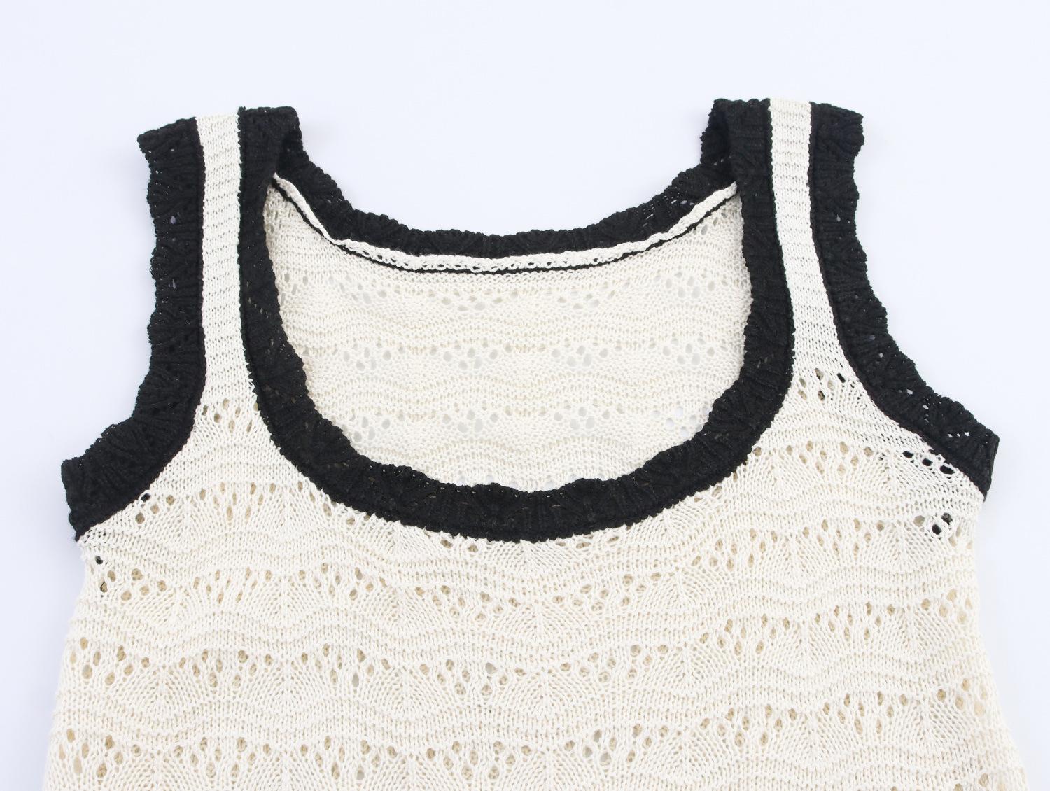 Ropa de Mujer al Por Mayor Transfronteriza Verano Nuevo Estilo Europeo y Americano Bloque de Color Tejido Calado Tirantes Espagueti + Set Falda Midi con Lazo en la Cintura