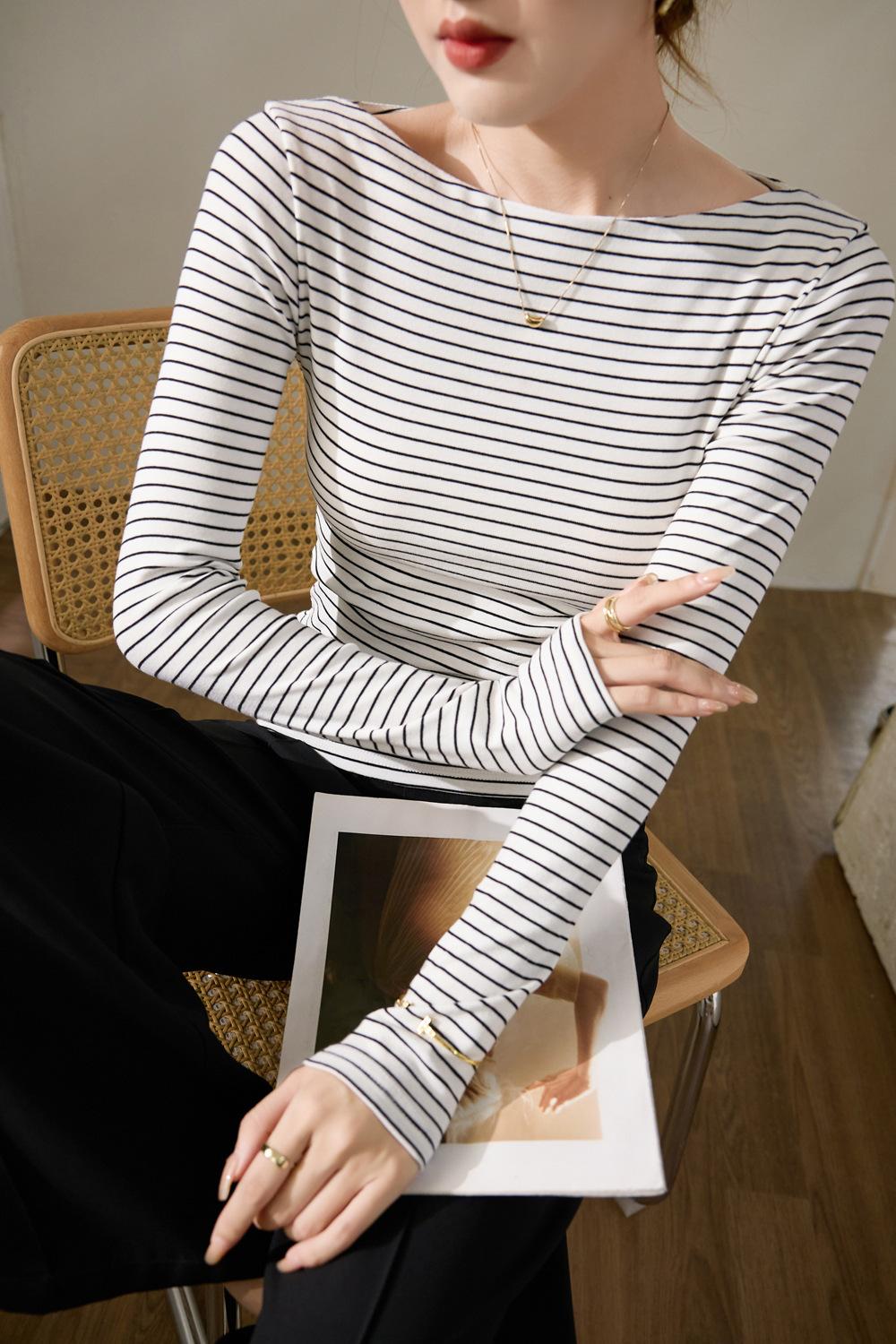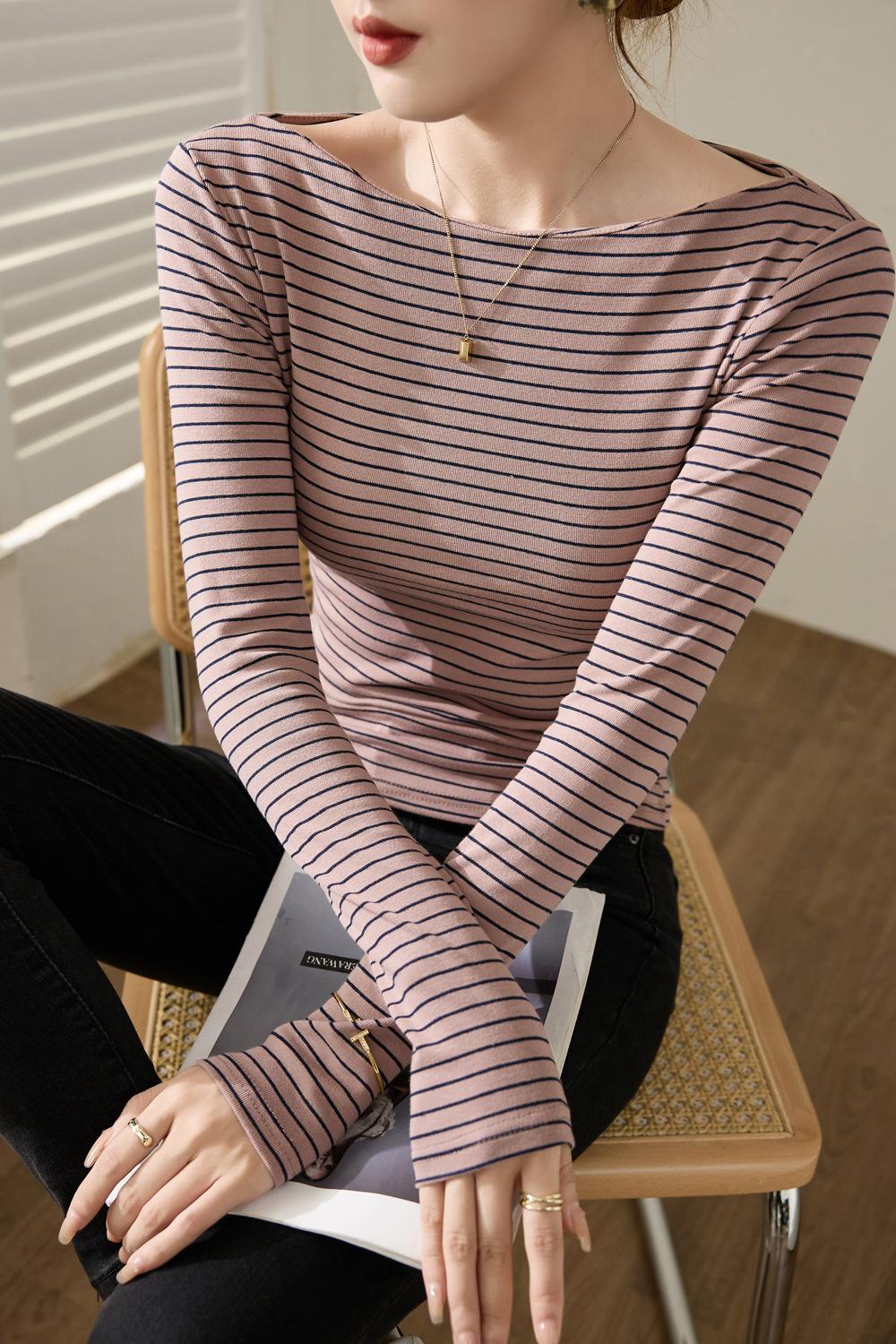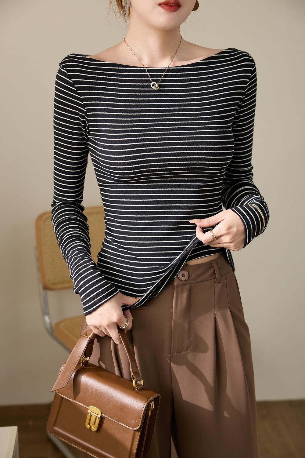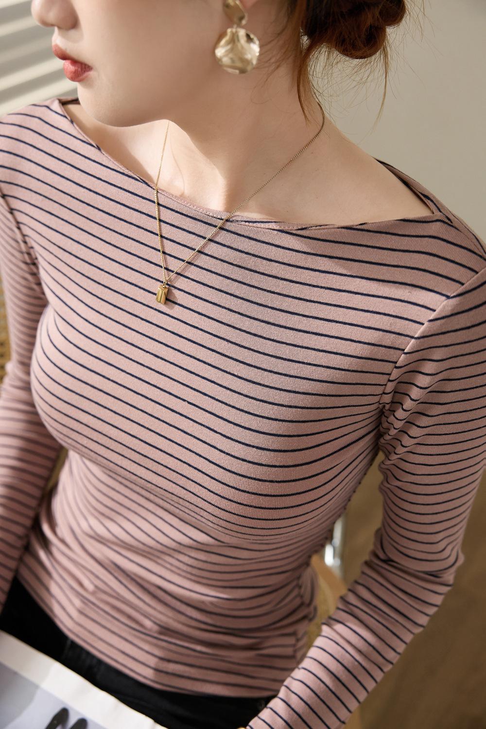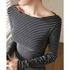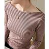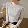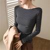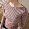 Playera retro de alta gama de un hombro a rayas para mujer de manga larga nueva para otoño e invierno 2025, camiseta básica de algodón puro de corte ajustado A5443