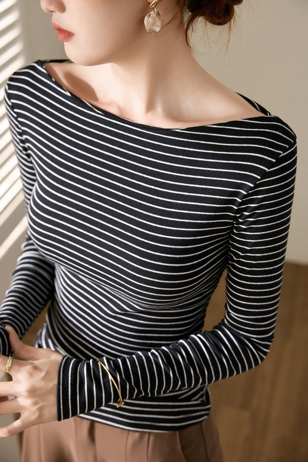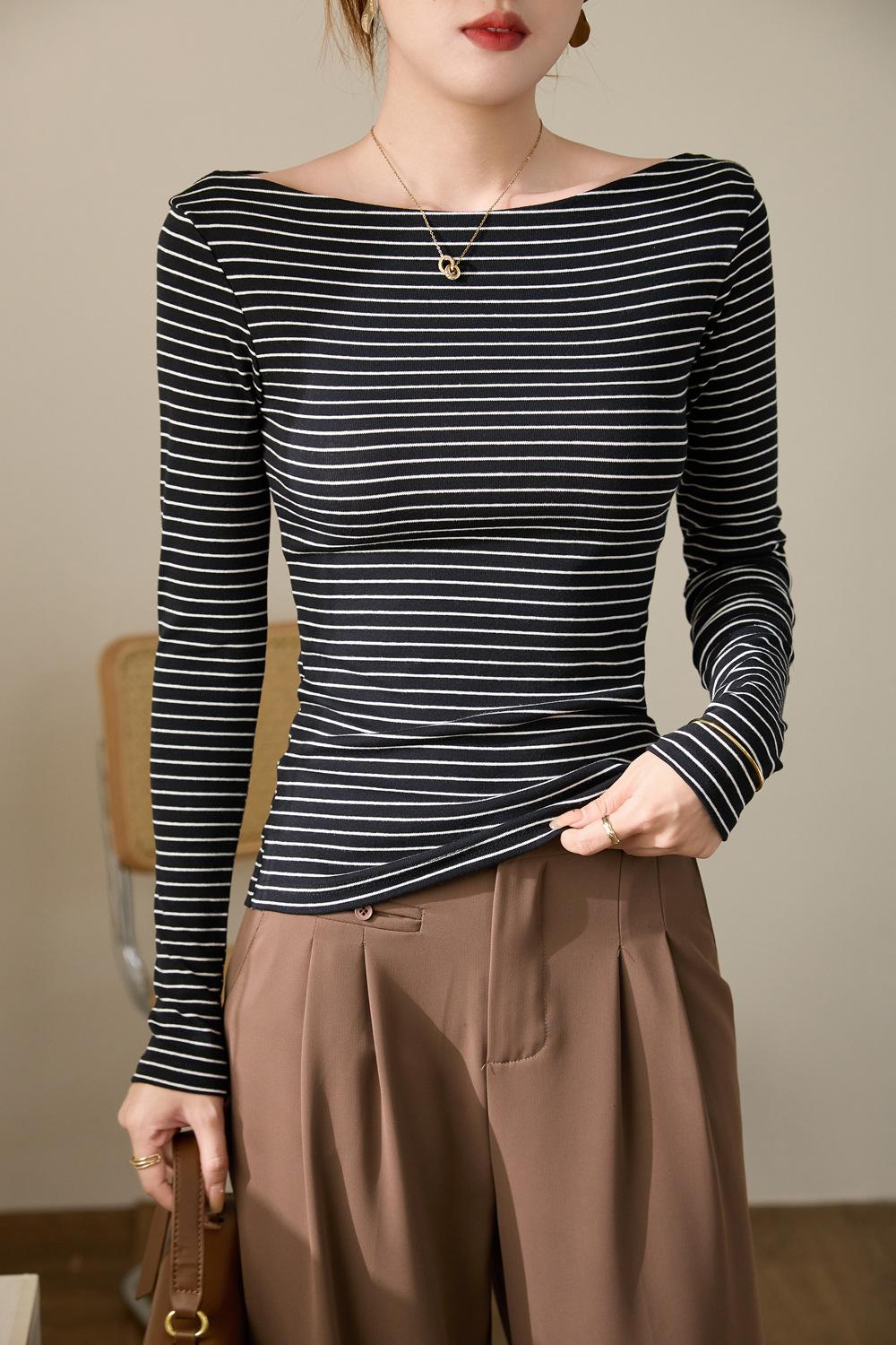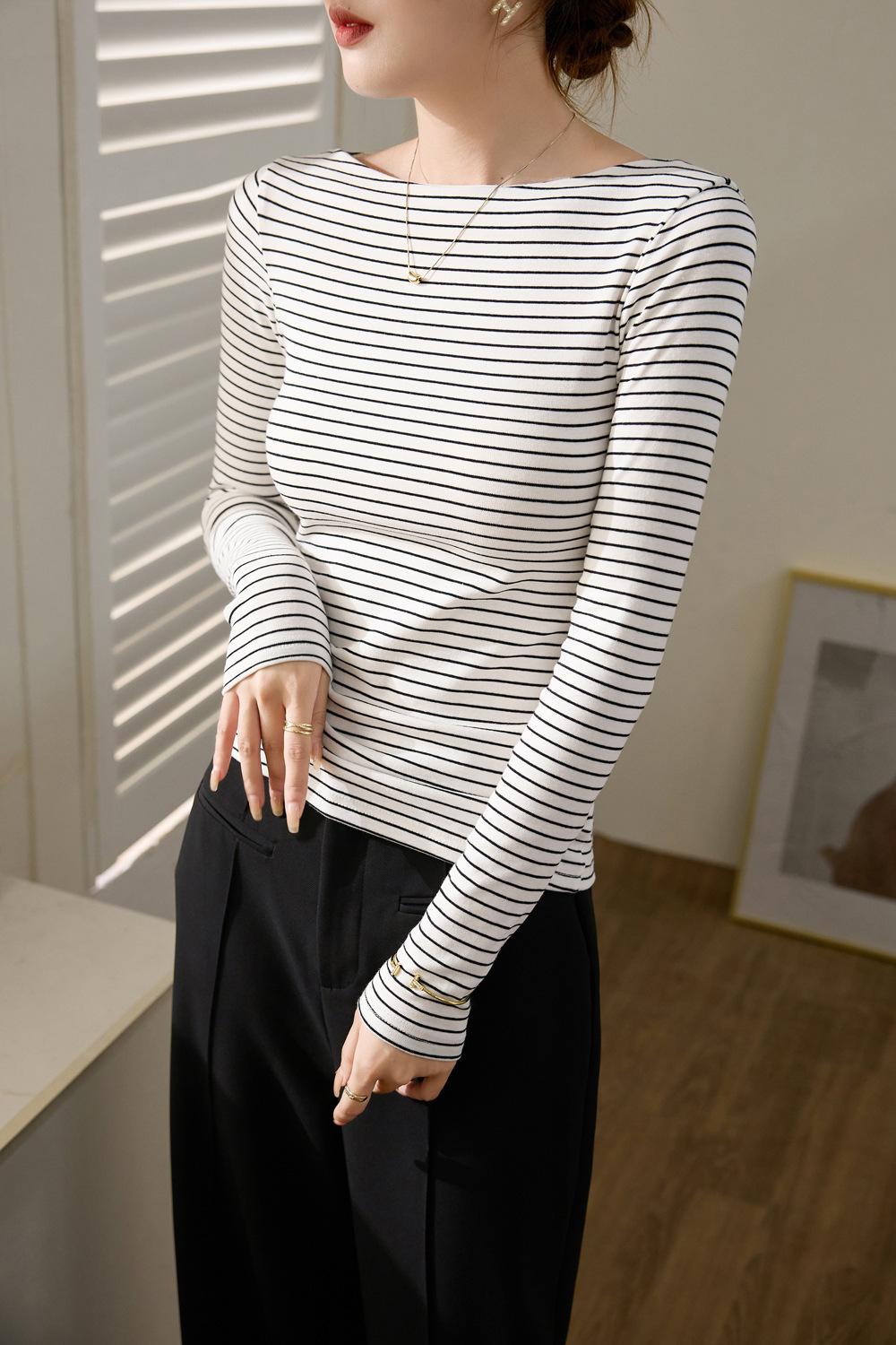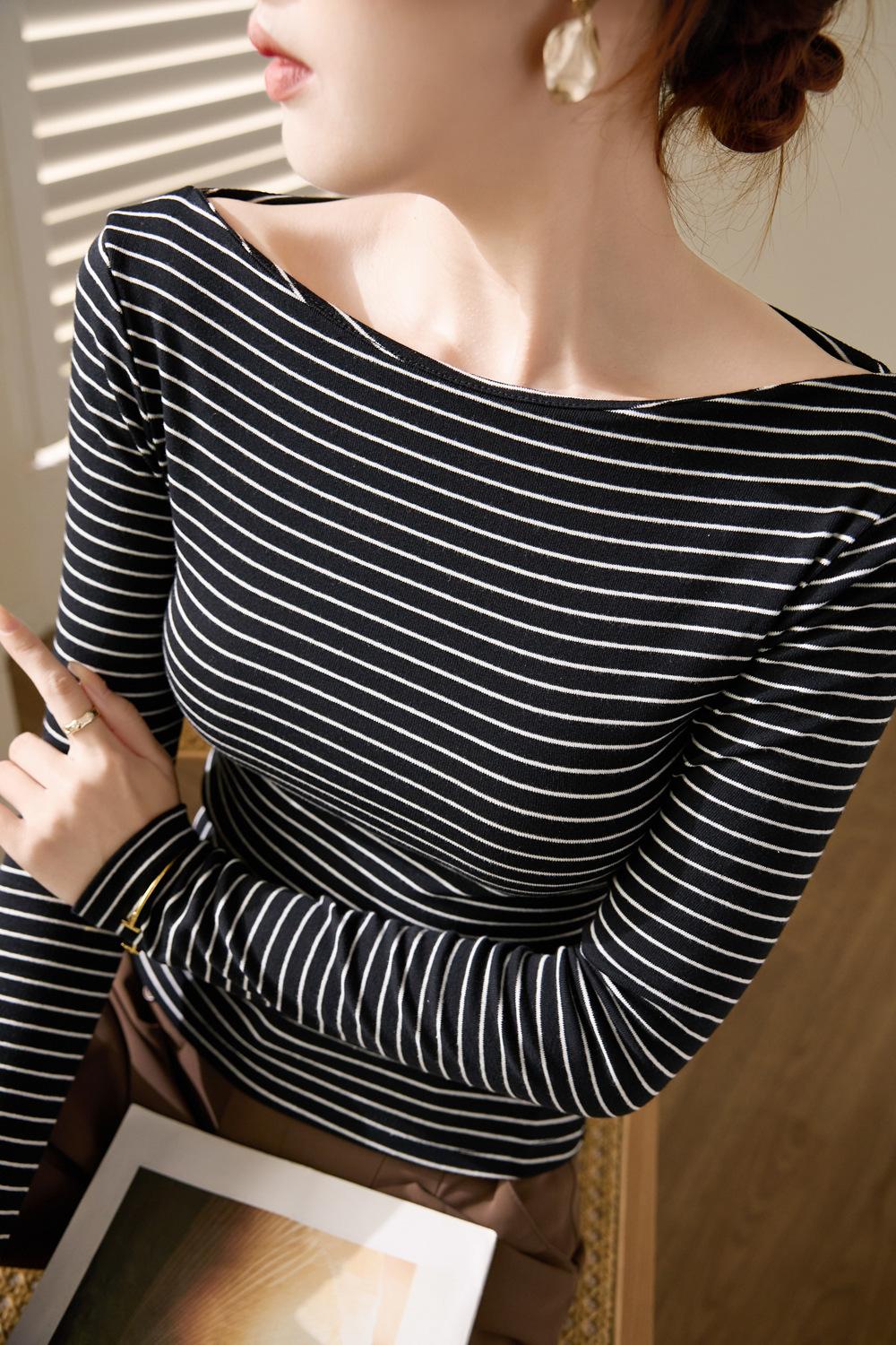 Playera retro de alta gama de un hombro a rayas para mujer de manga larga nueva para otoño e invierno 2025, camiseta básica de algodón puro de corte ajustado A5443