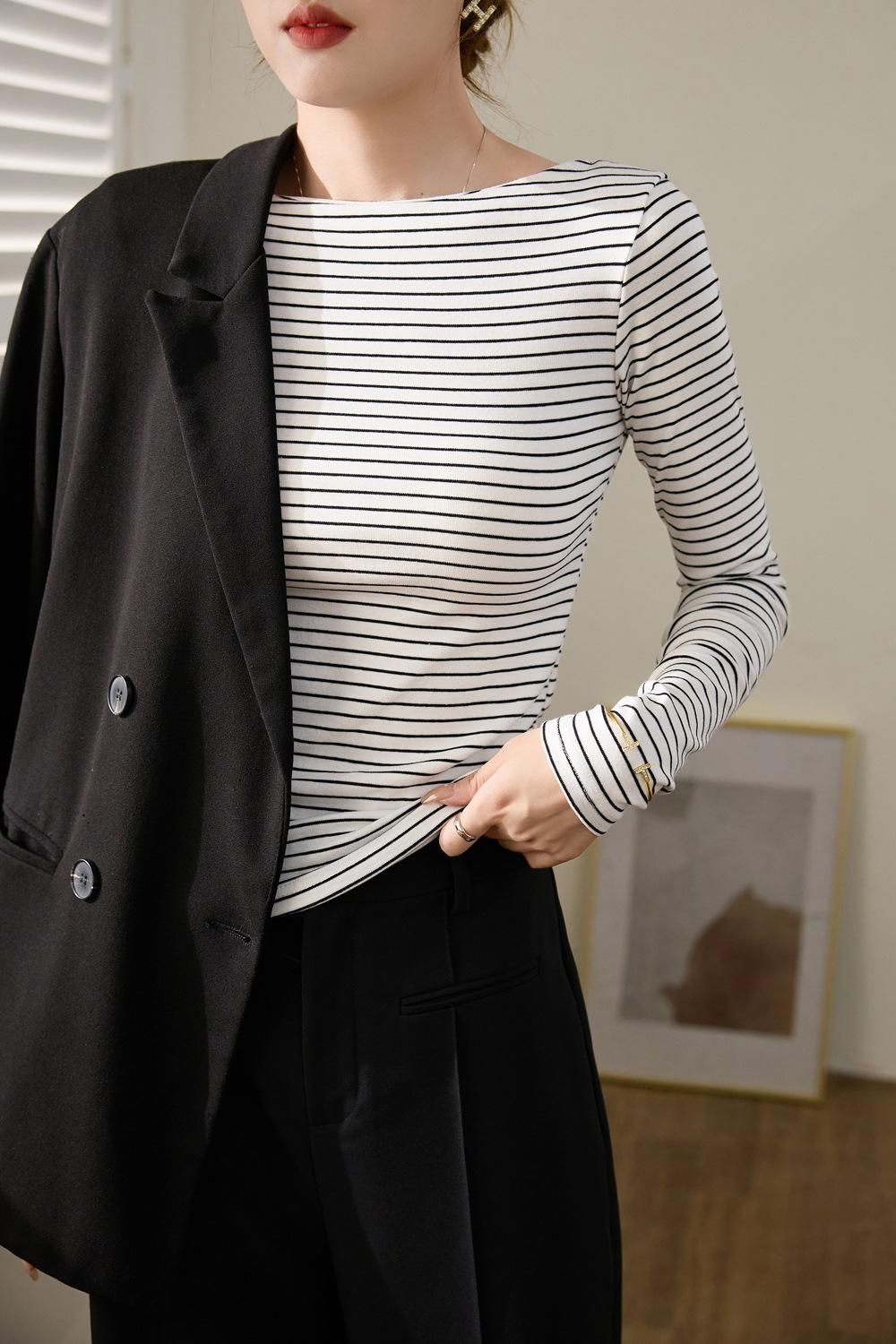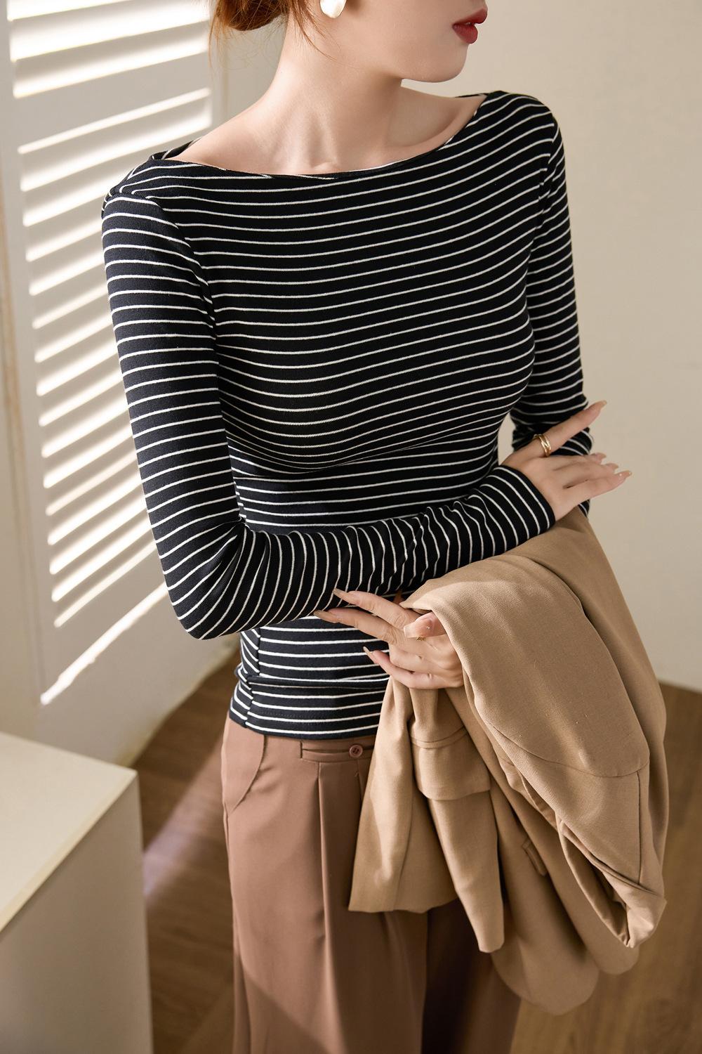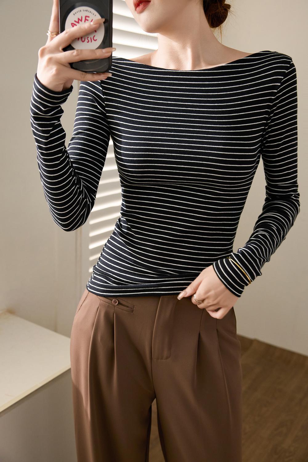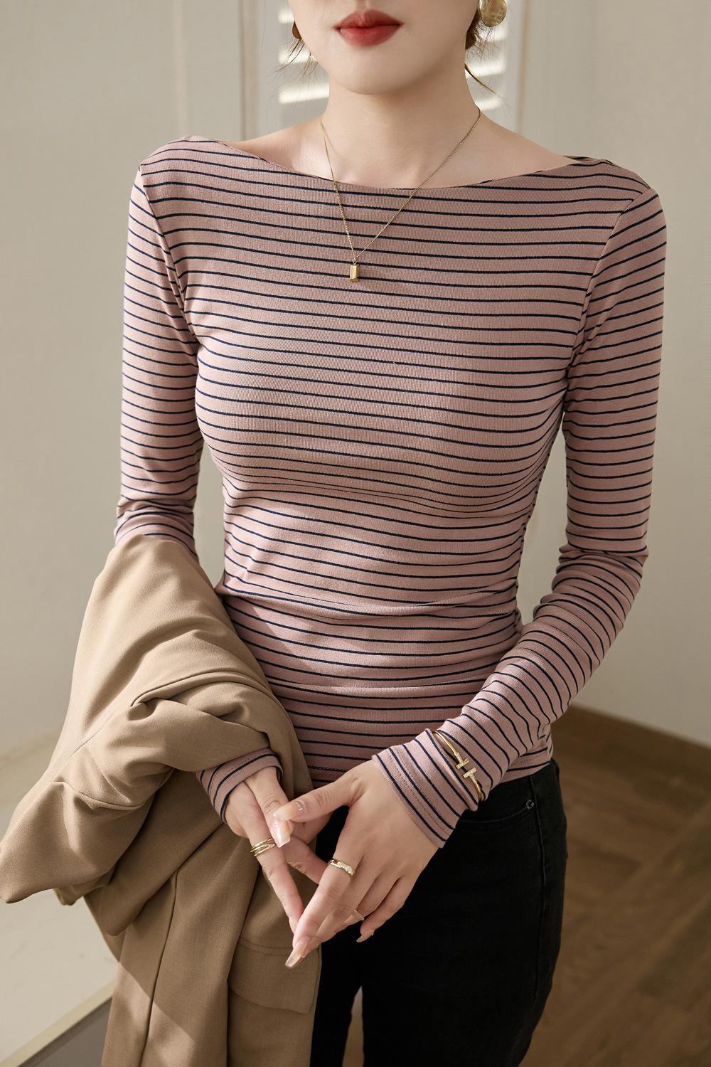 Playera retro de alta gama de un hombro a rayas para mujer de manga larga nueva para otoño e invierno 2025, camiseta básica de algodón puro de corte ajustado A5443
