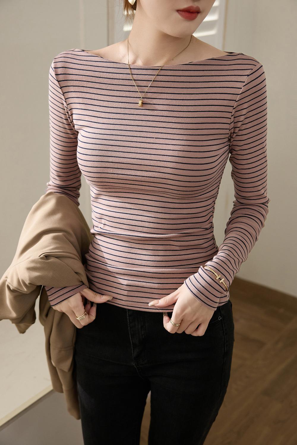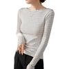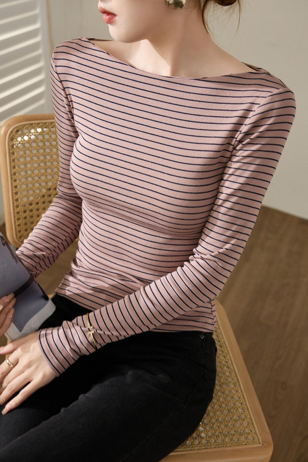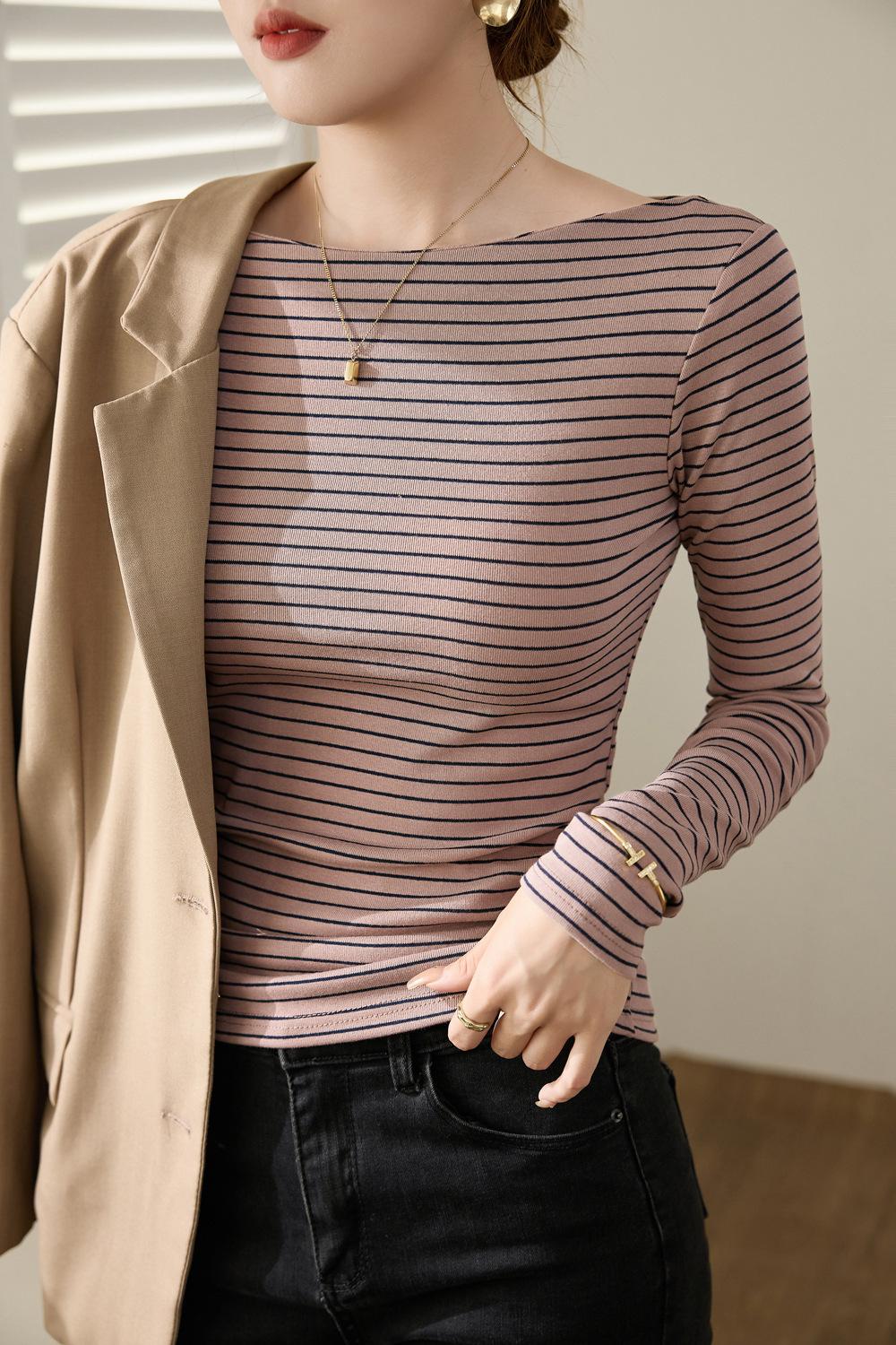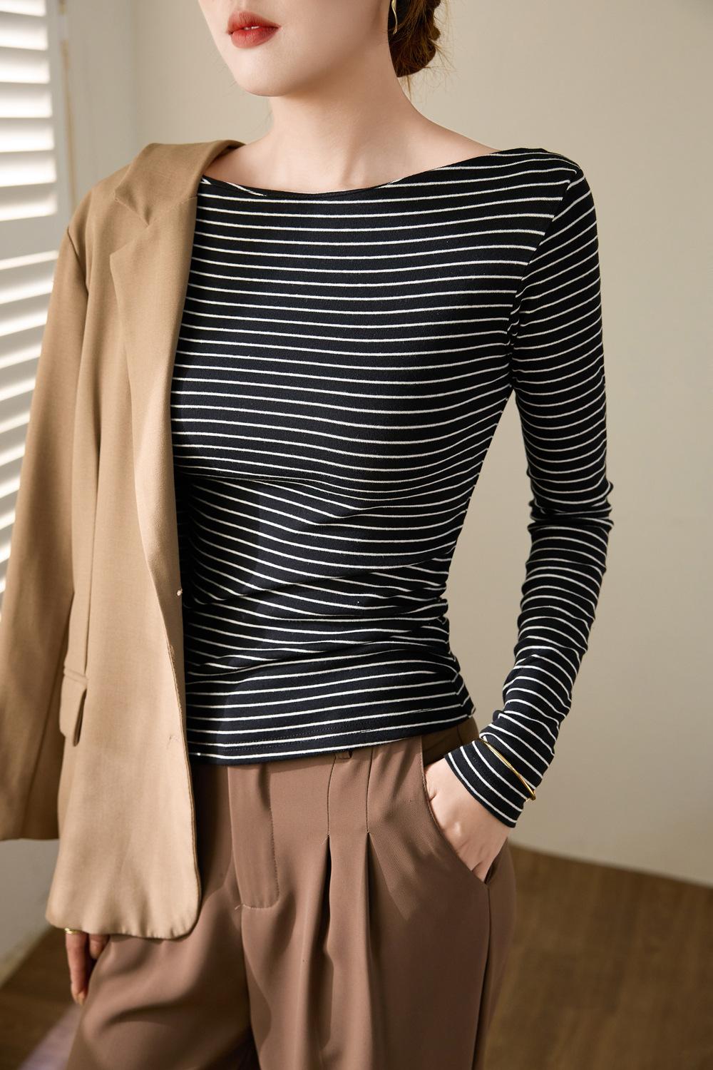 Playera retro de alta gama de un hombro a rayas para mujer de manga larga nueva para otoño e invierno 2025, camiseta básica de algodón puro de corte ajustado A5443