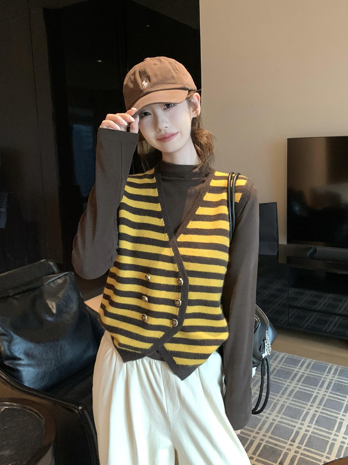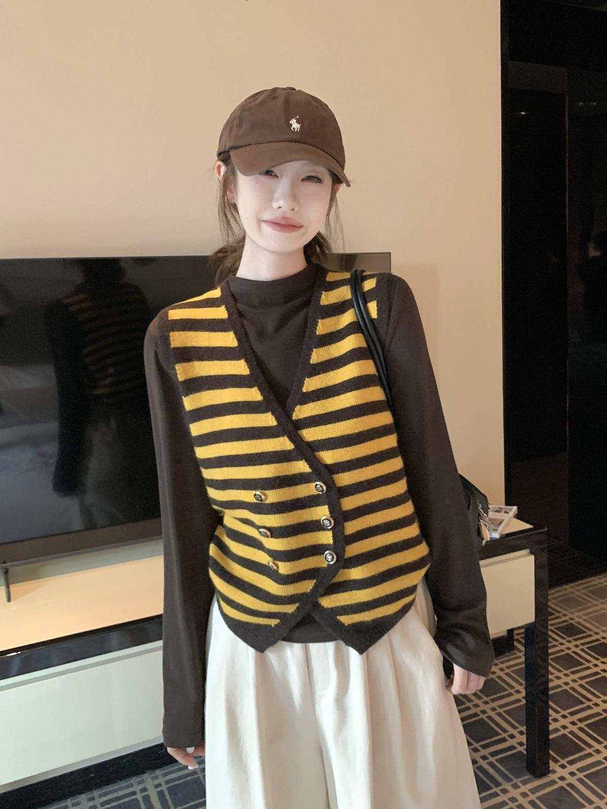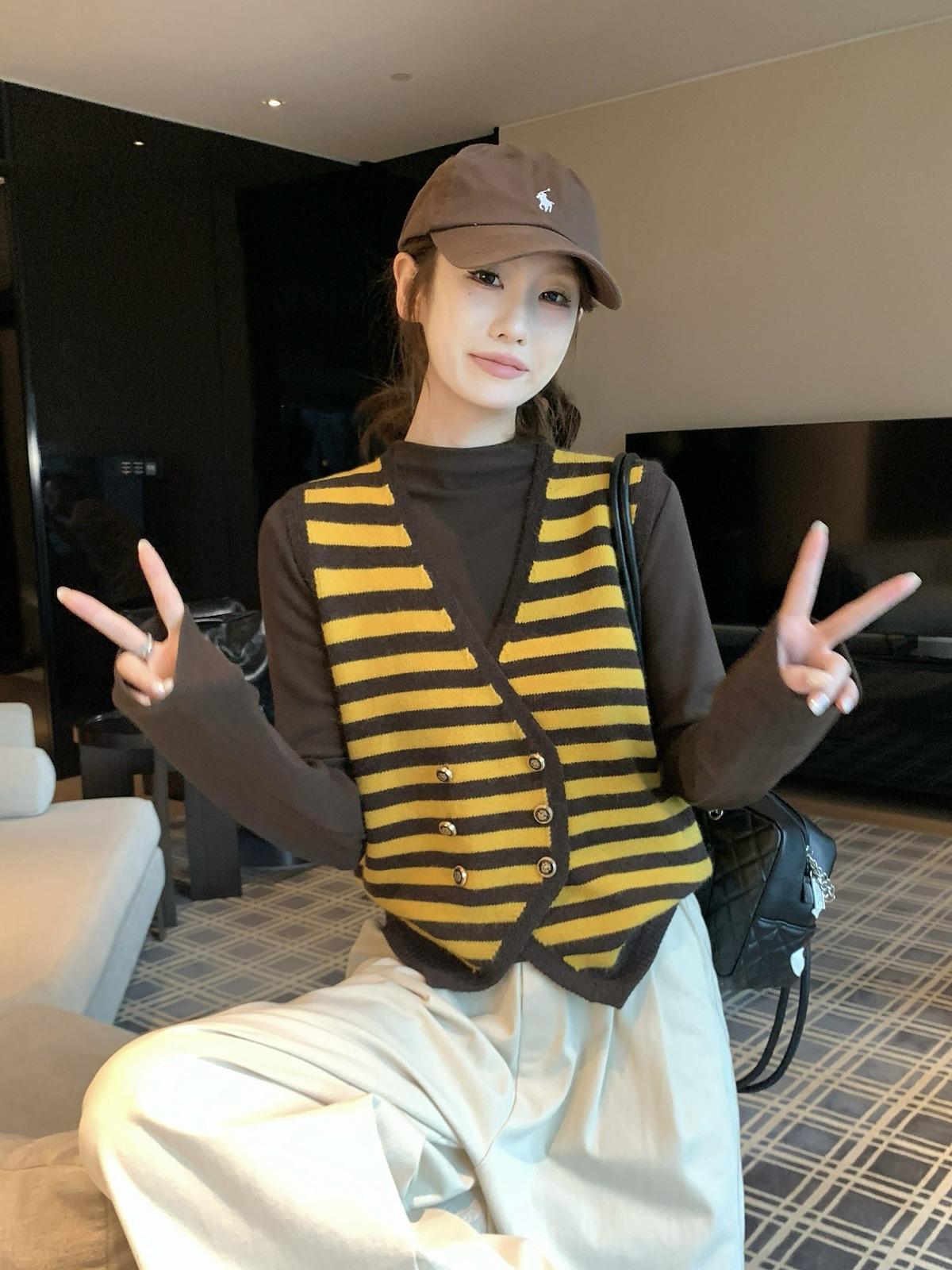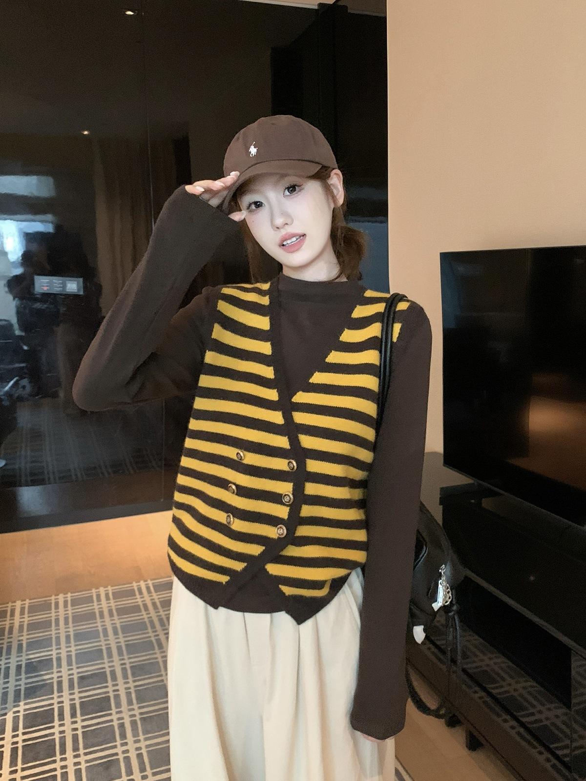 Chaleco de Punto a Rayas con Bloque de Color Cuello en V Manga Larga Cuello Redondo Capa Base Conjunto de Dos Piezas Top para Mujer Moda Conjunto Versátil Otoño