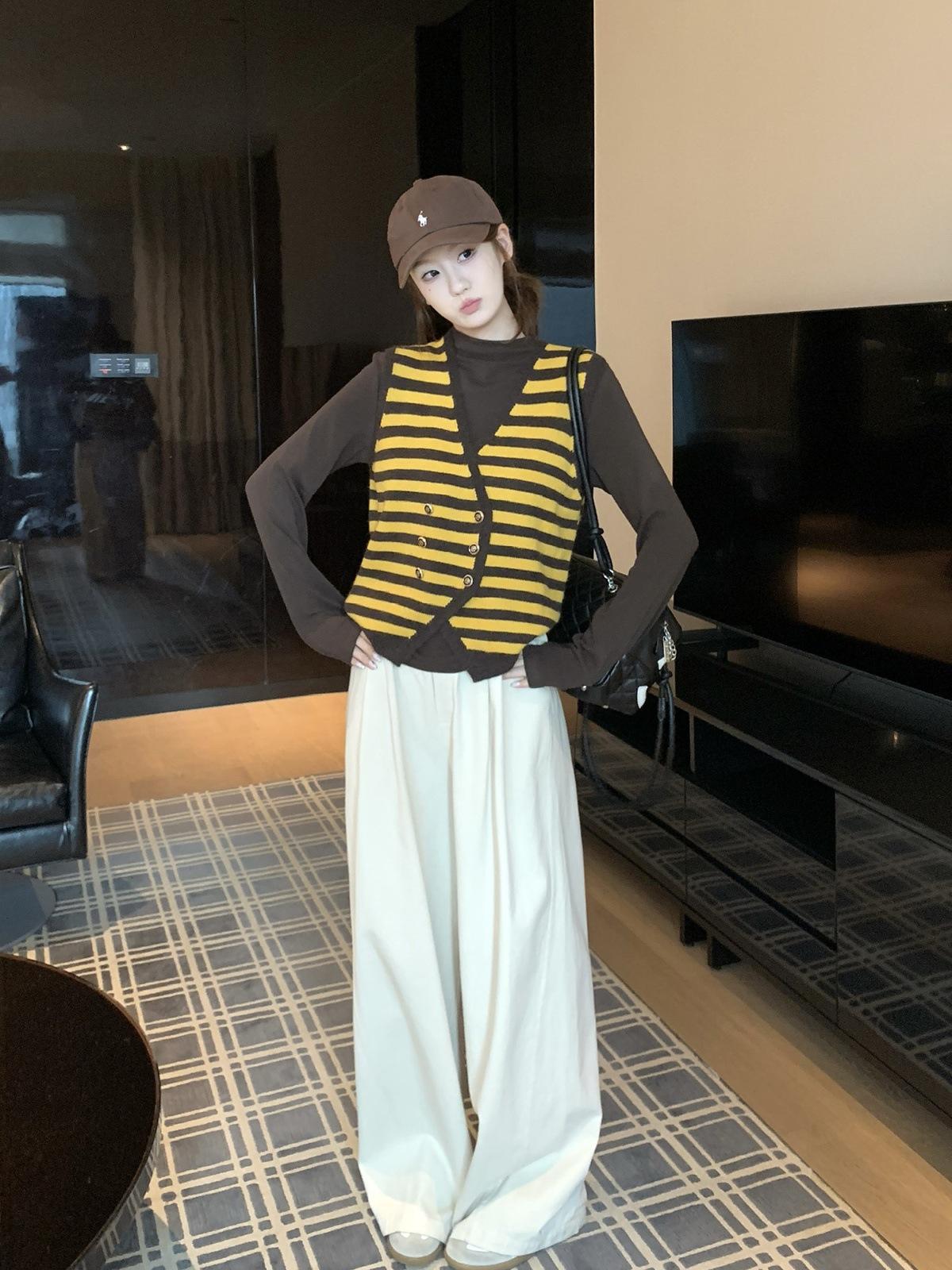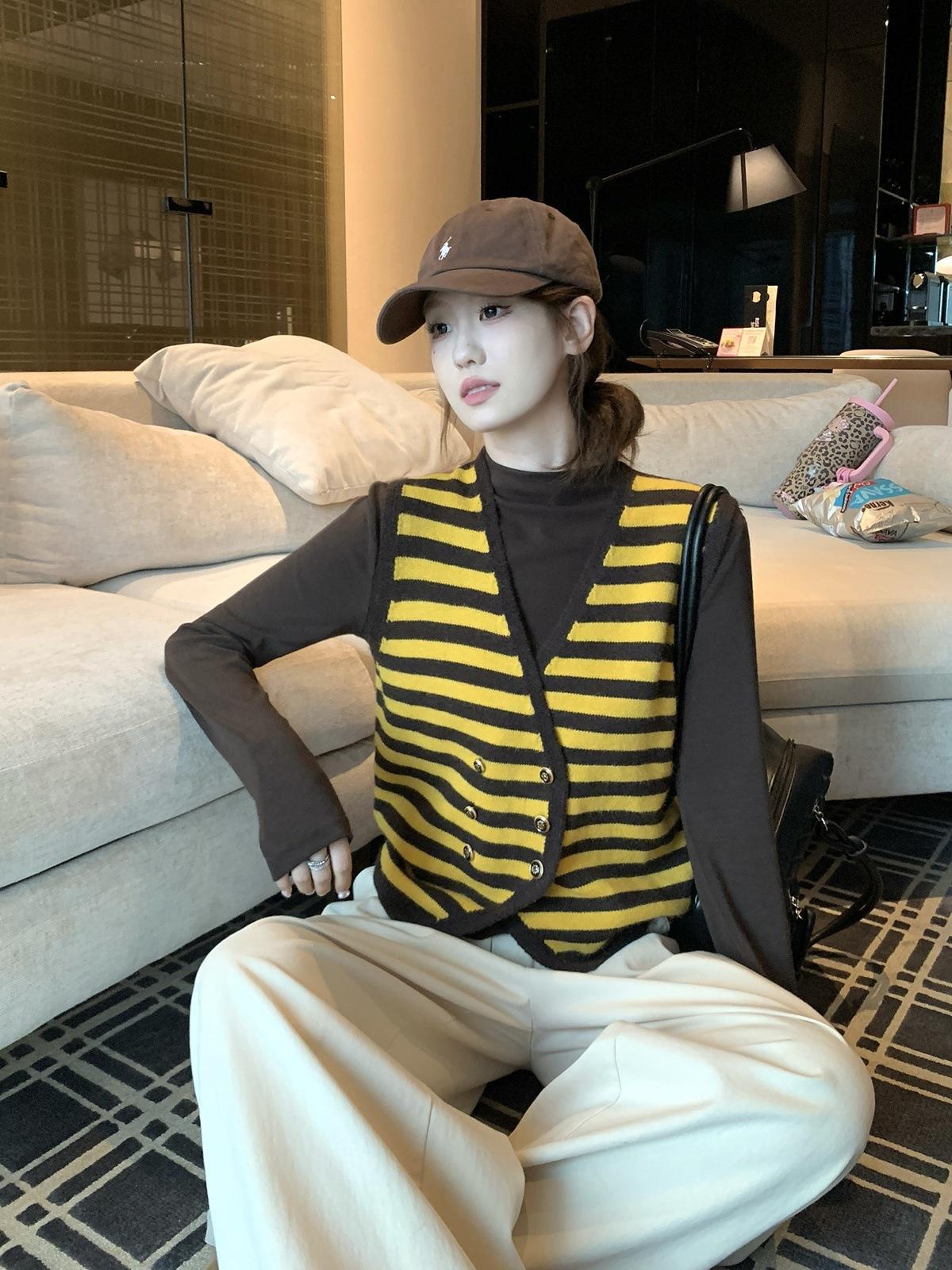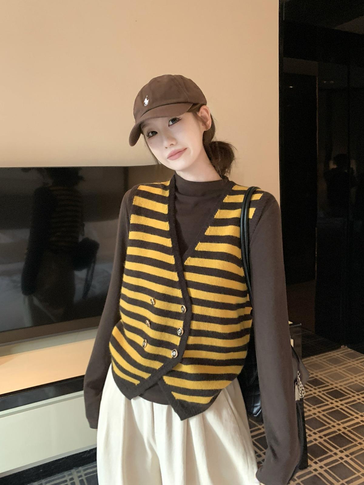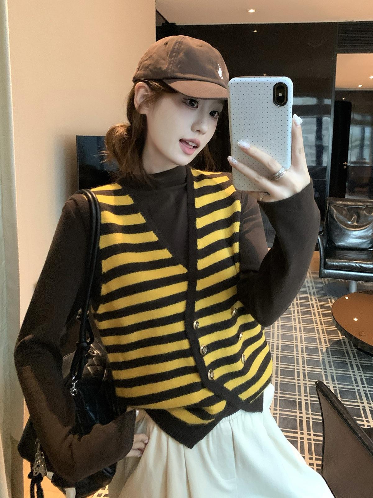 Chaleco de Punto a Rayas con Bloque de Color Cuello en V Manga Larga Cuello Redondo Capa Base Conjunto de Dos Piezas Top para Mujer Moda Conjunto Versátil Otoño