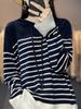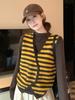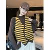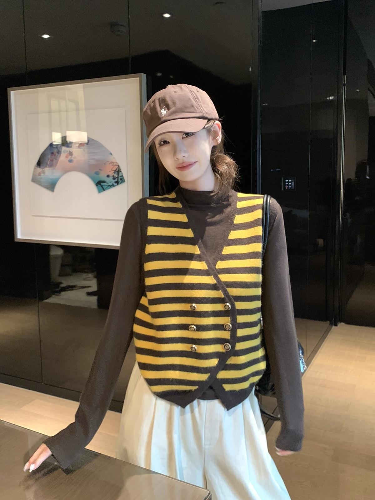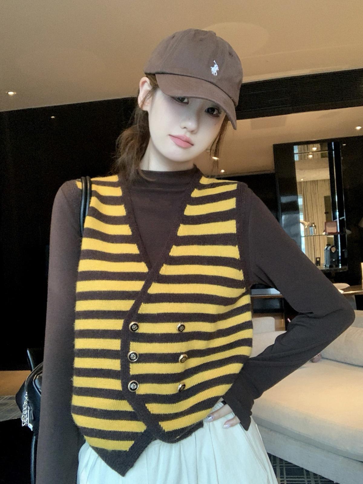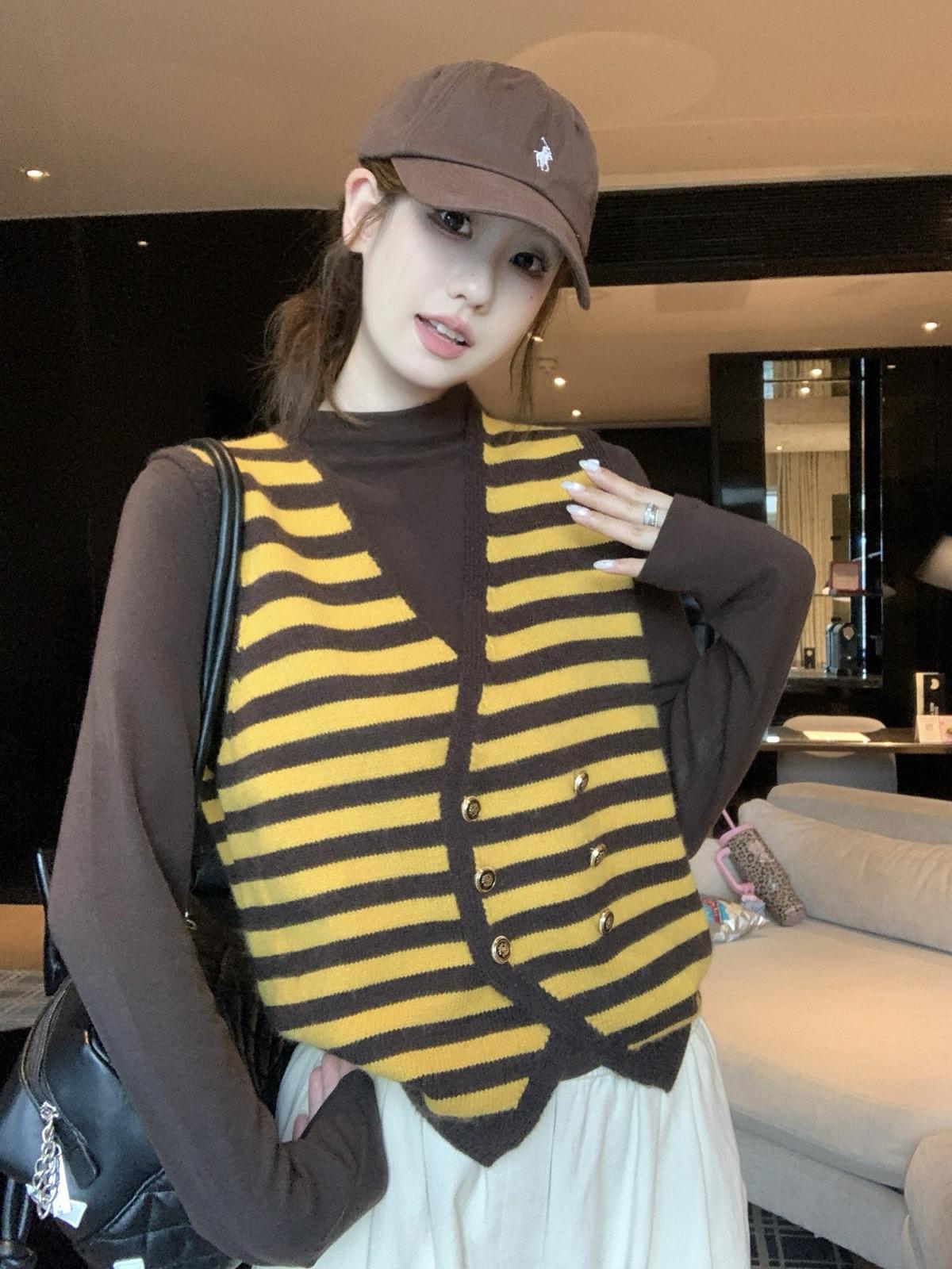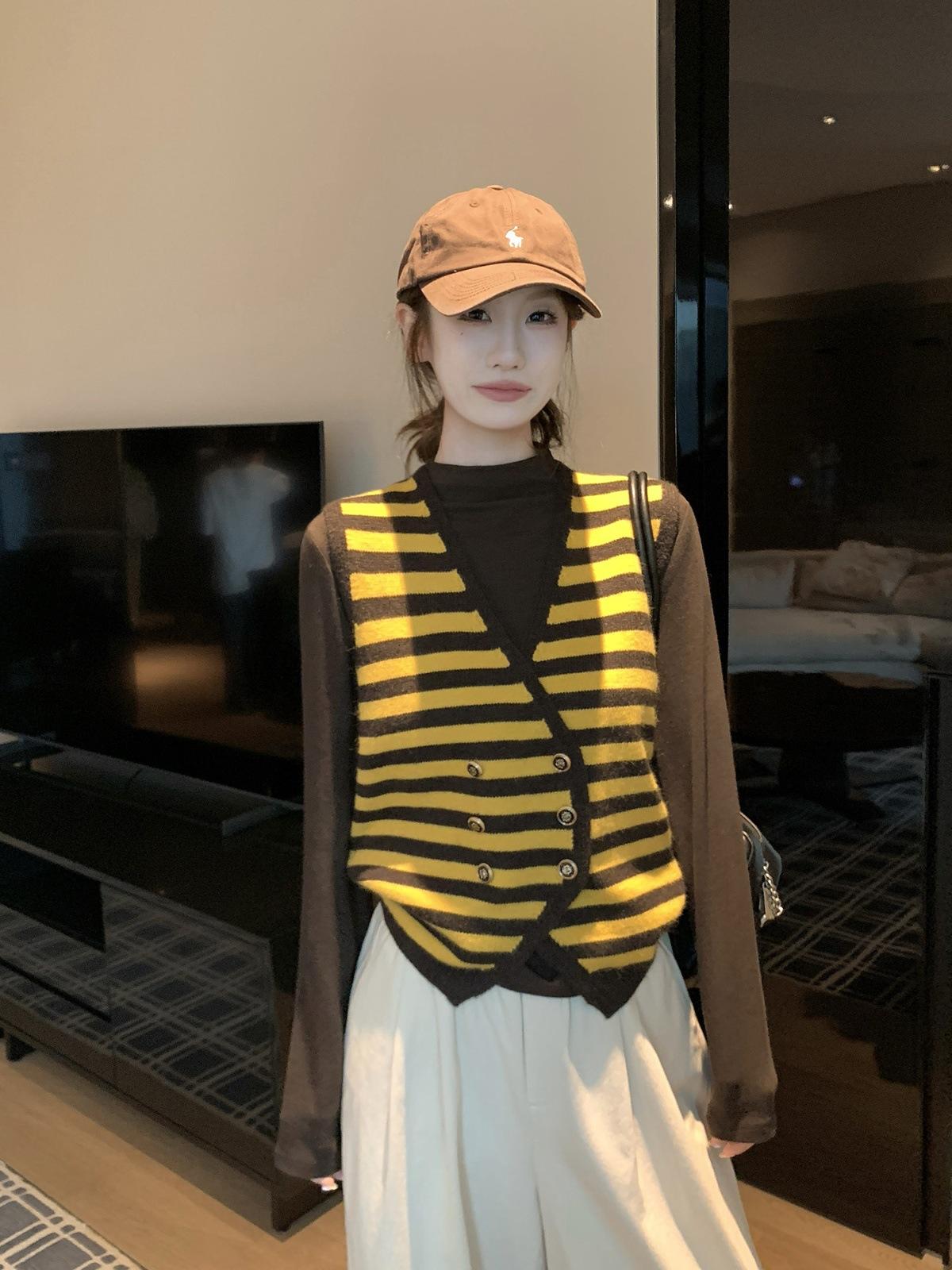 Chaleco de Punto a Rayas con Bloque de Color Cuello en V Manga Larga Cuello Redondo Capa Base Conjunto de Dos Piezas Top para Mujer Moda Conjunto Versátil Otoño