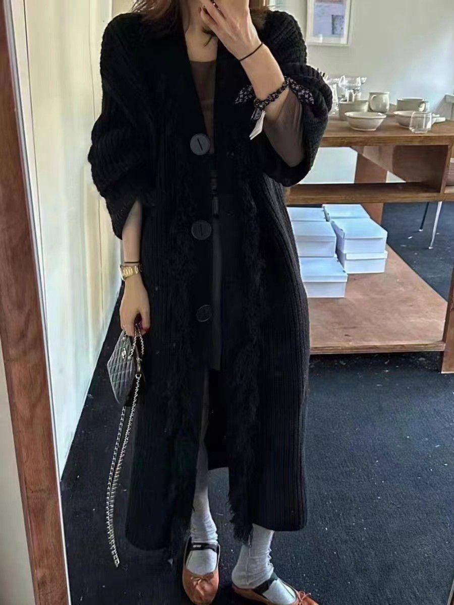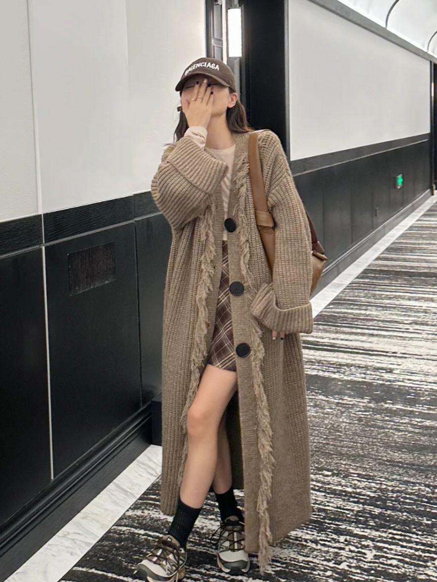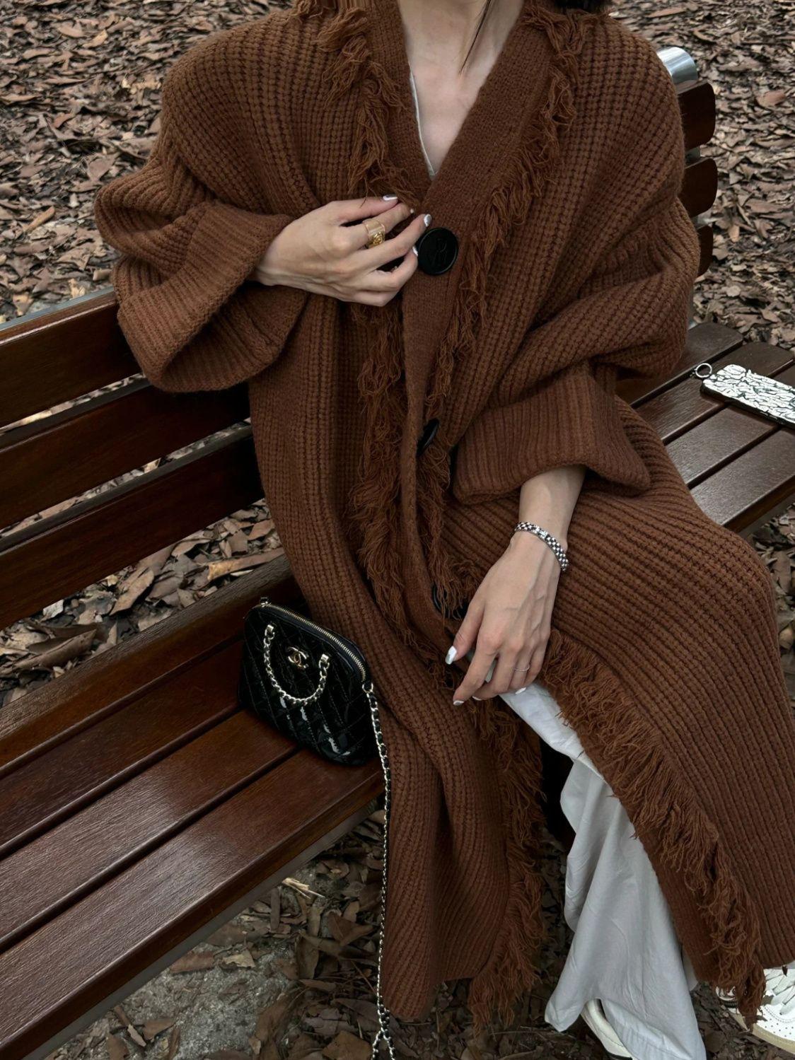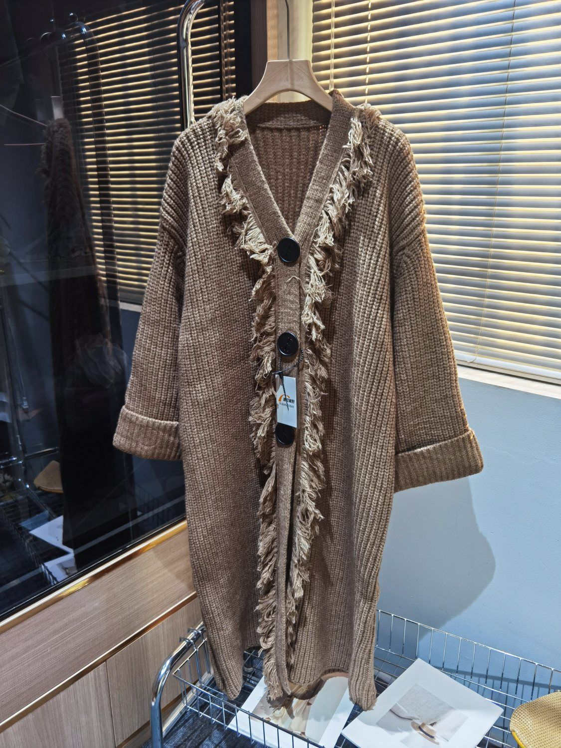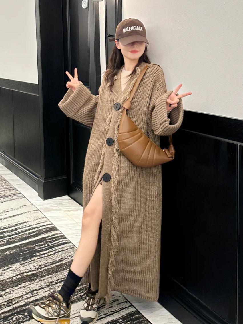 Sentido del diseño nuevo producto adelgazante borla suéter grande cortavientos abrigo engrosado estilo holgado perezoso cárdigan largo de punto invierno