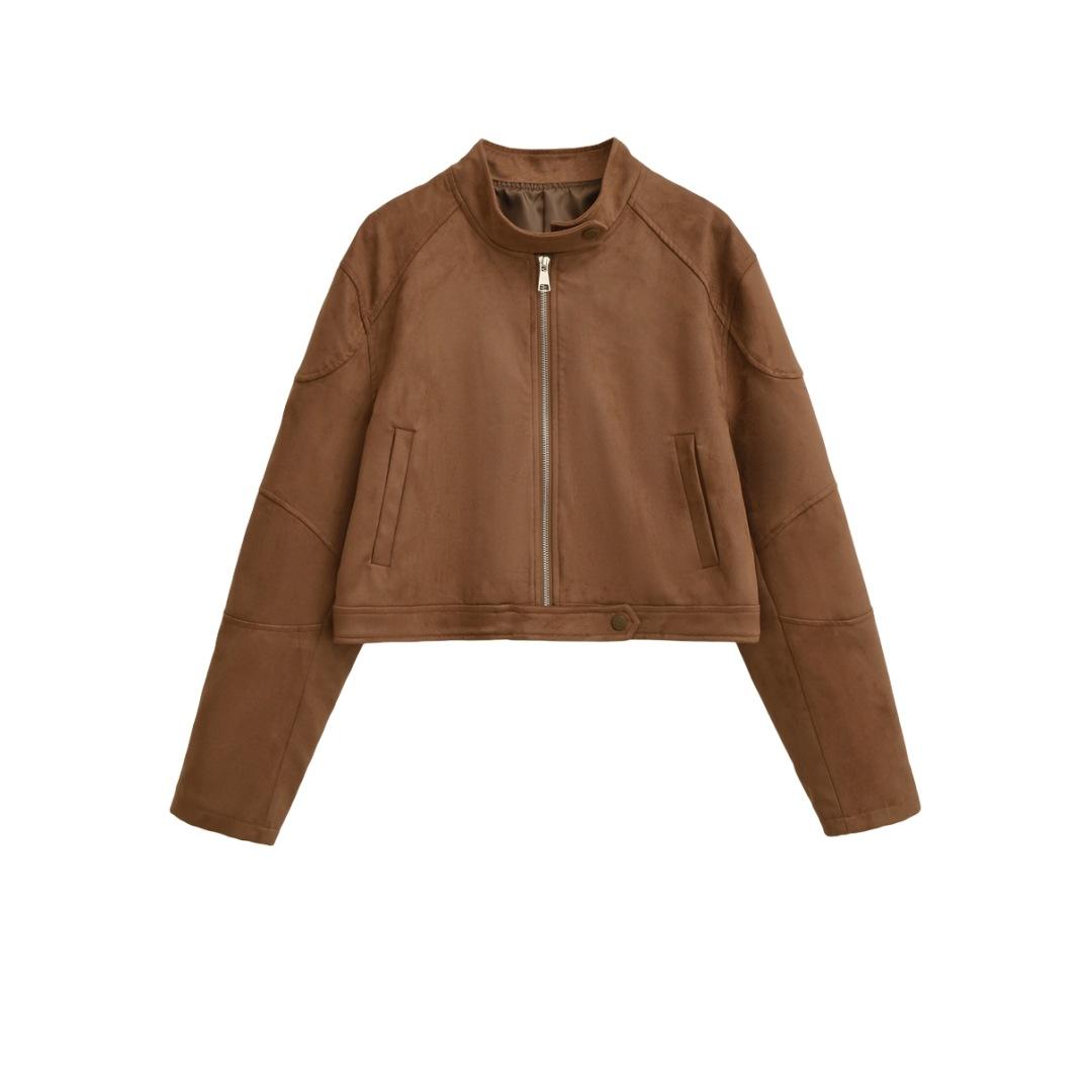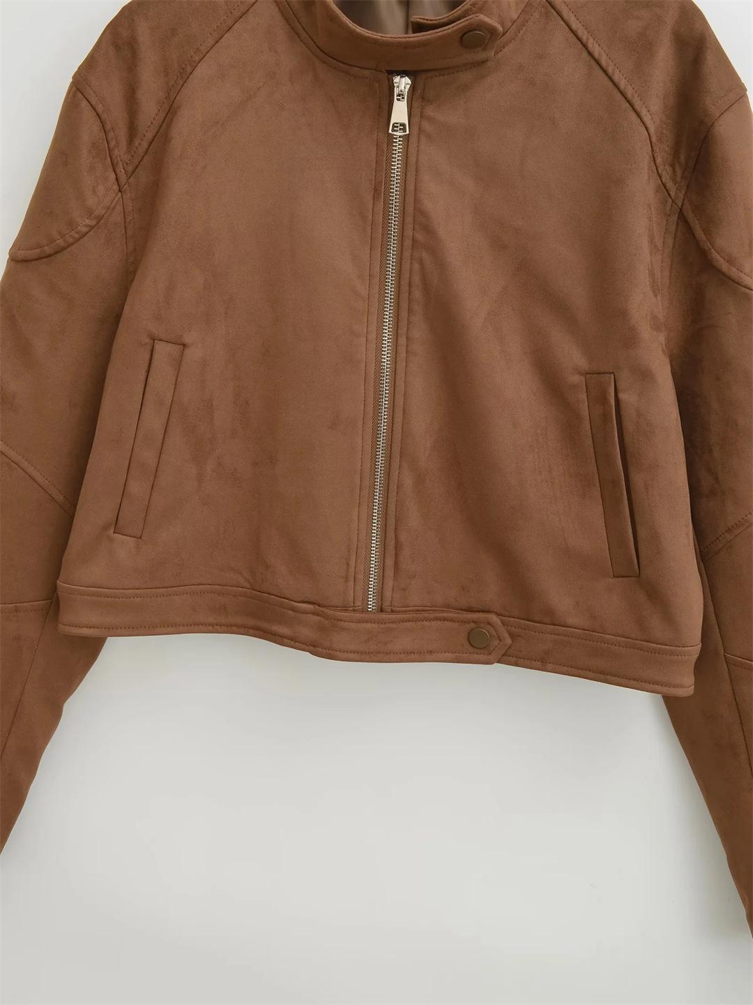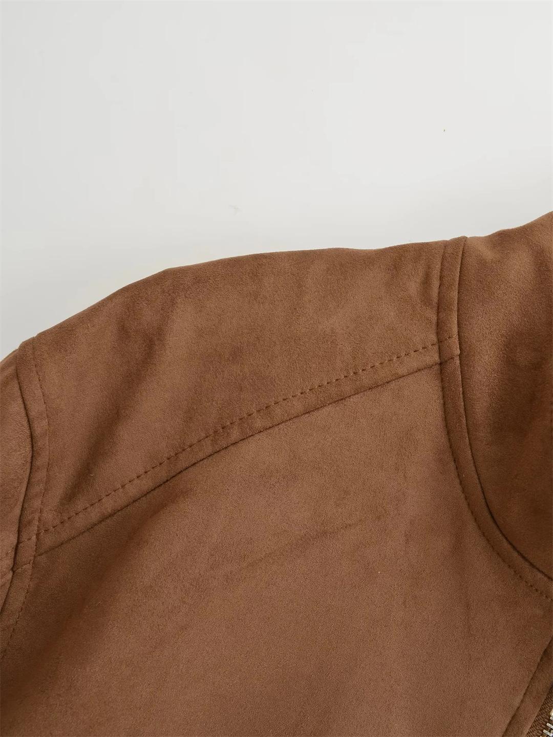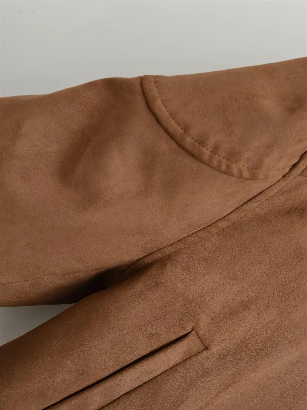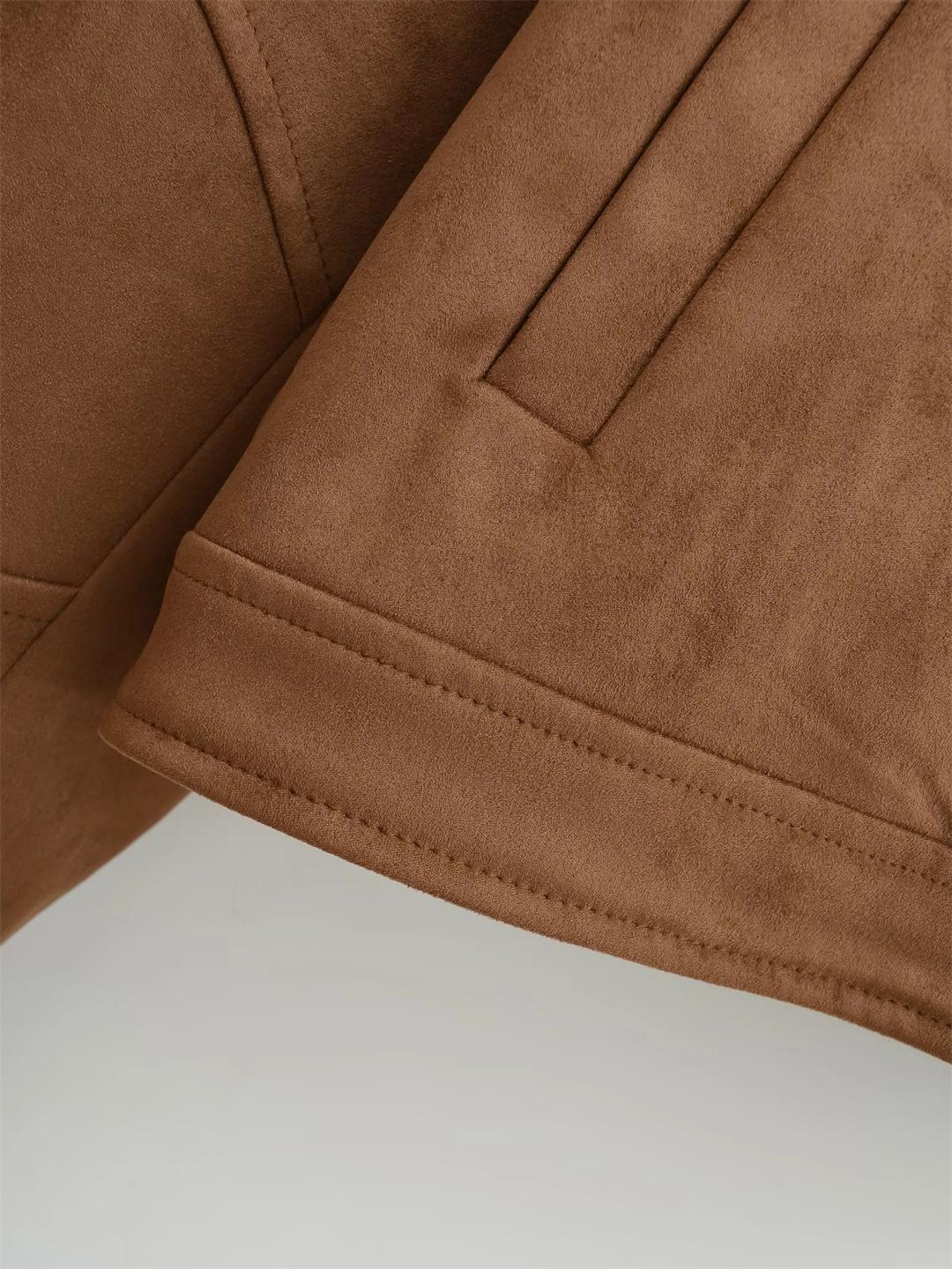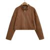 Chaqueta Retro Corta de Gamuza Maillard para Mujer Otoño Nueva Cuello Alto Estilo Urbano Chaqueta con Bolsillos Cárdigan Top