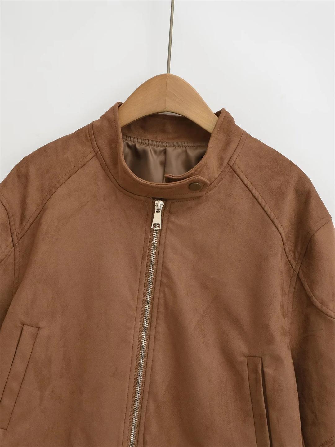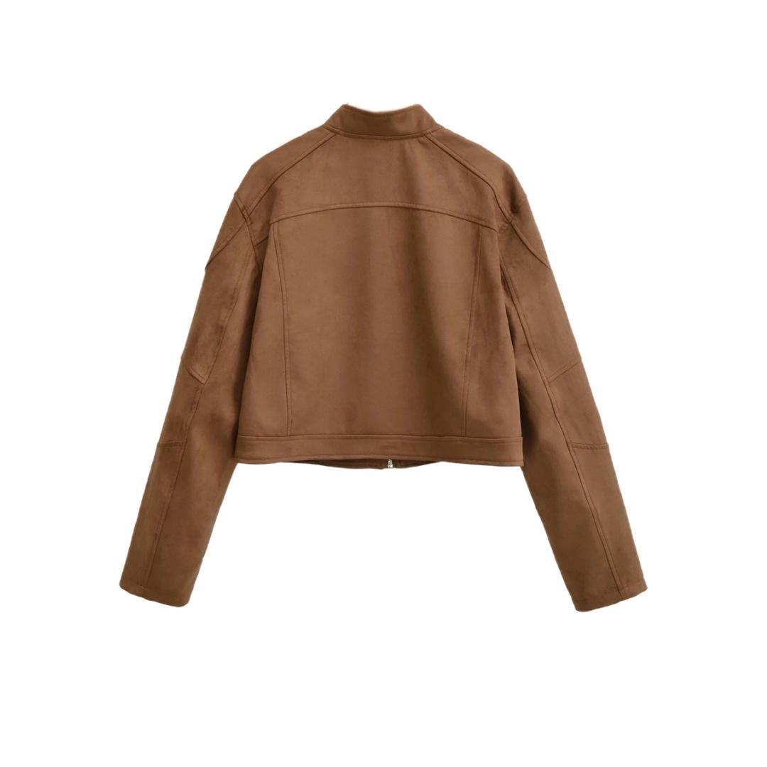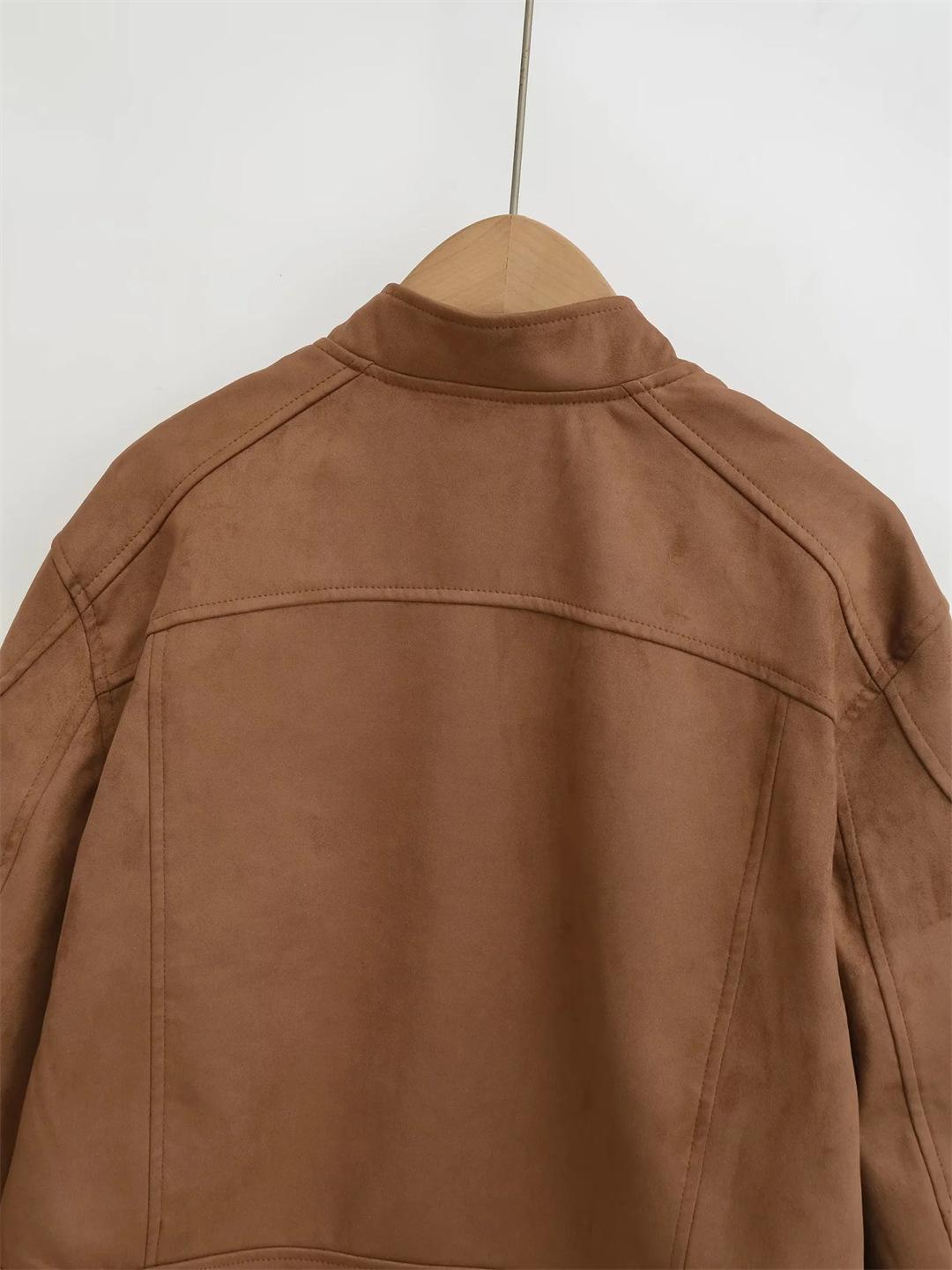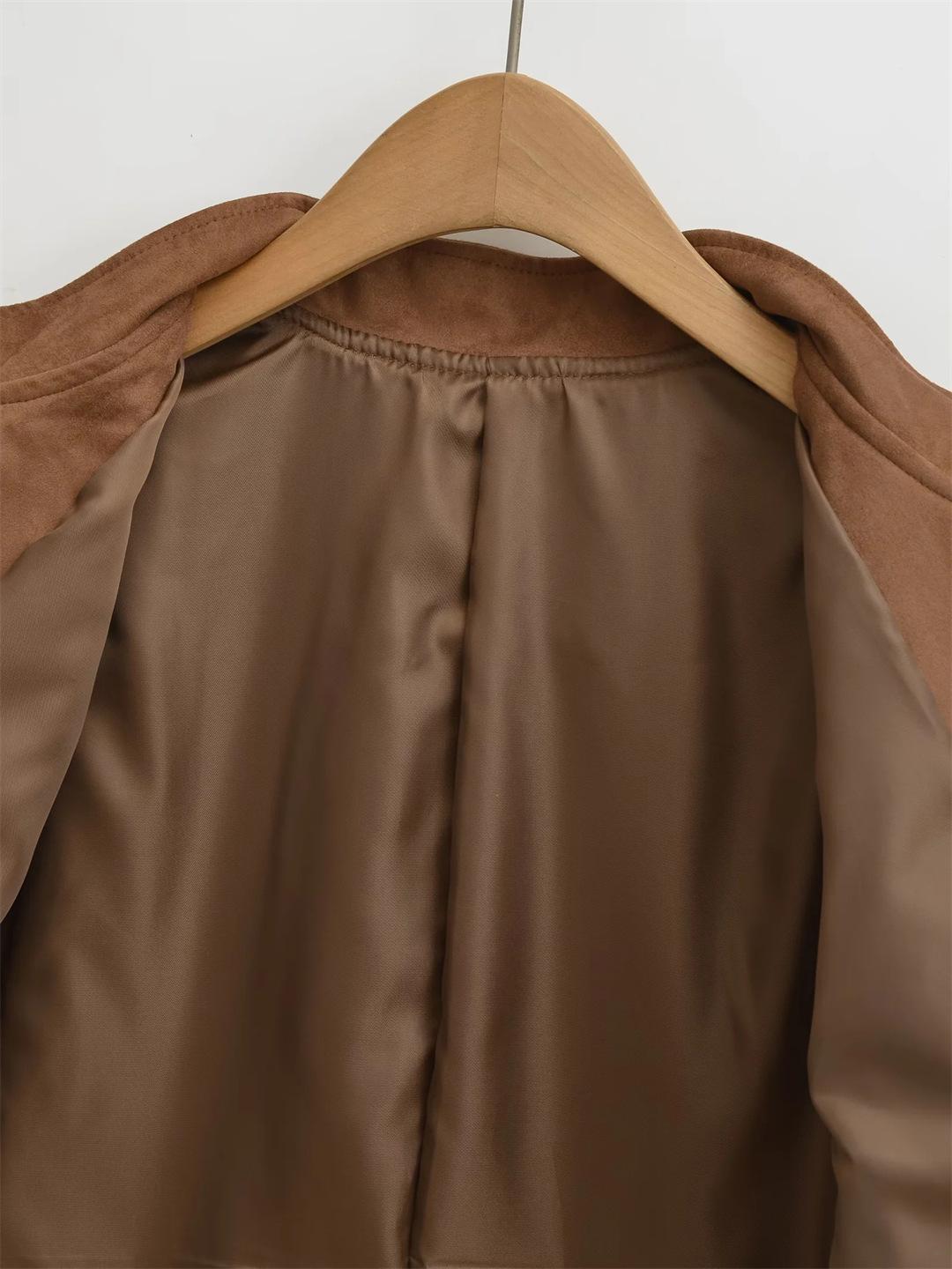 Chaqueta Retro Corta de Gamuza Maillard para Mujer Otoño Nueva Cuello Alto Estilo Urbano Chaqueta con Bolsillos Cárdigan Top
