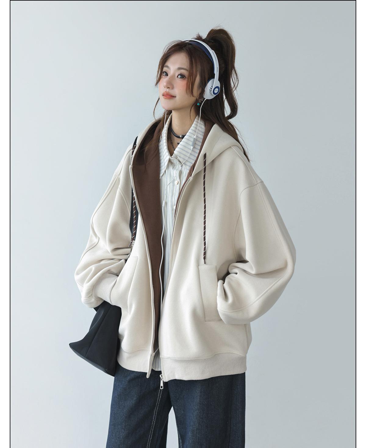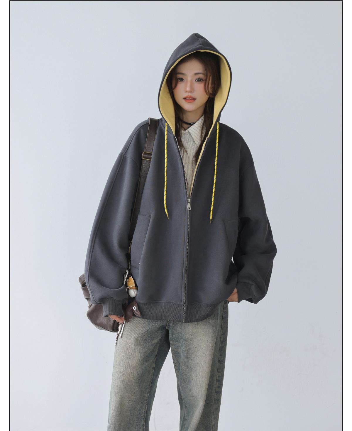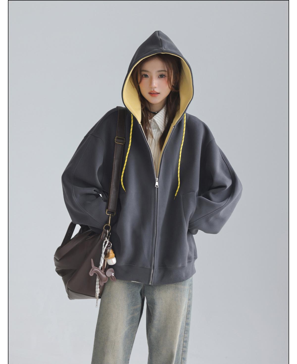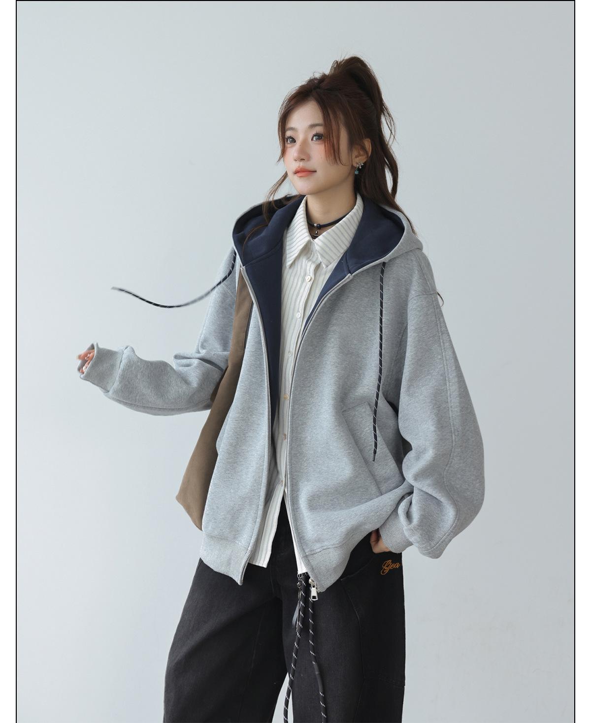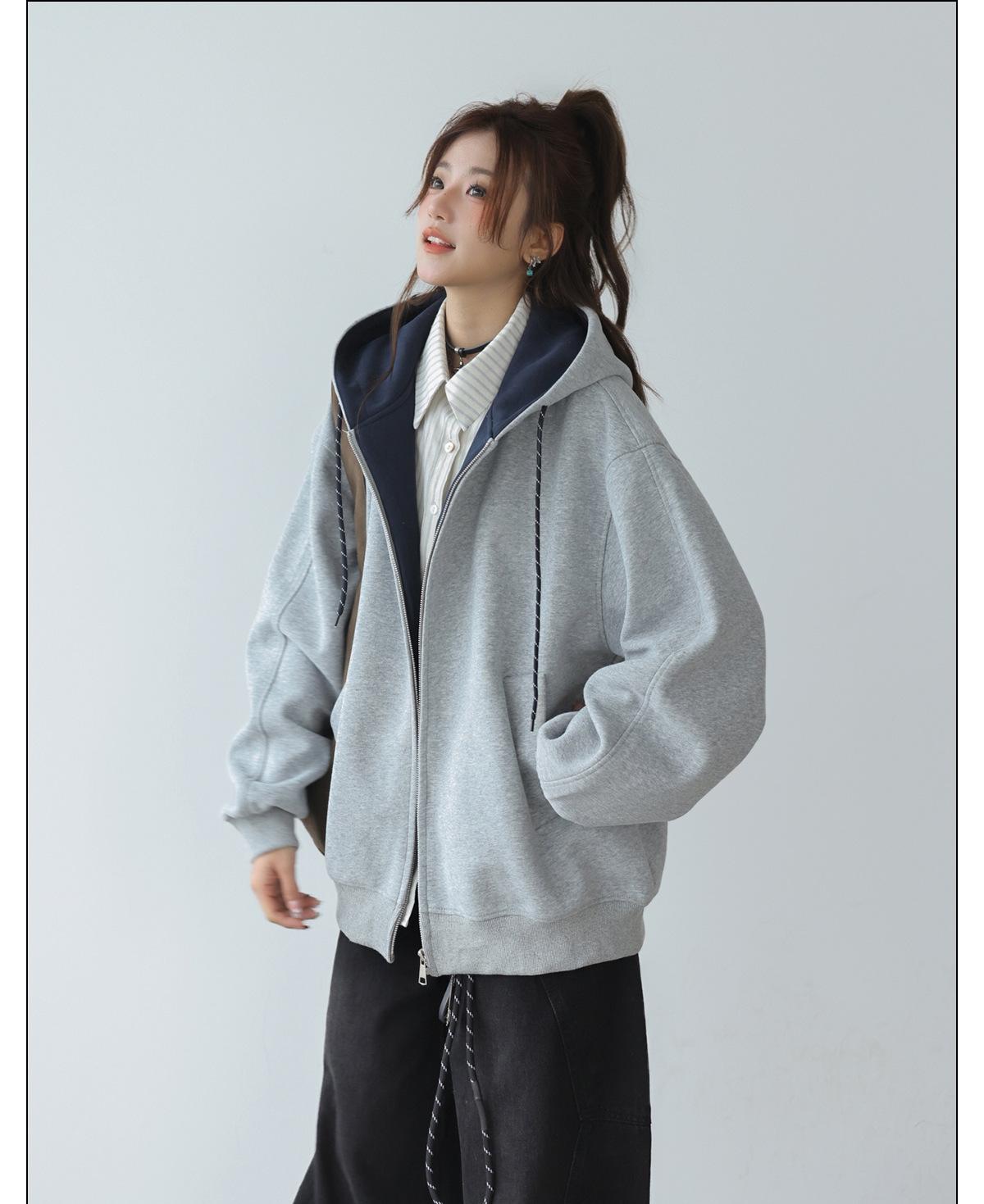 Abrigo Holgado Americano de Otoño e Invierno para Mujer 2025 Nuevo Popular Versátil Bloque de Color Cárdigan con Capucha Sudadera Gruesa A6461