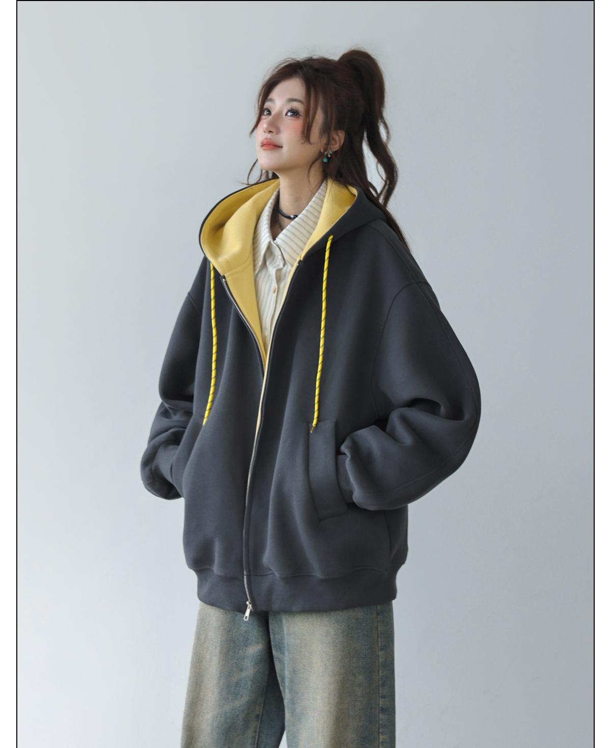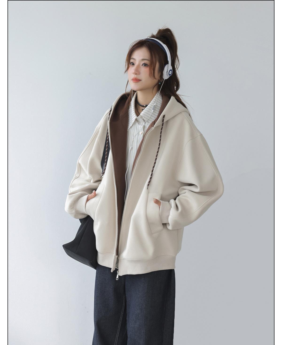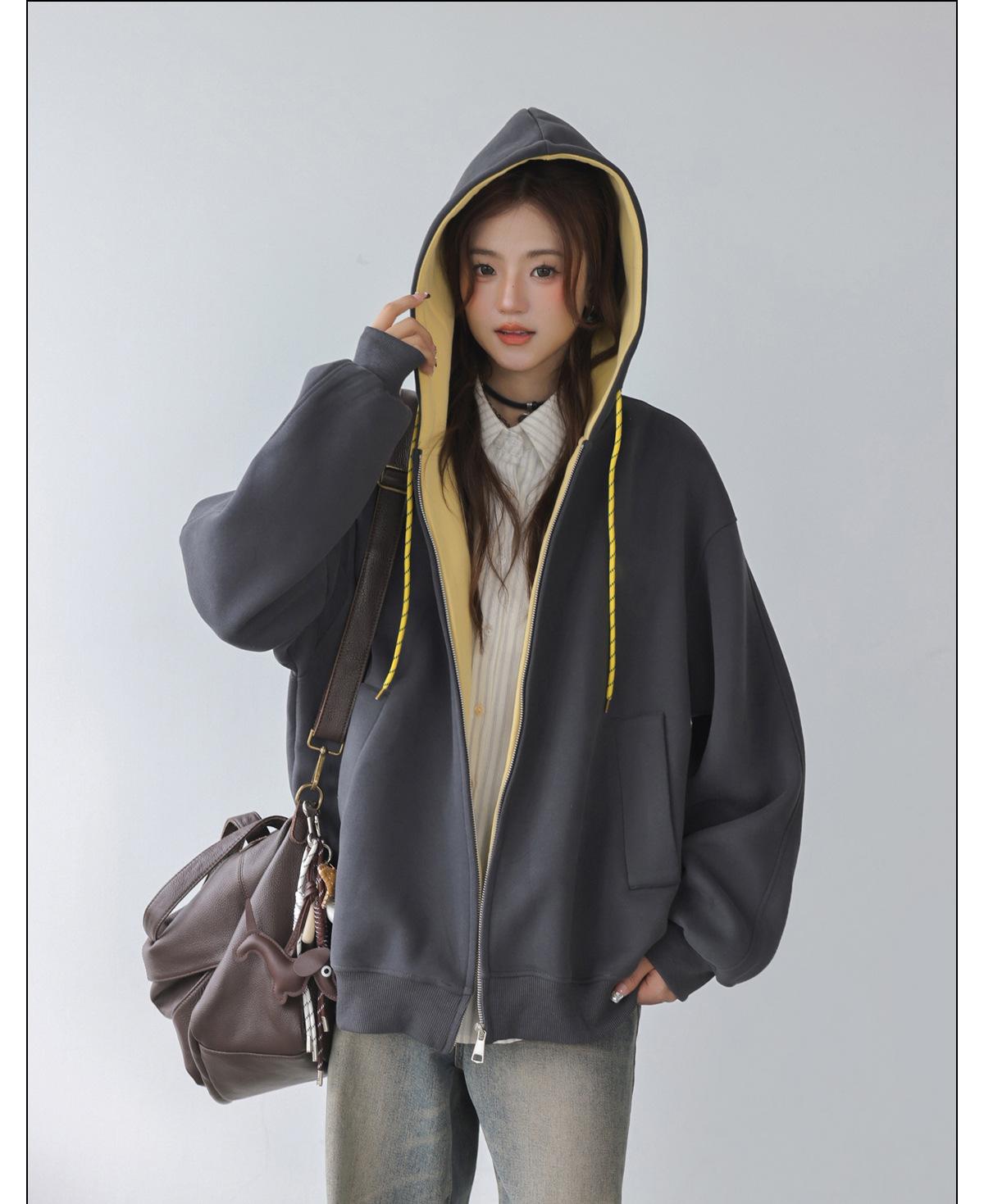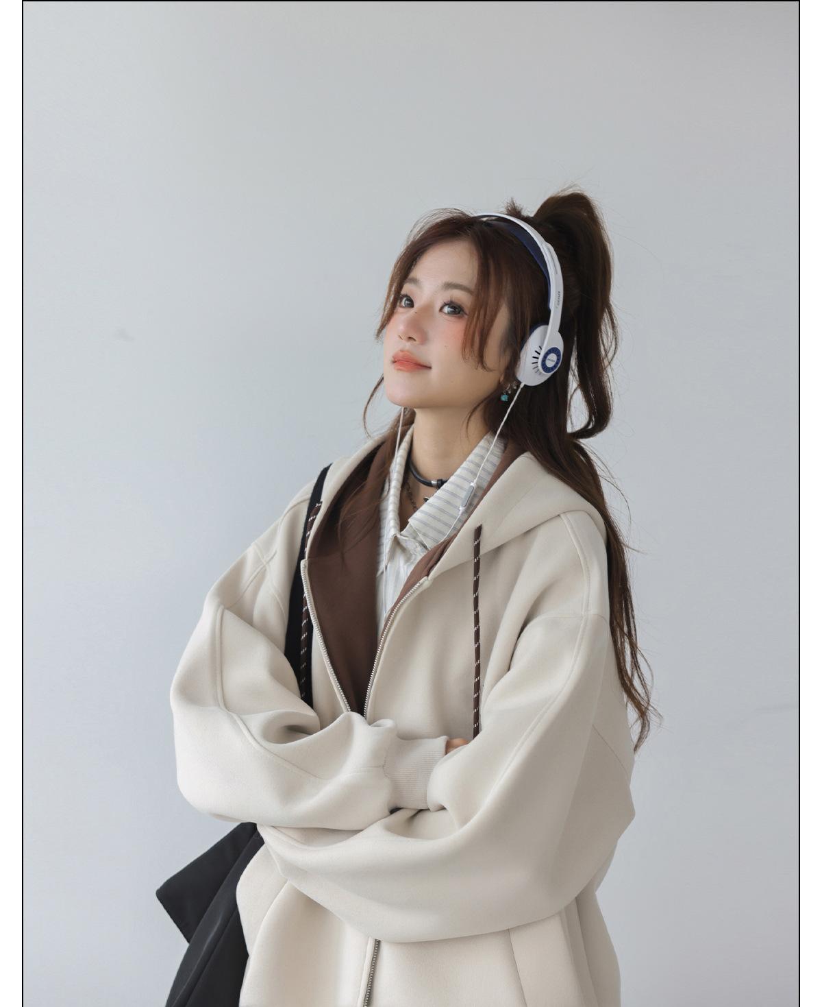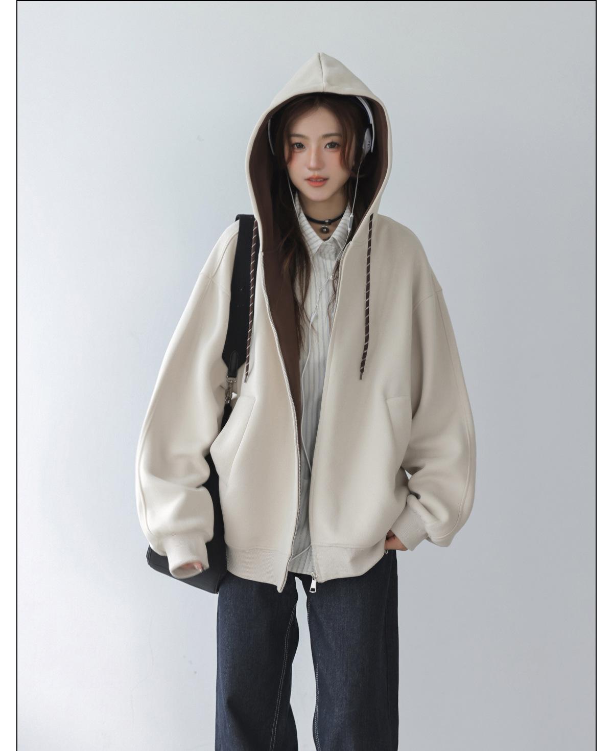 Abrigo Holgado Americano de Otoño e Invierno para Mujer 2025 Nuevo Popular Versátil Bloque de Color Cárdigan con Capucha Sudadera Gruesa A6461