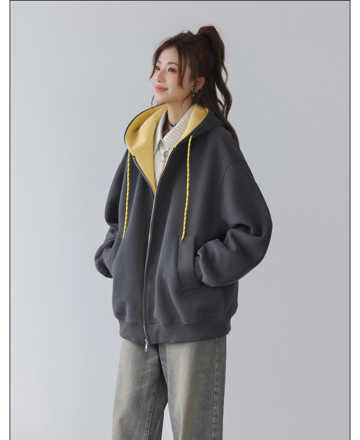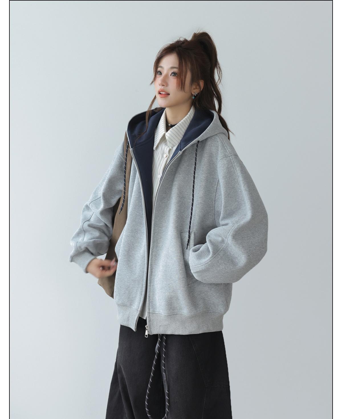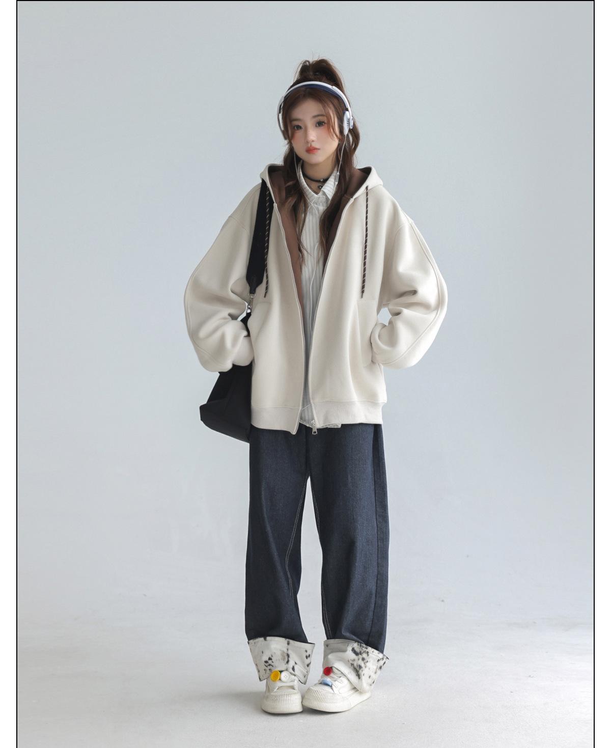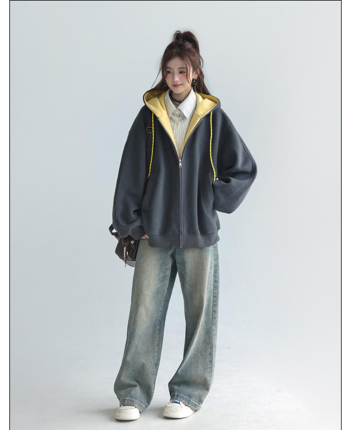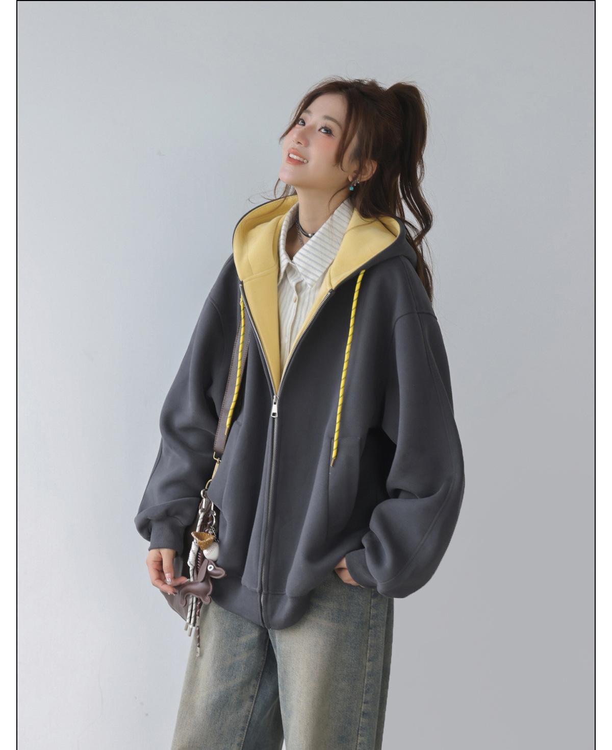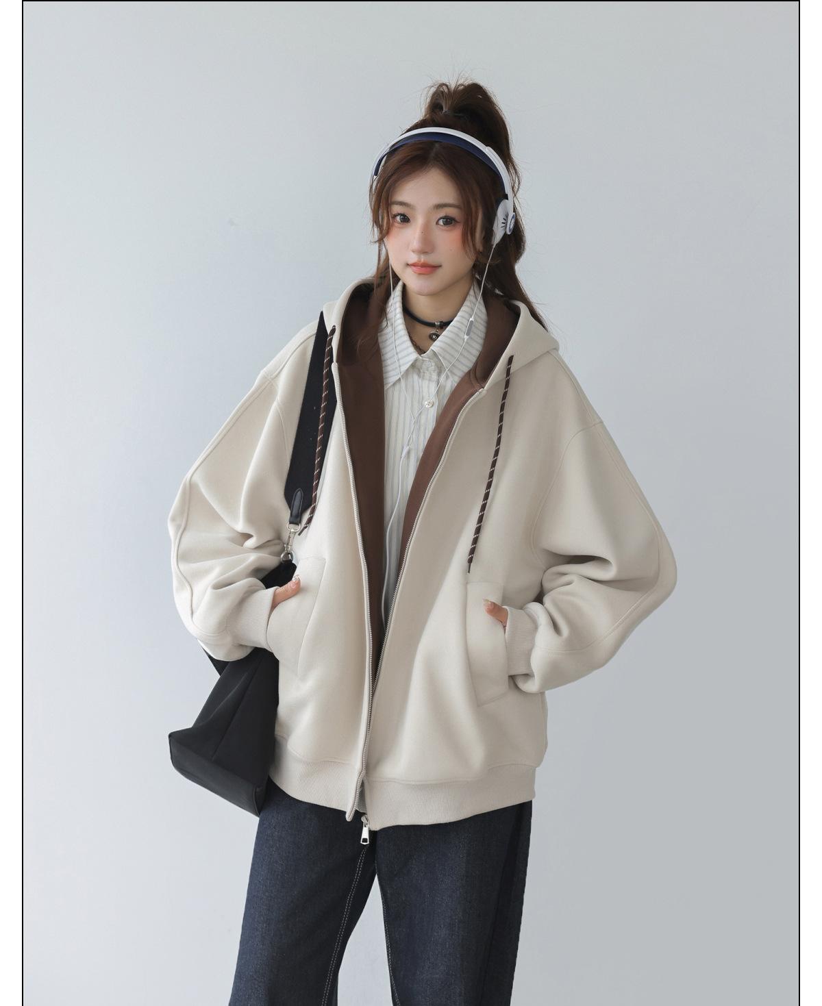 Abrigo Holgado Americano de Otoño e Invierno para Mujer 2025 Nuevo Popular Versátil Bloque de Color Cárdigan con Capucha Sudadera Gruesa A6461