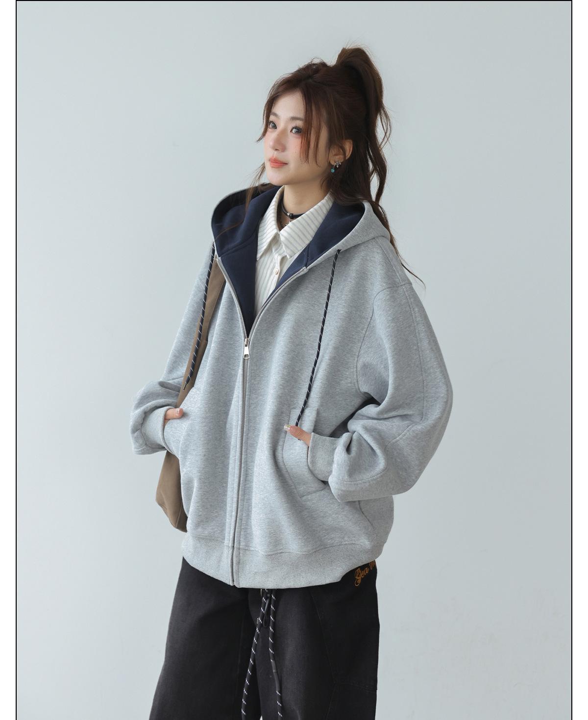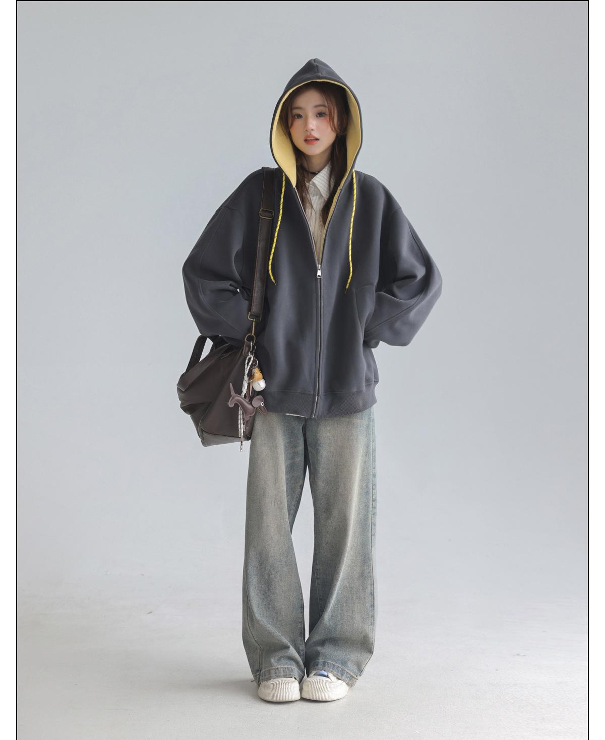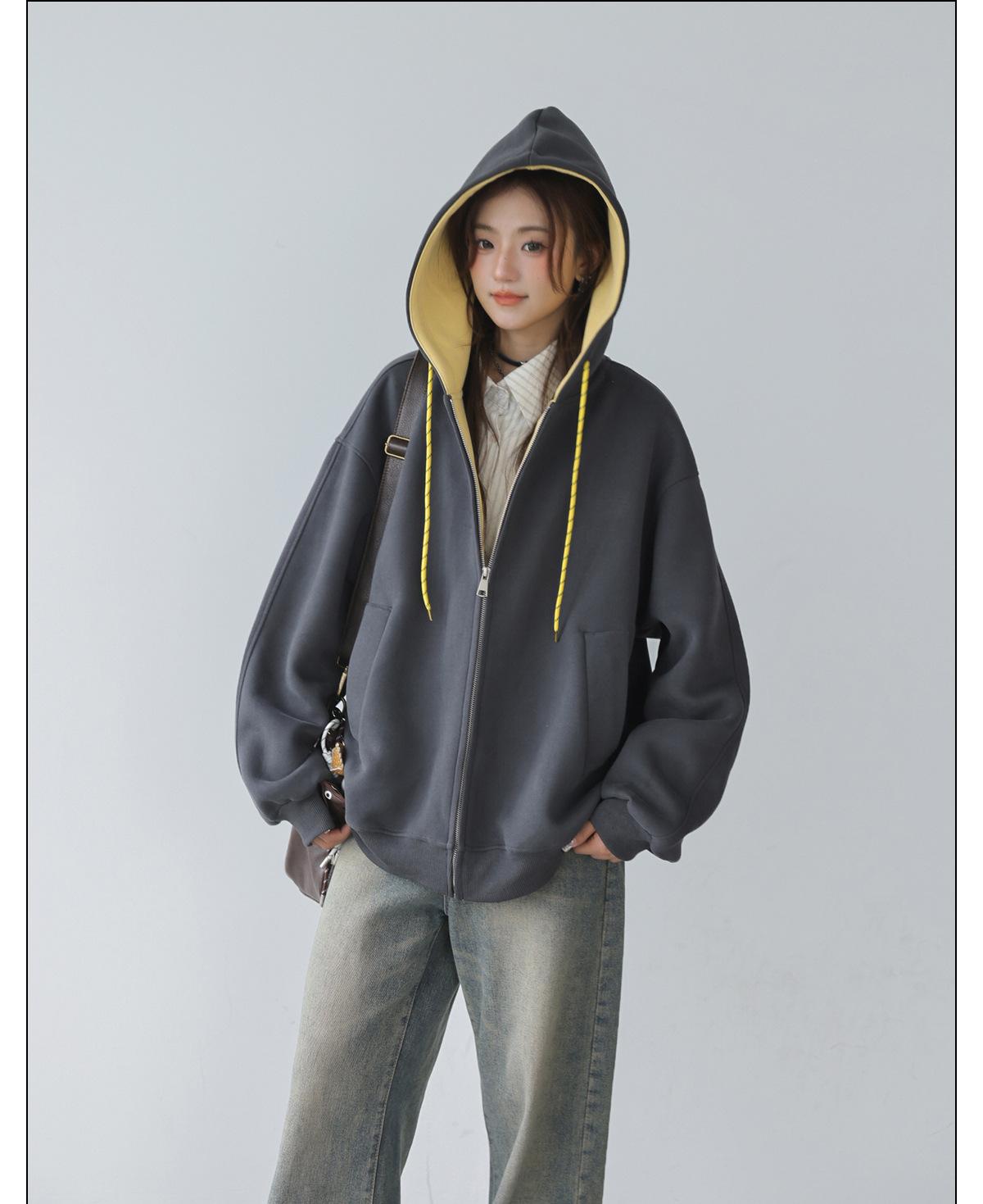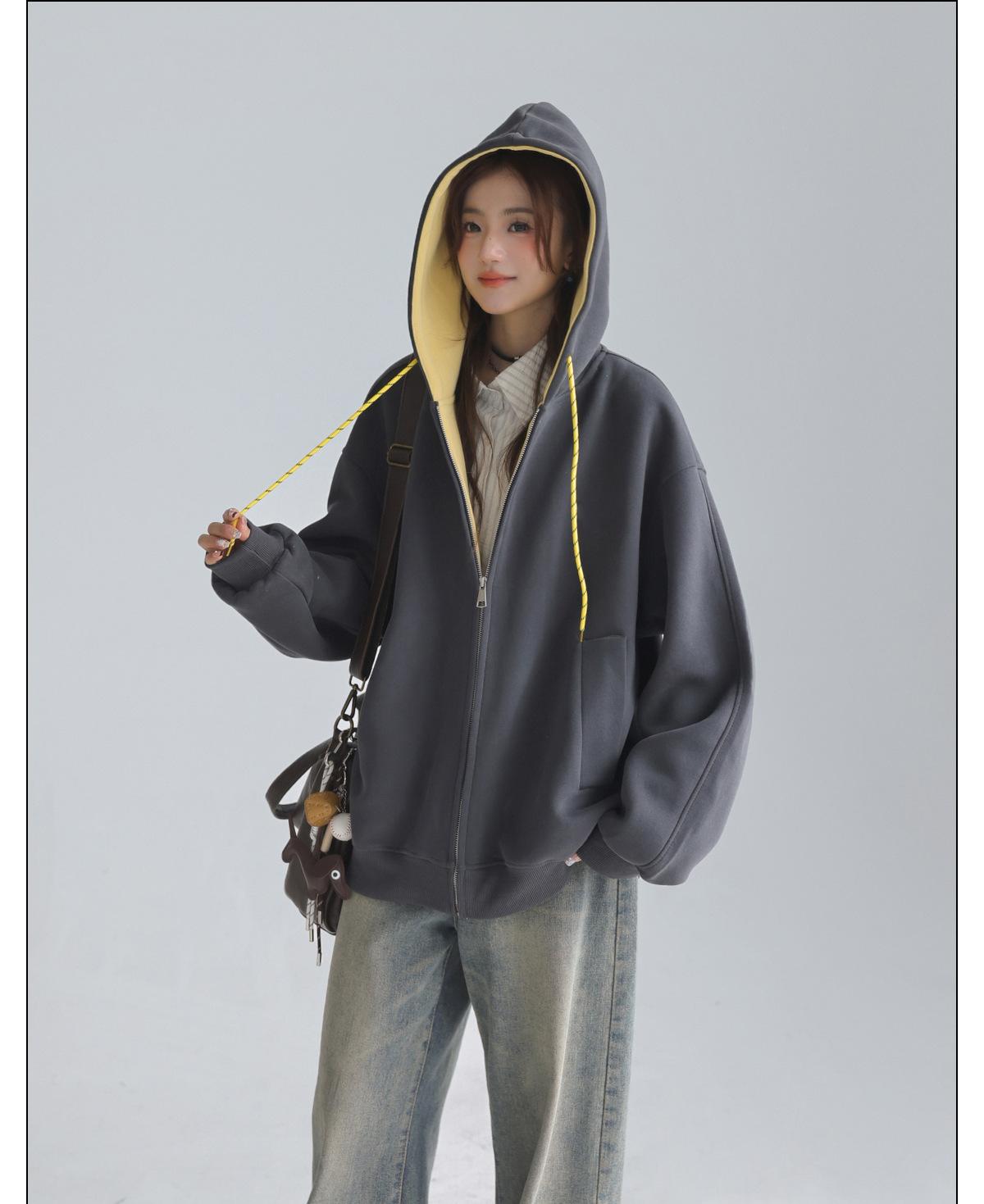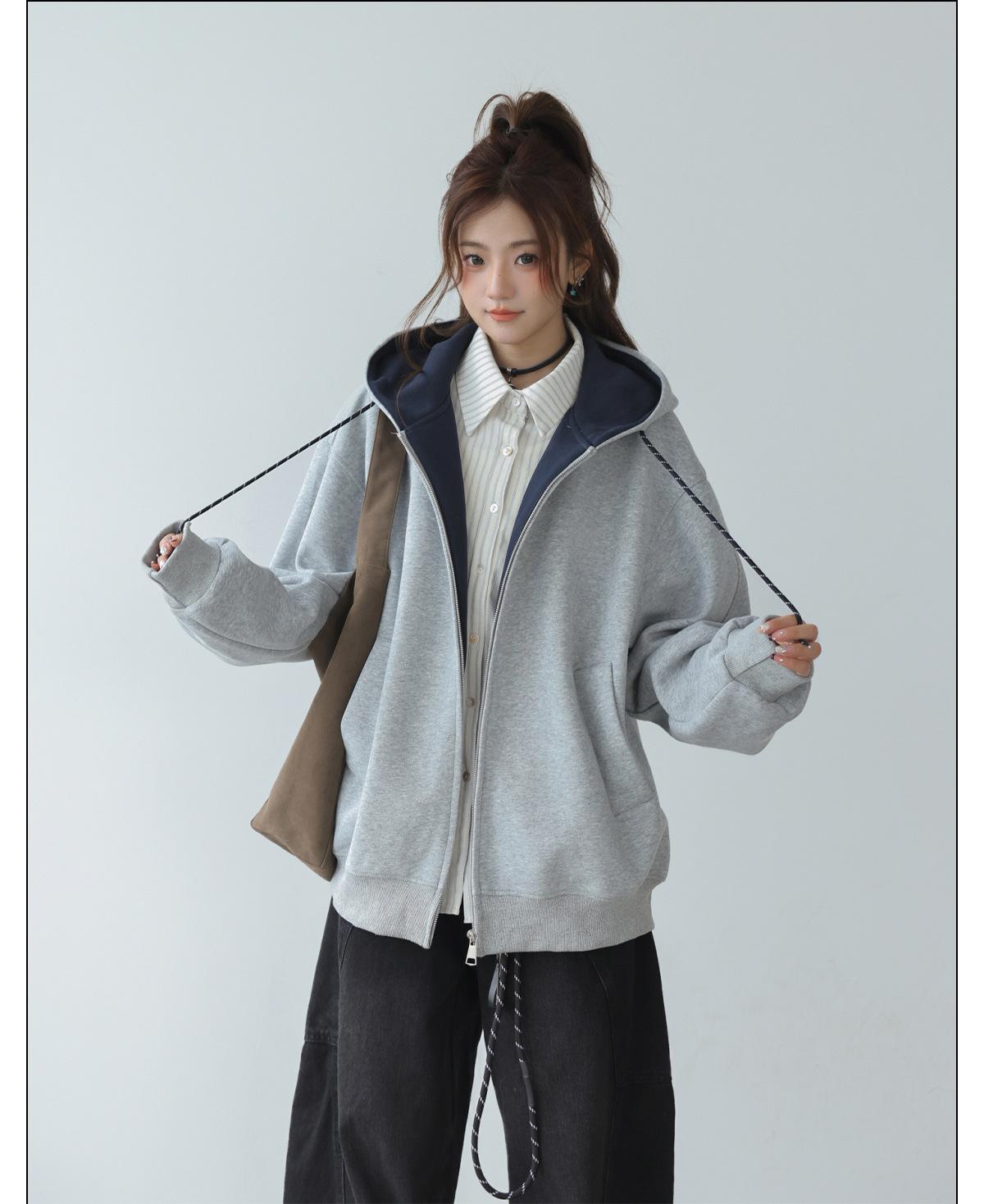 Abrigo Holgado Americano de Otoño e Invierno para Mujer 2025 Nuevo Popular Versátil Bloque de Color Cárdigan con Capucha Sudadera Gruesa A6461