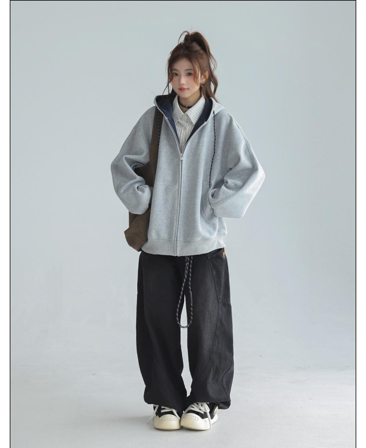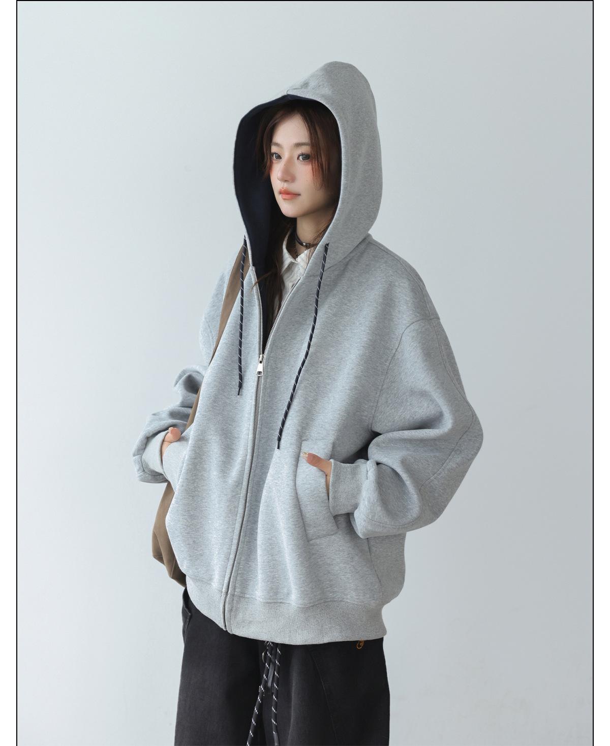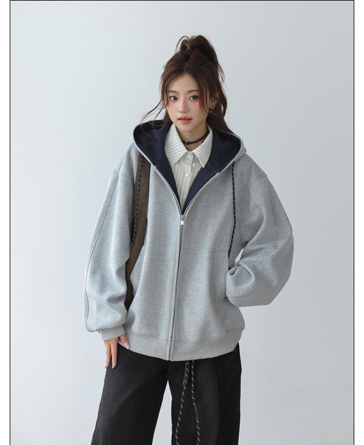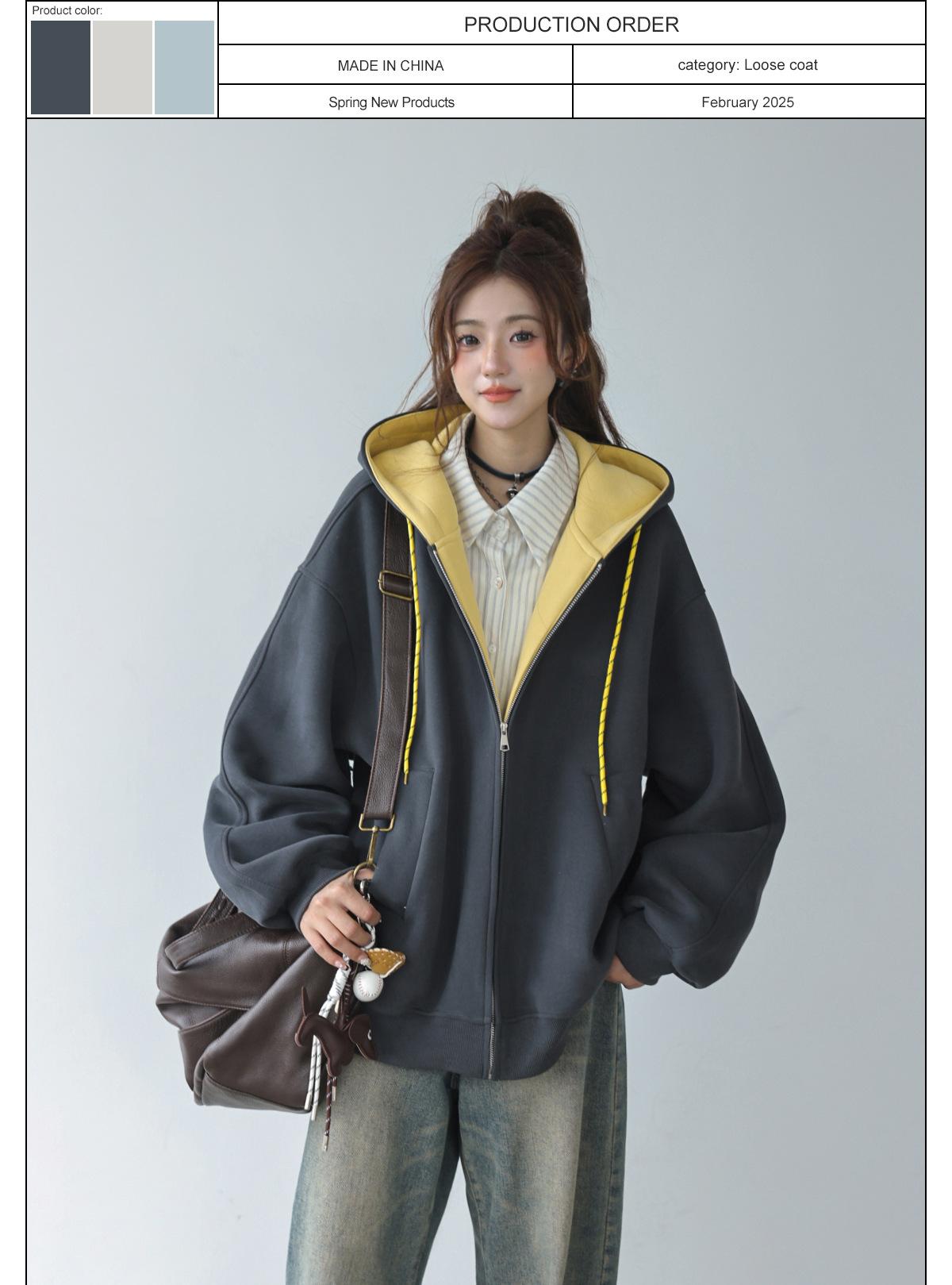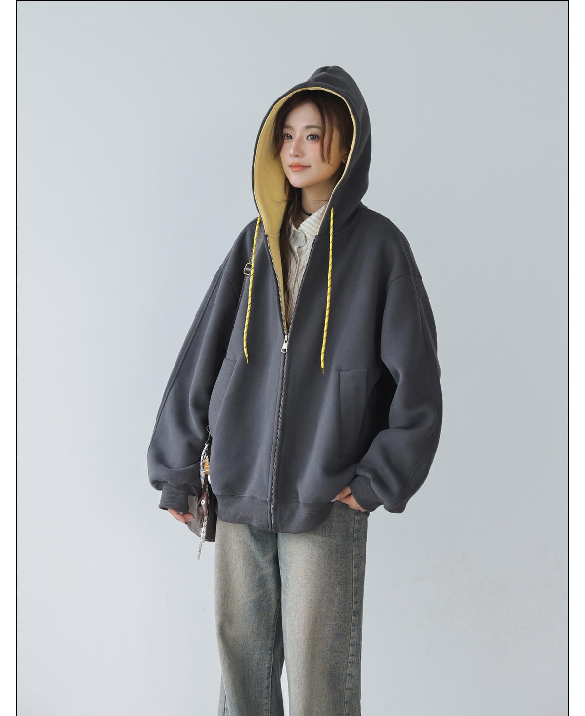 Abrigo Holgado Americano de Otoño e Invierno para Mujer 2025 Nuevo Popular Versátil Bloque de Color Cárdigan con Capucha Sudadera Gruesa A6461