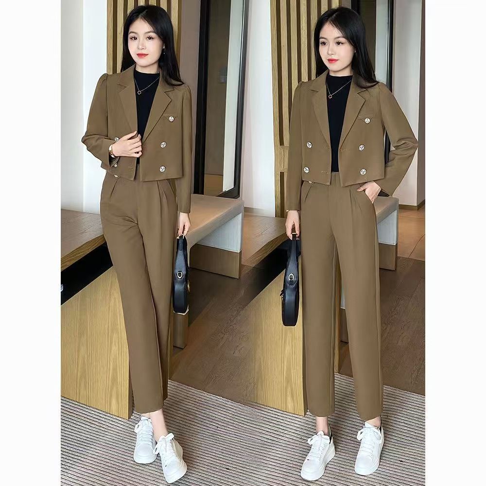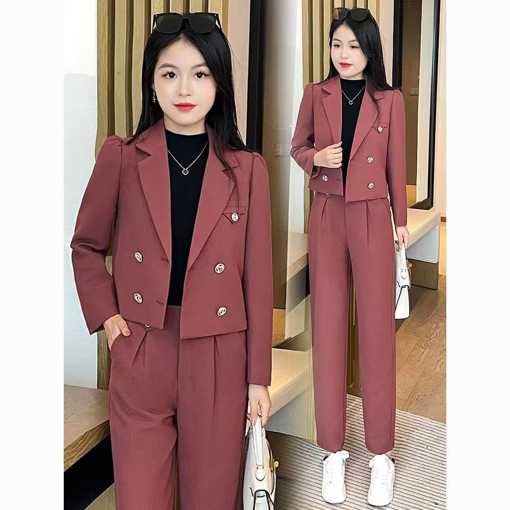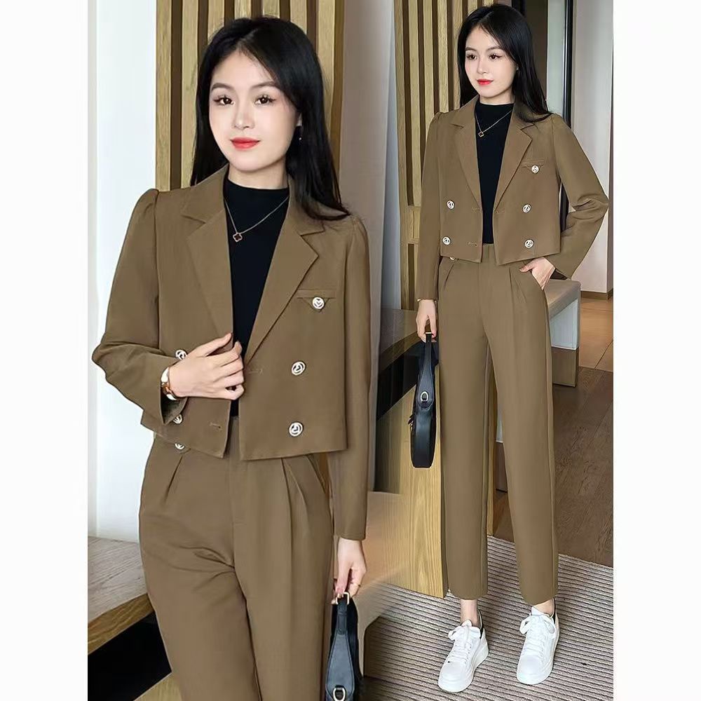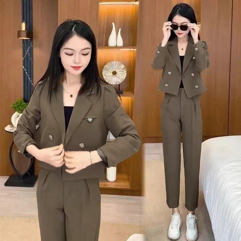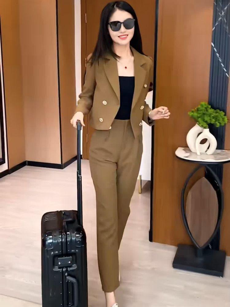 2025 Traje Blazer Corto Casual de Color Sólido para Mujer Petite Primavera Otoño Blazer Cruzado Pantalones Recortados Rectos de Cintura Alta
