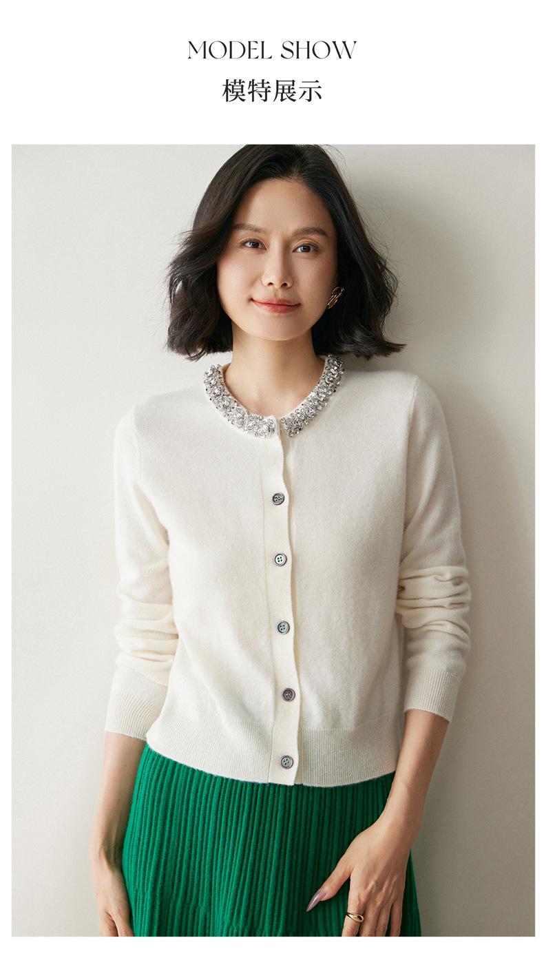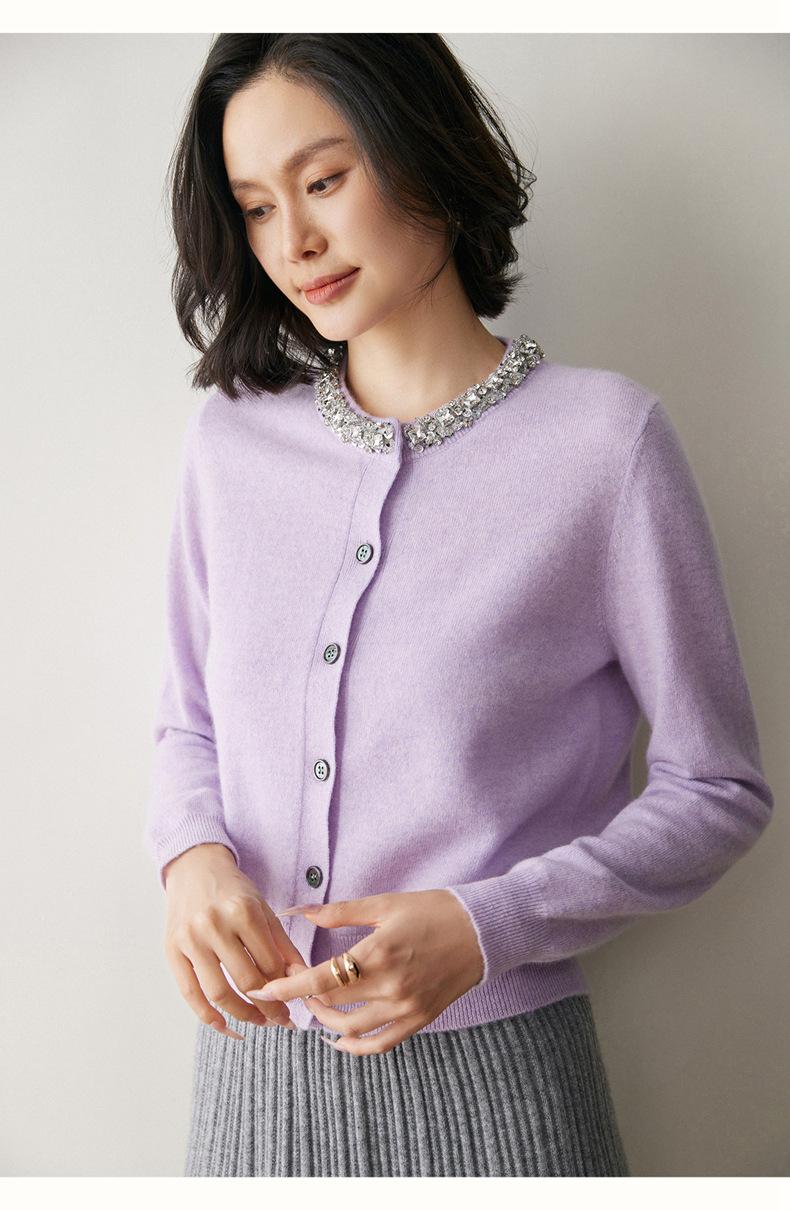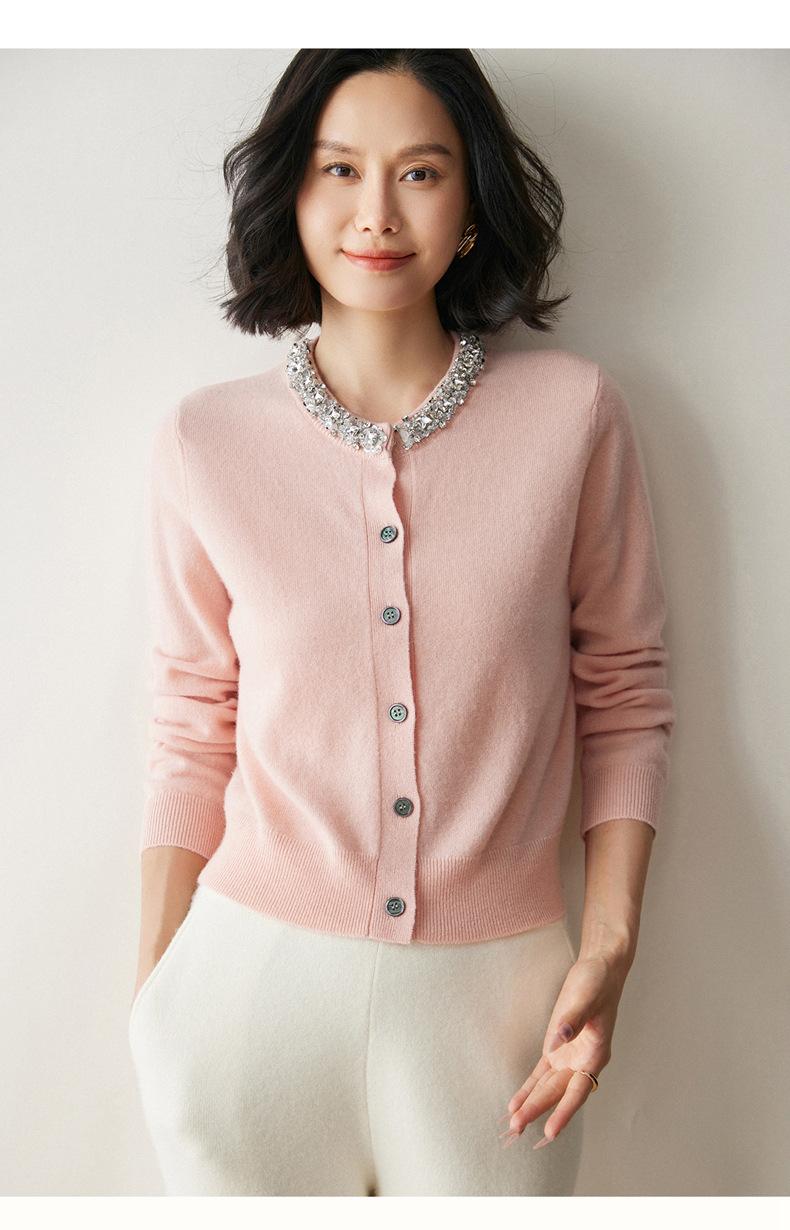 Suéter de Cachemira Otoño 2025 Nuevo Cuello Redondo Cárdigan Temperamento para Mujer Suéter Tejido con Incrustaciones de Pedrería Abrigo de Punto Holgado Top