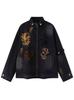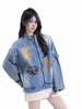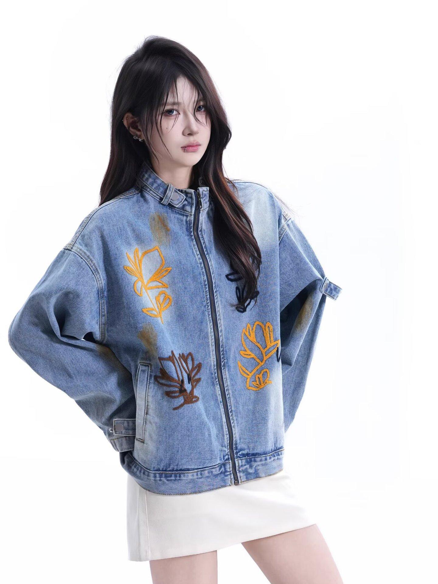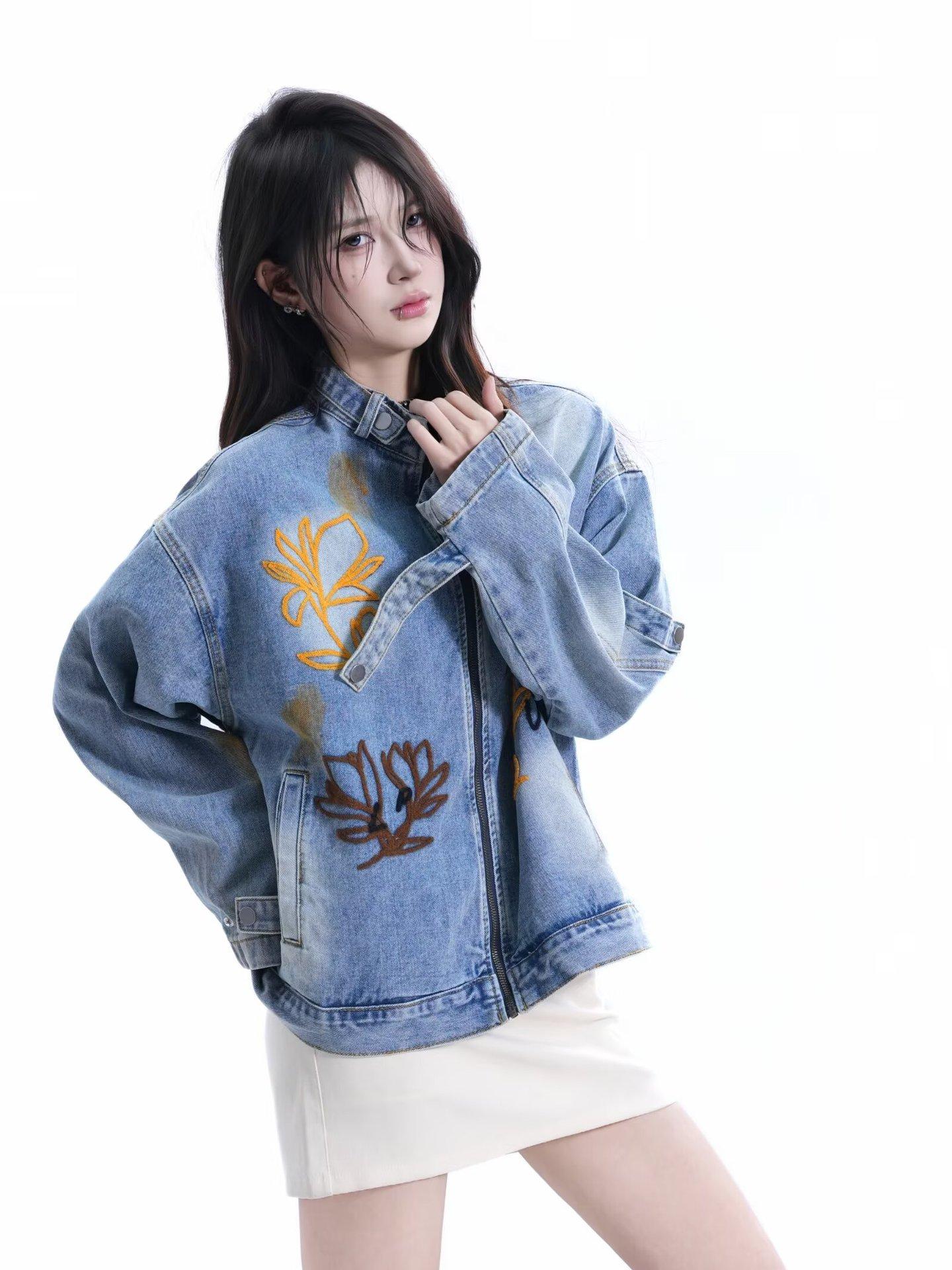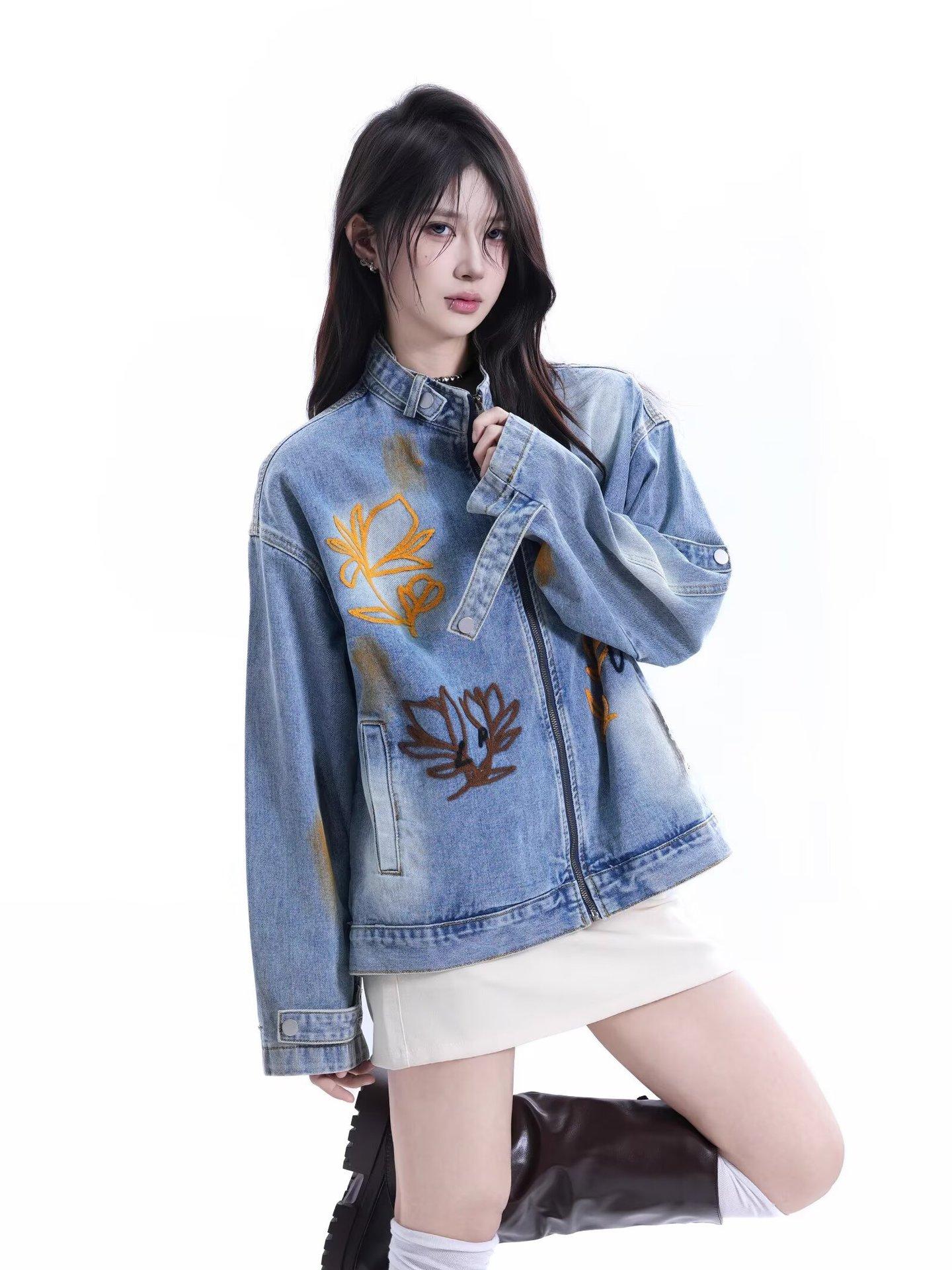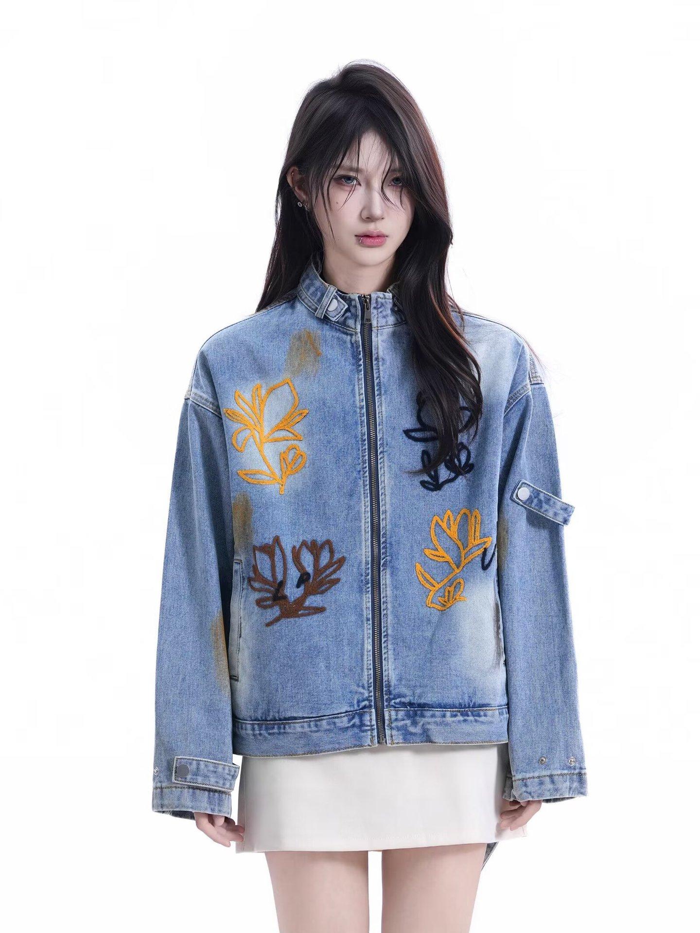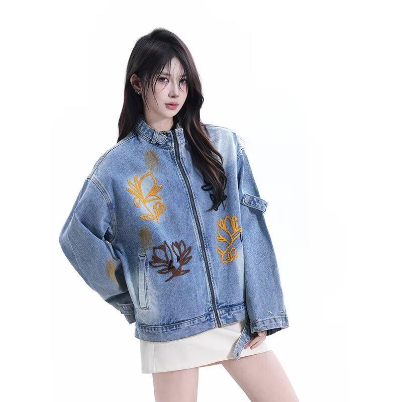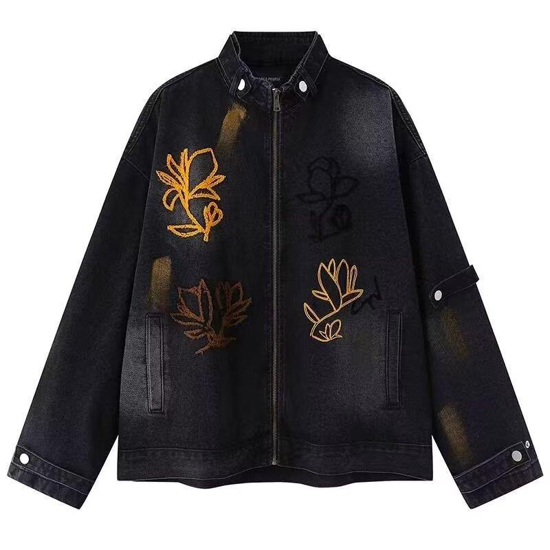 Chaqueta Otoño 2025 Lavada Desgastada Holgada Cuello Vuelto Estilo Americano Urbano Retro Estampado Floral Chaqueta de Mezclilla Hombres y Mujeres