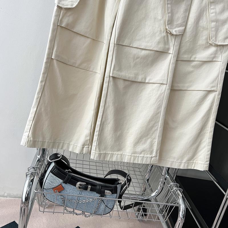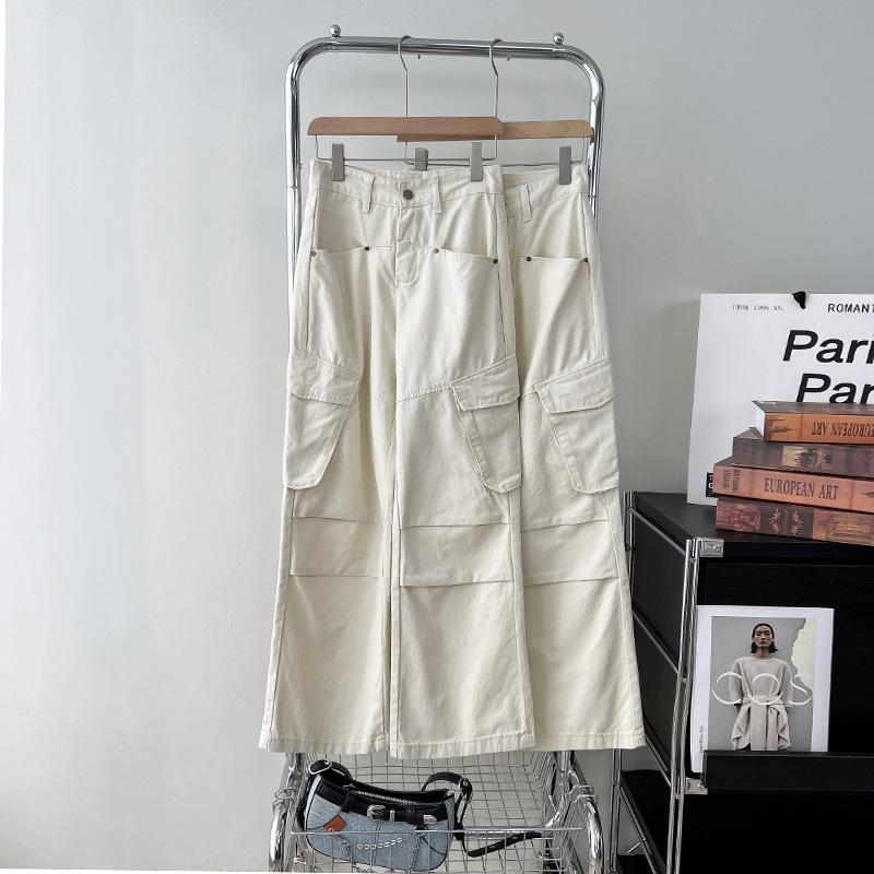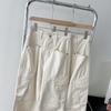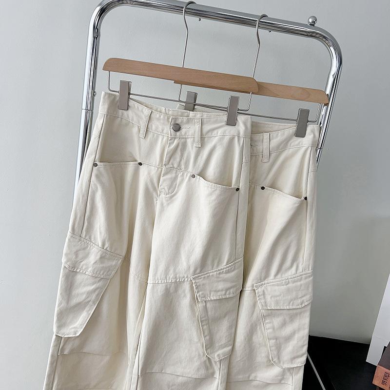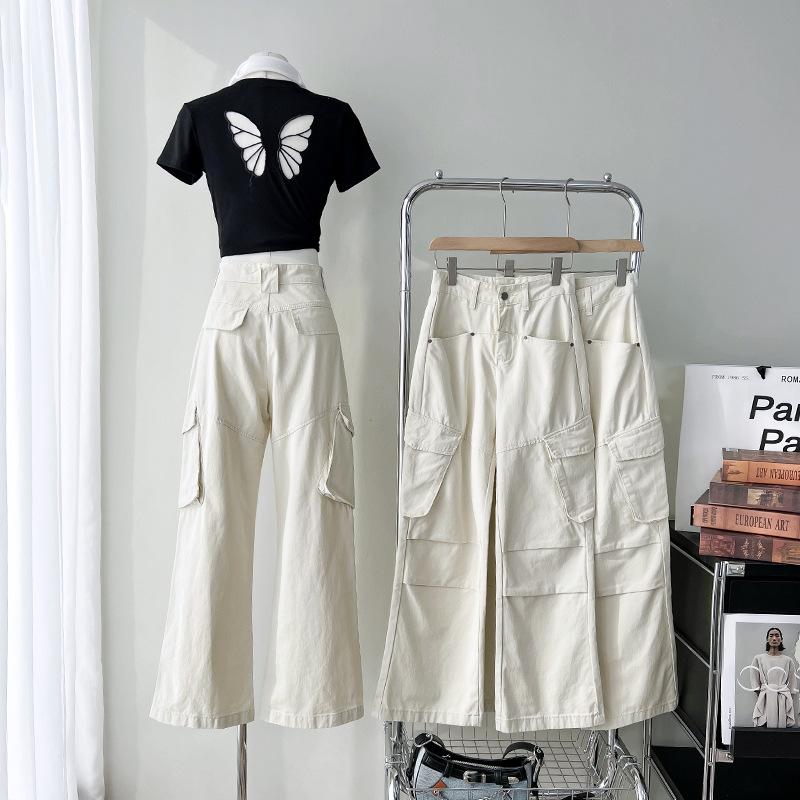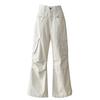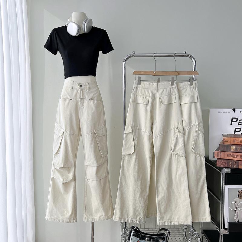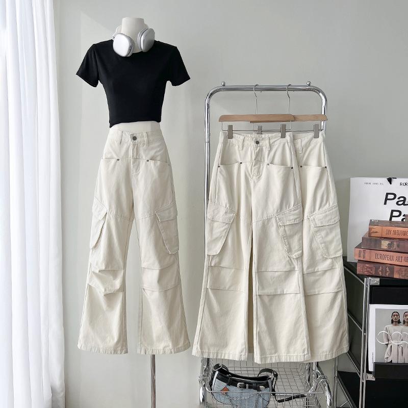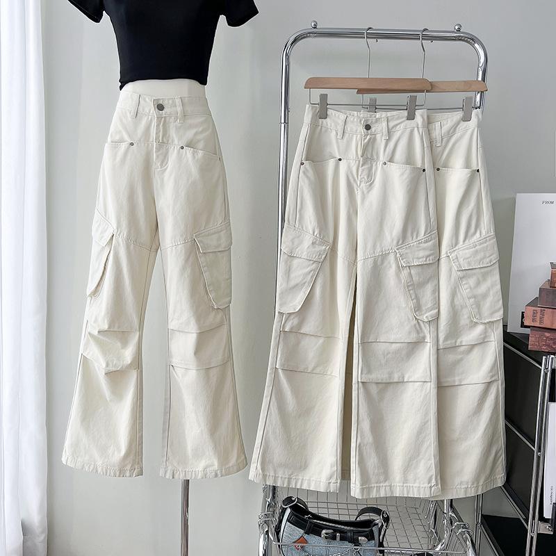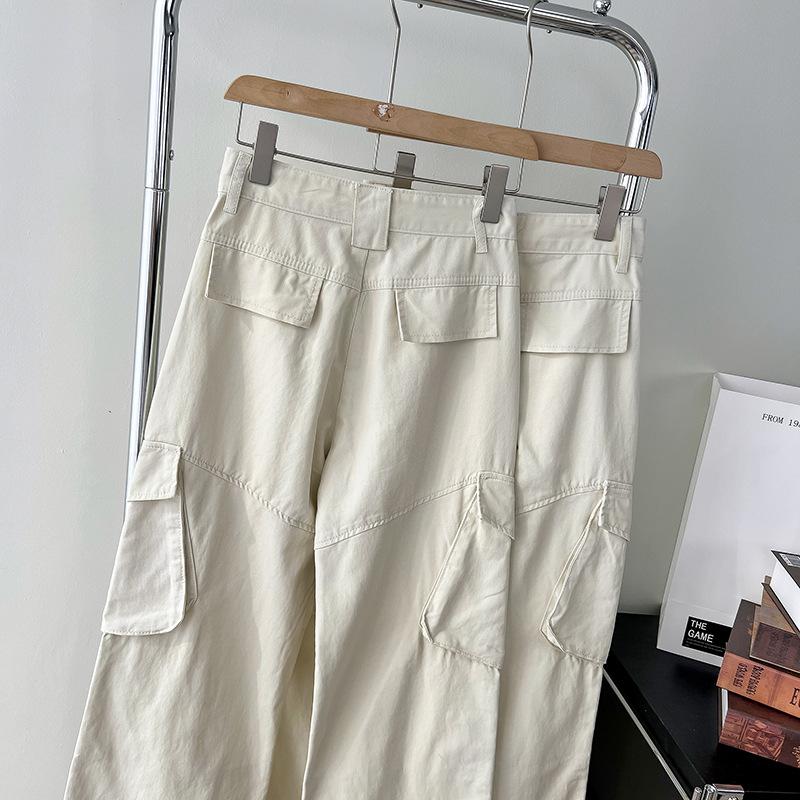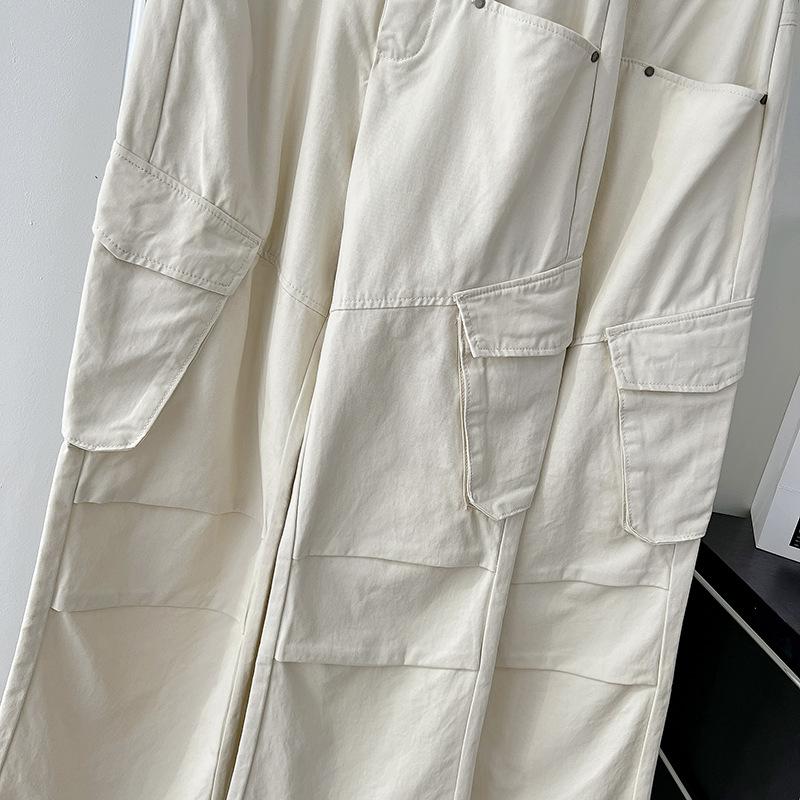 Pantalones casuales rectos holgados de cintura alta color blanco cremoso para mujer primavera y otoño 150 pequeños adelgazantes plisados con múltiples bolsillos peto