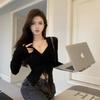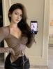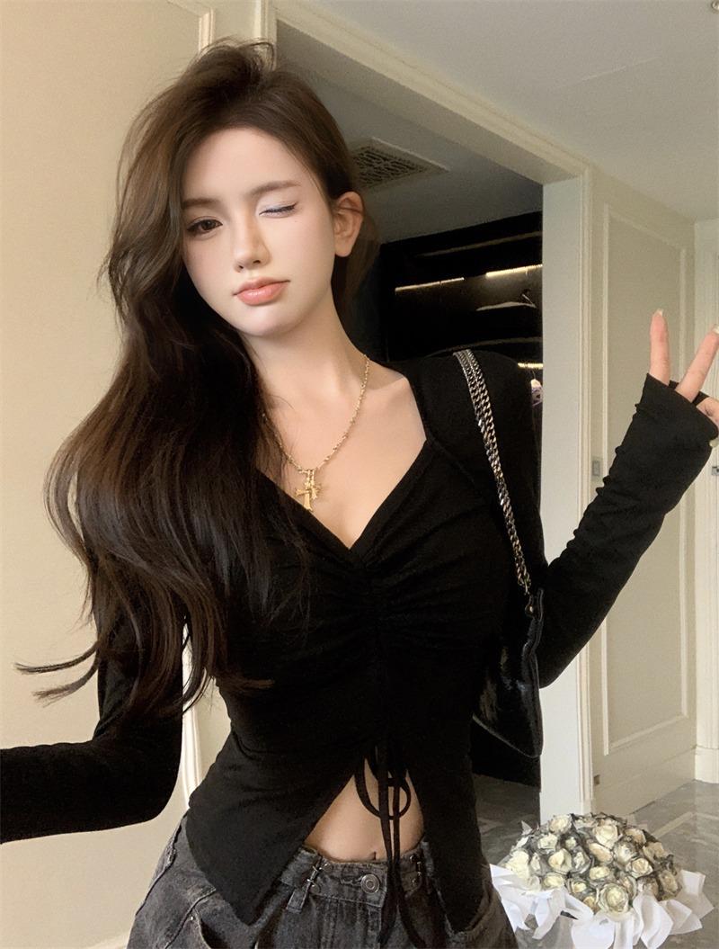 Sexy top corto con cordón para chica guapa, camiseta caqui de manga larga con cuello en V, sentido del diseño de nicho, camisa básica para primavera y otoño, top con abertura