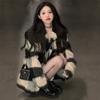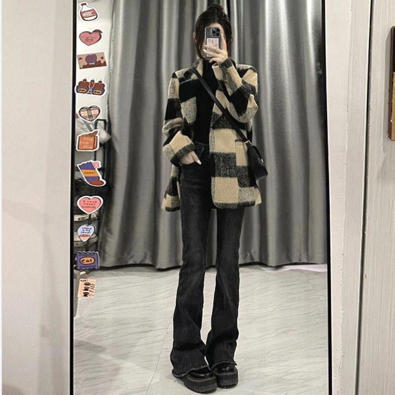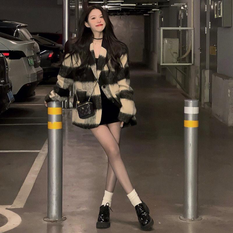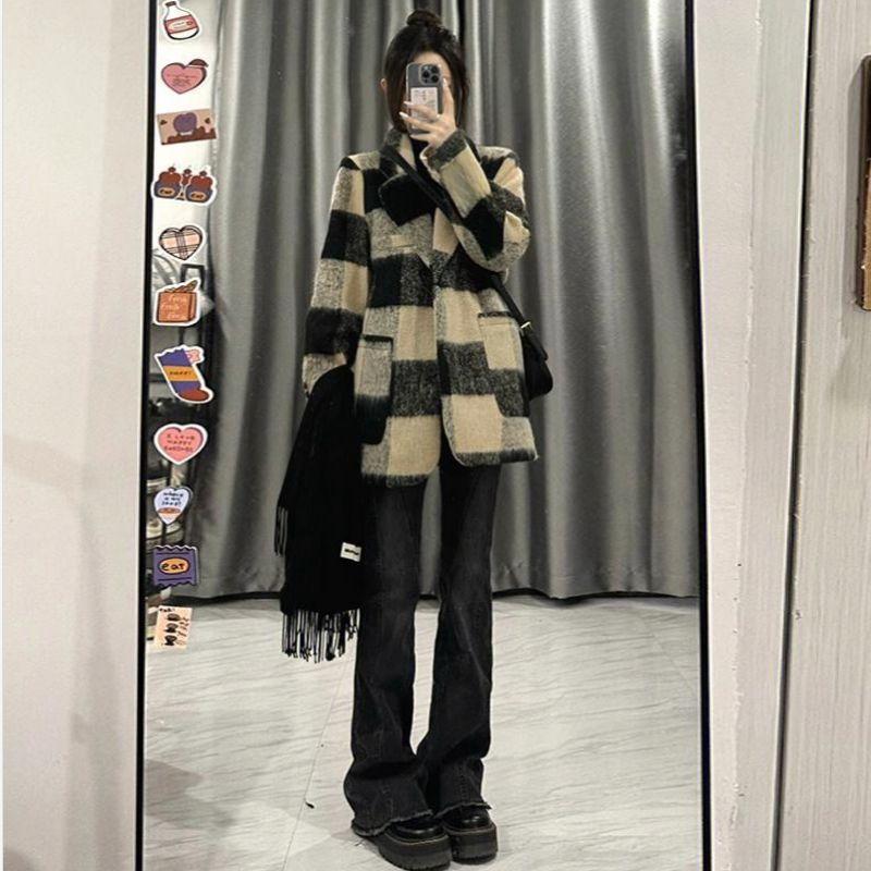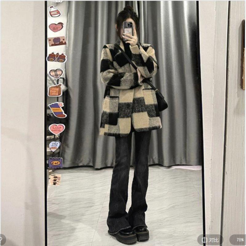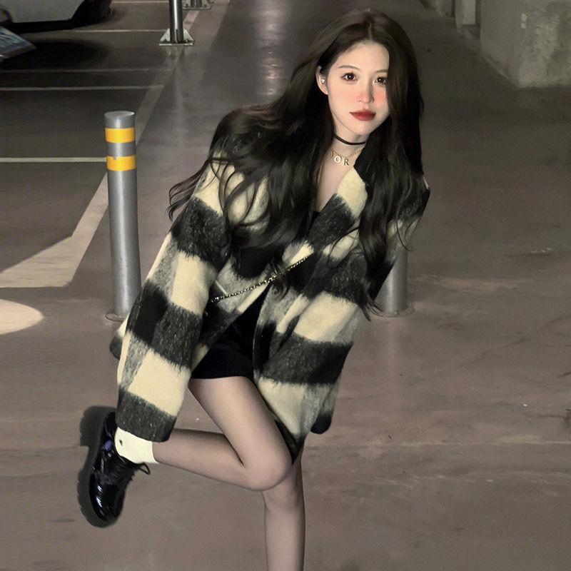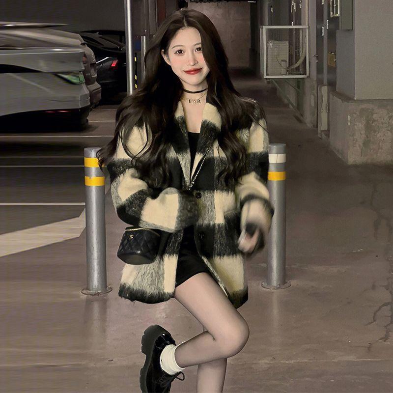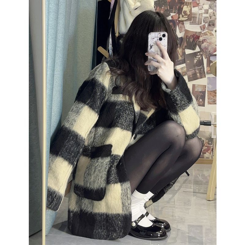 Chaqueta retro de lana a cuadros estilo Chanel para mujer otoño e invierno nuevo traje holgado de temperamento delgado abrigo de longitud media tendencia