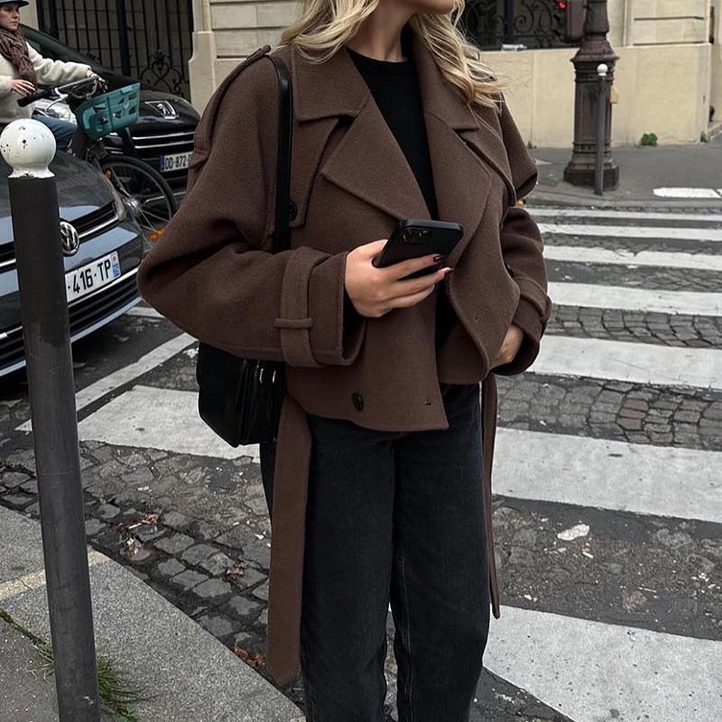 2025 Comercio Exterior Europeo y Americano Transfronterizo Nuevo Ropa de Mujer Solapa Grande Moda Lana Corto con Cinturón Abrigo Chaqueta Top