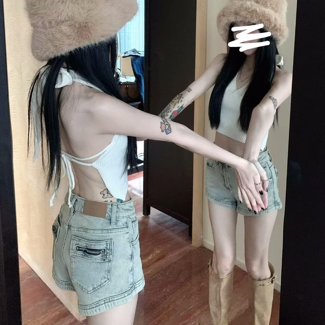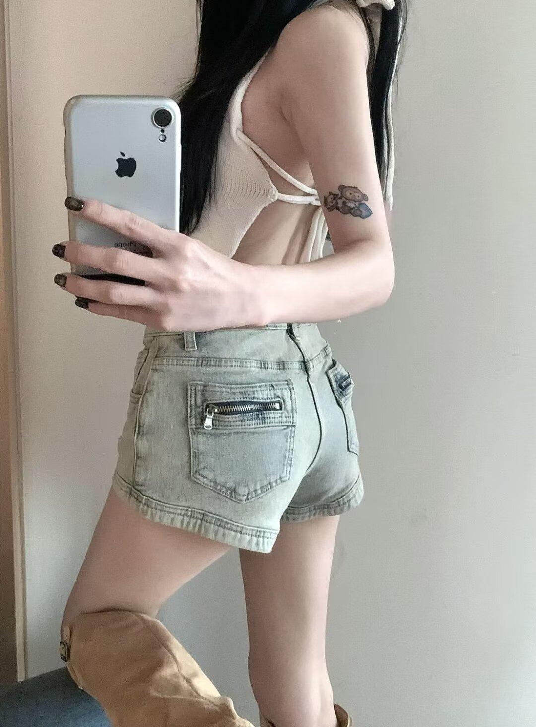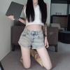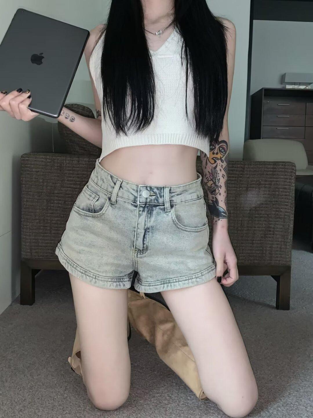 Shorts de mezclilla de línea A adelgazantes de cintura alta estilo retro americano color barro amarillo para mujer, verano, delgados, pantalones cortos calientes con estiramiento caliente en el brazo