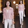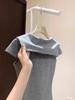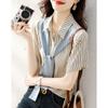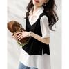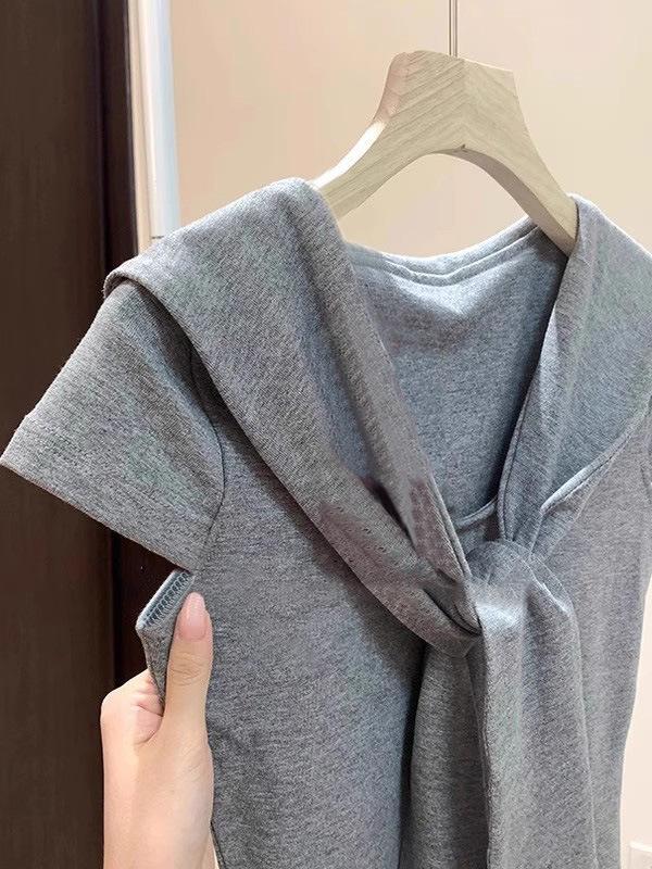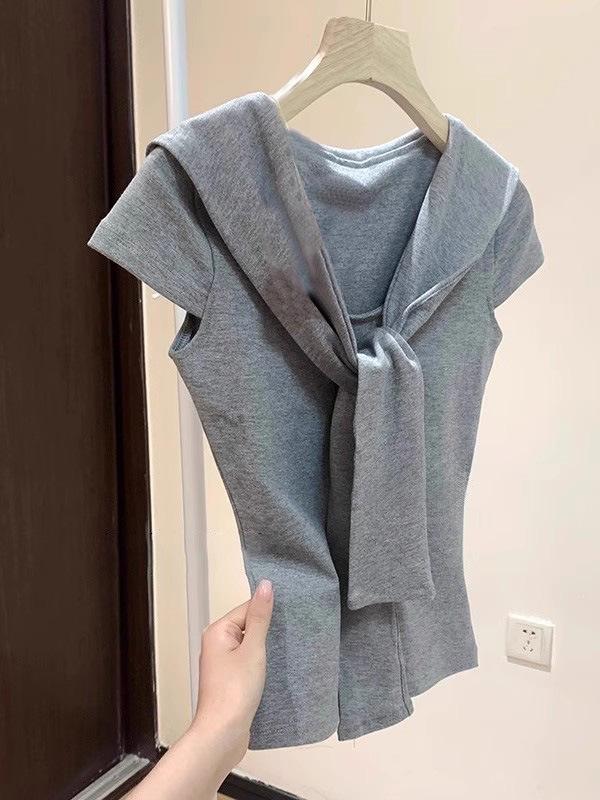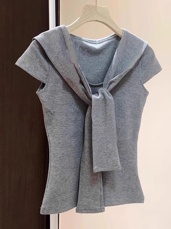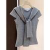 Camiseta de Manga Corta Falsa de Dos Piezas con Lazo en el Cuello Marino Moda Color Sólido Diseño Simple Fresca Reductora de Edad Versátil Top de Mujer ins