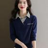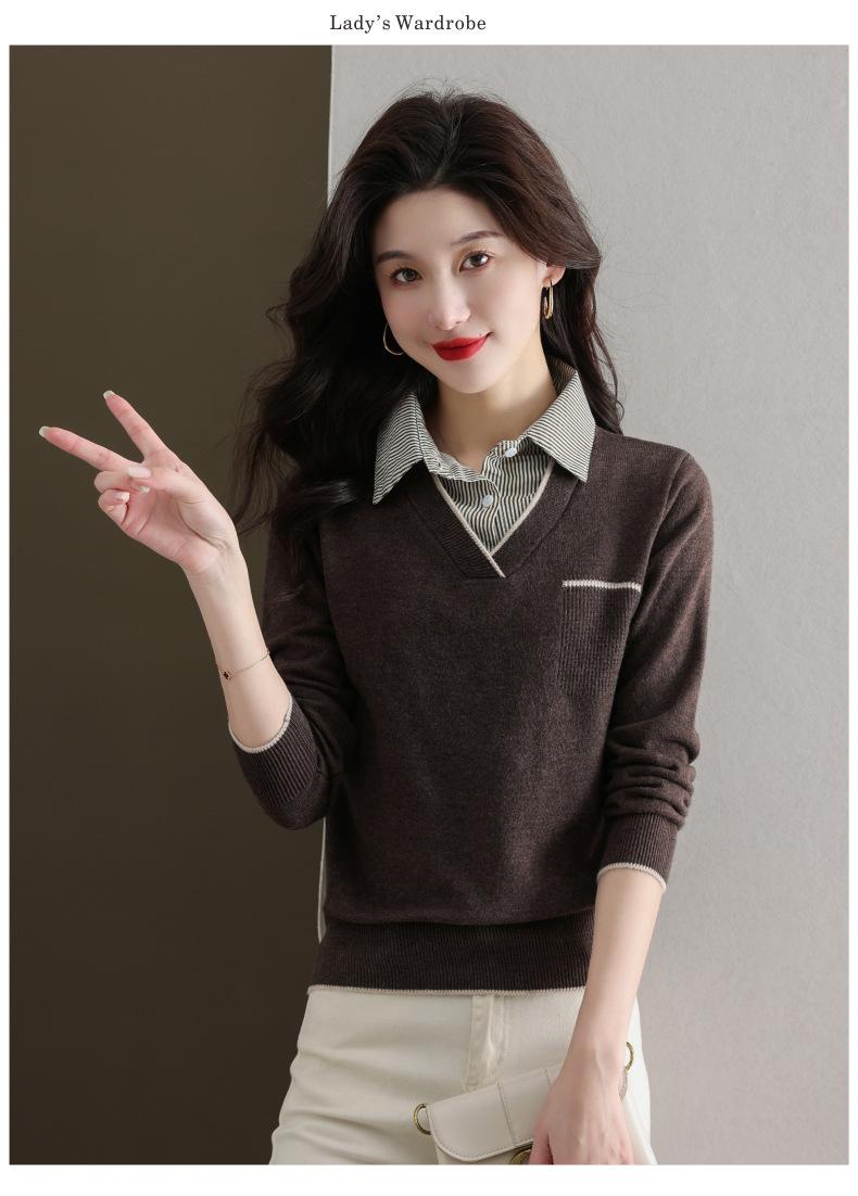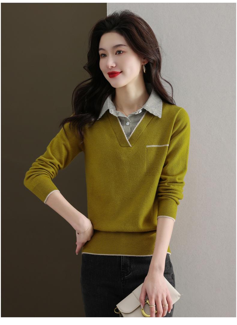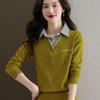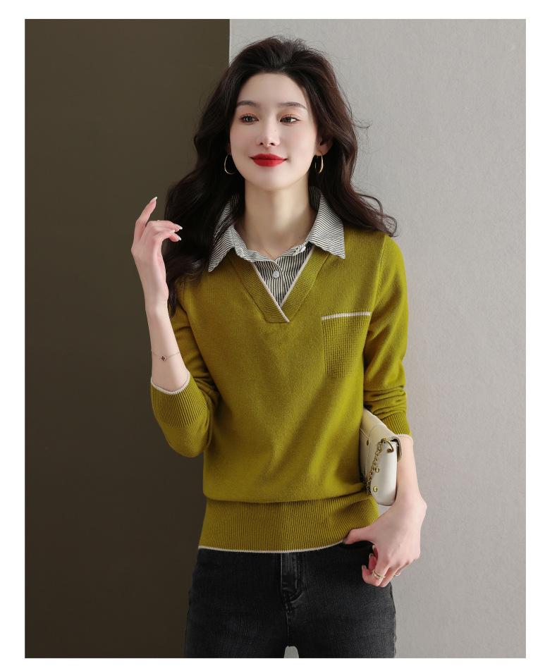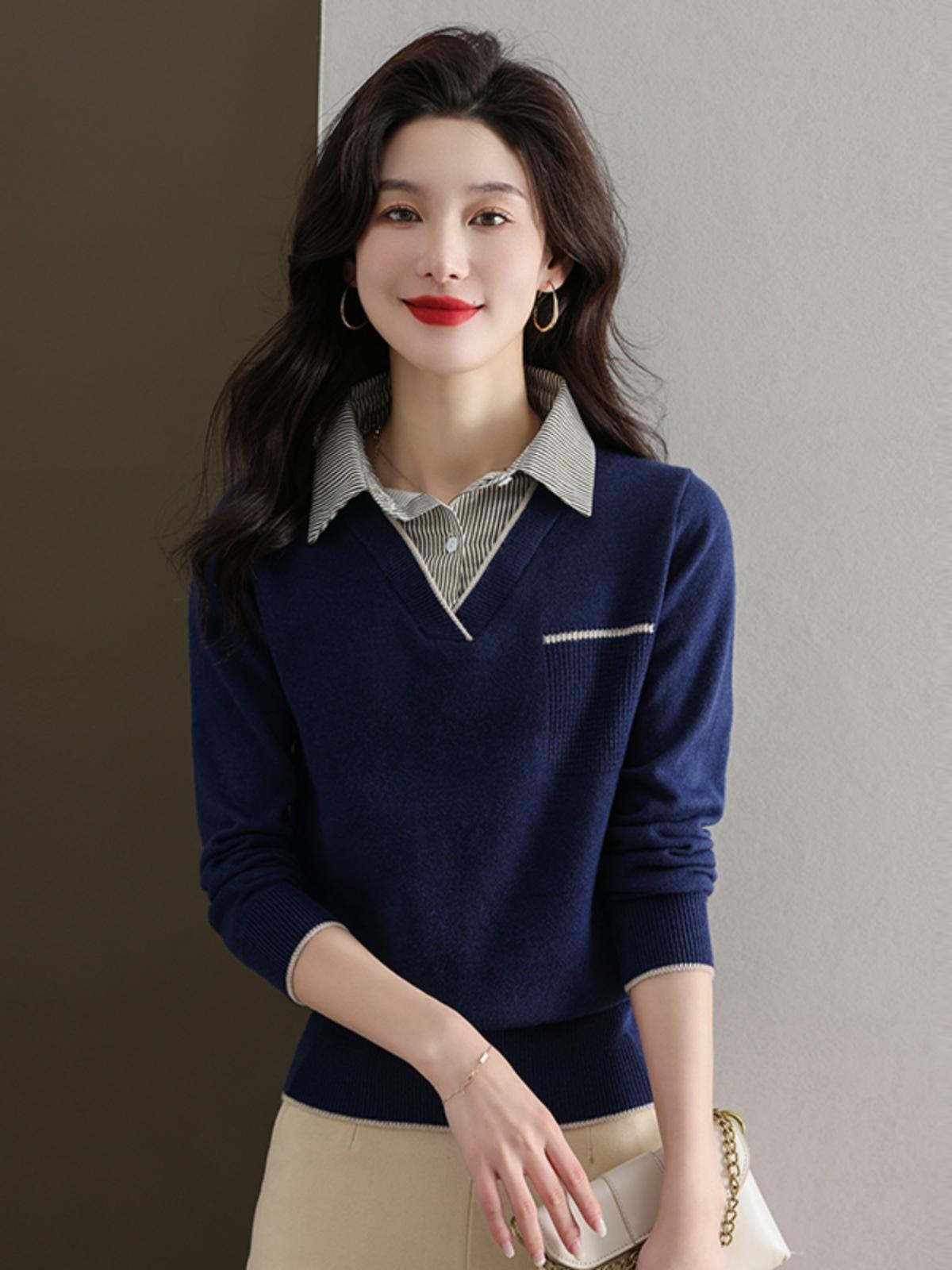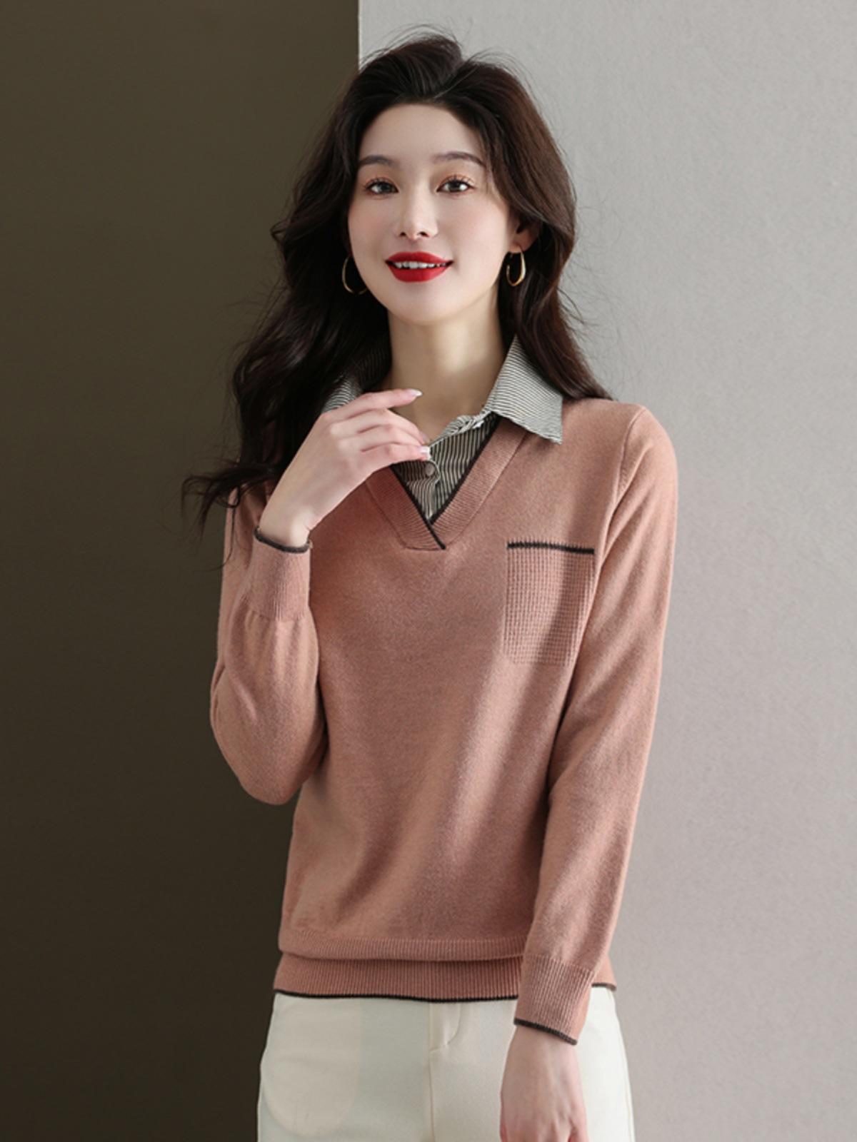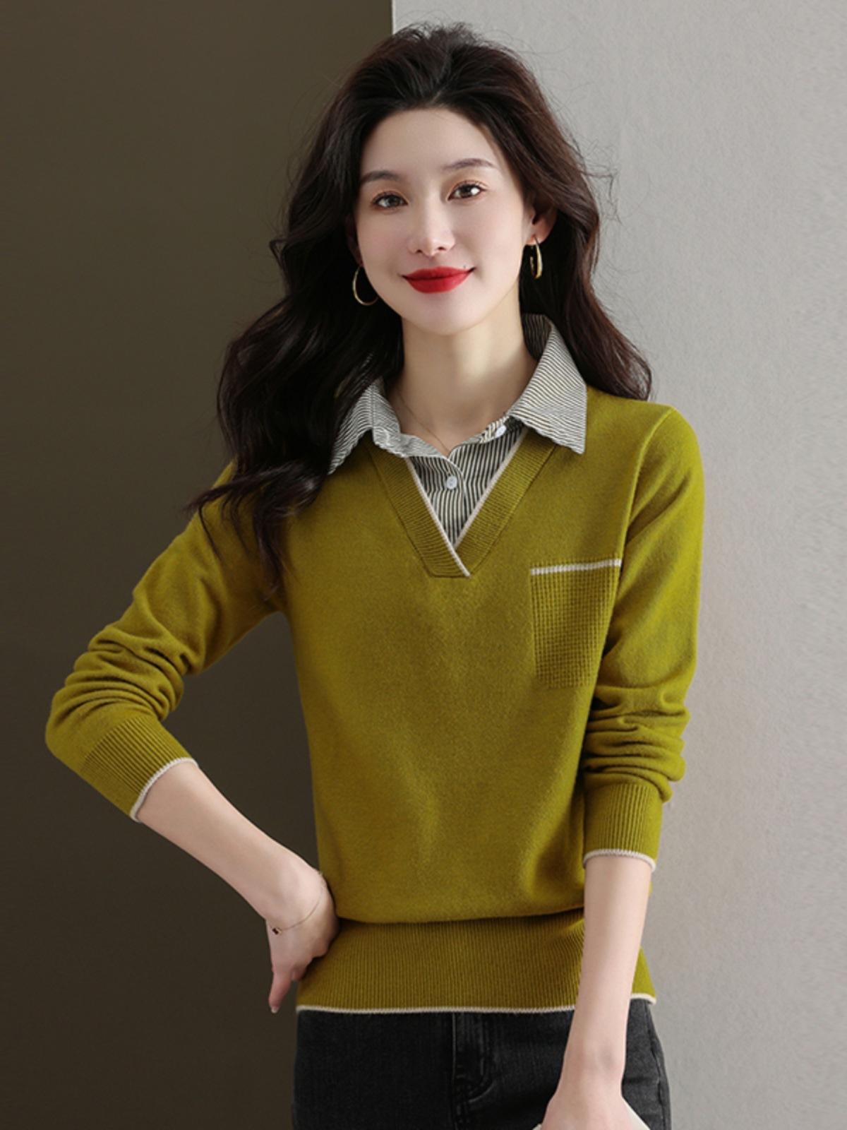 Tejido de punto falso de dos piezas para mujer, nuevo de primavera, suéter de manga larga con cuello de camisa, sentido básico, jersey, top patchwork para mujer