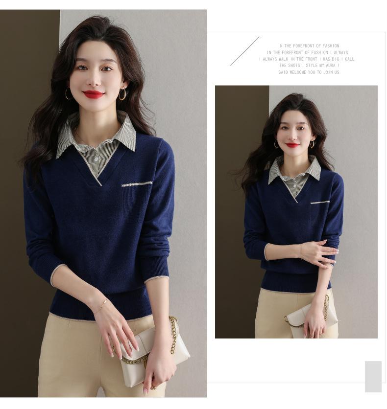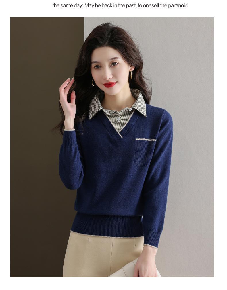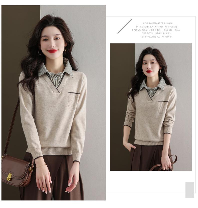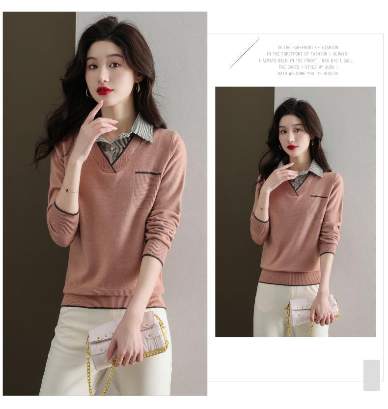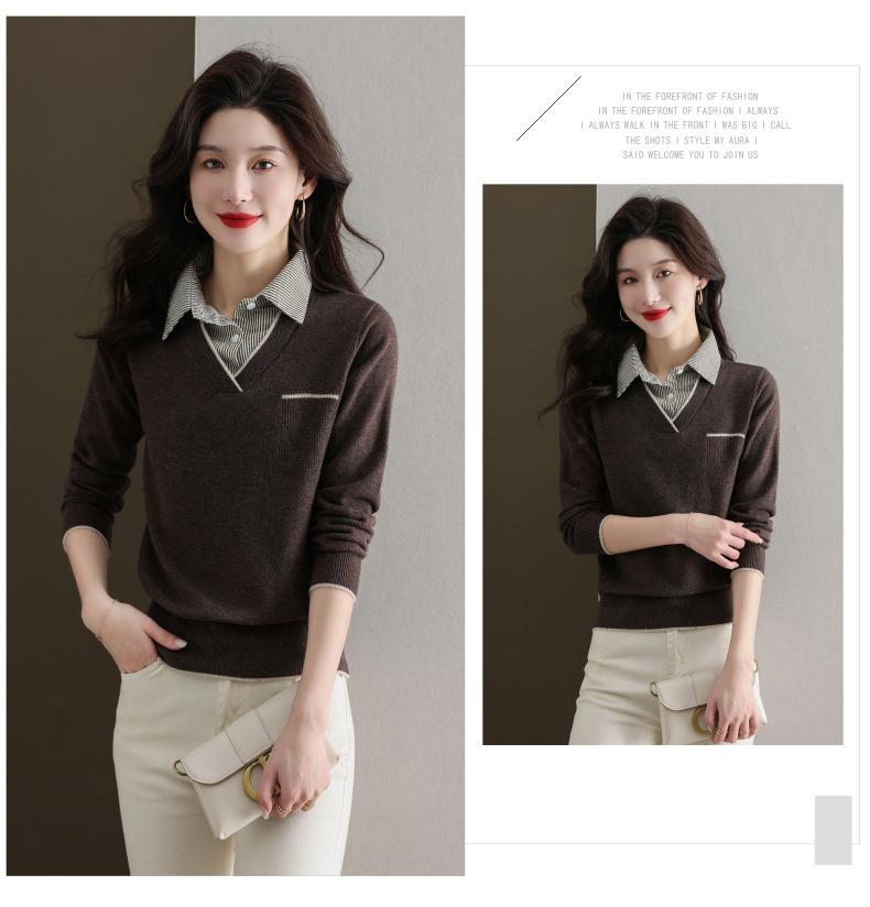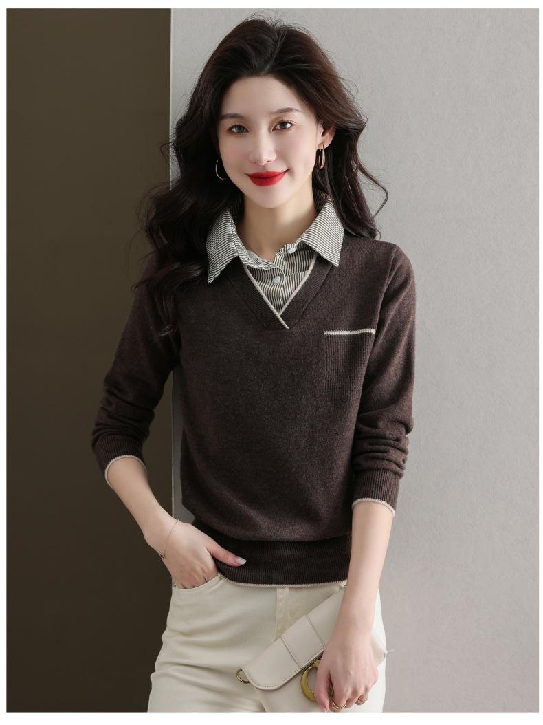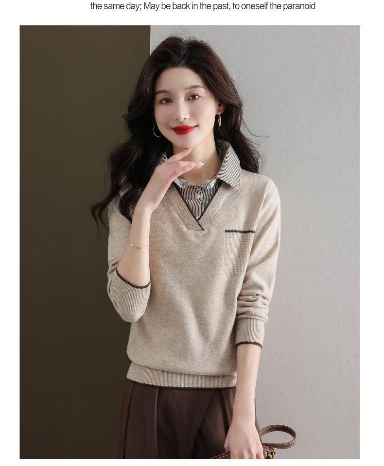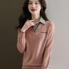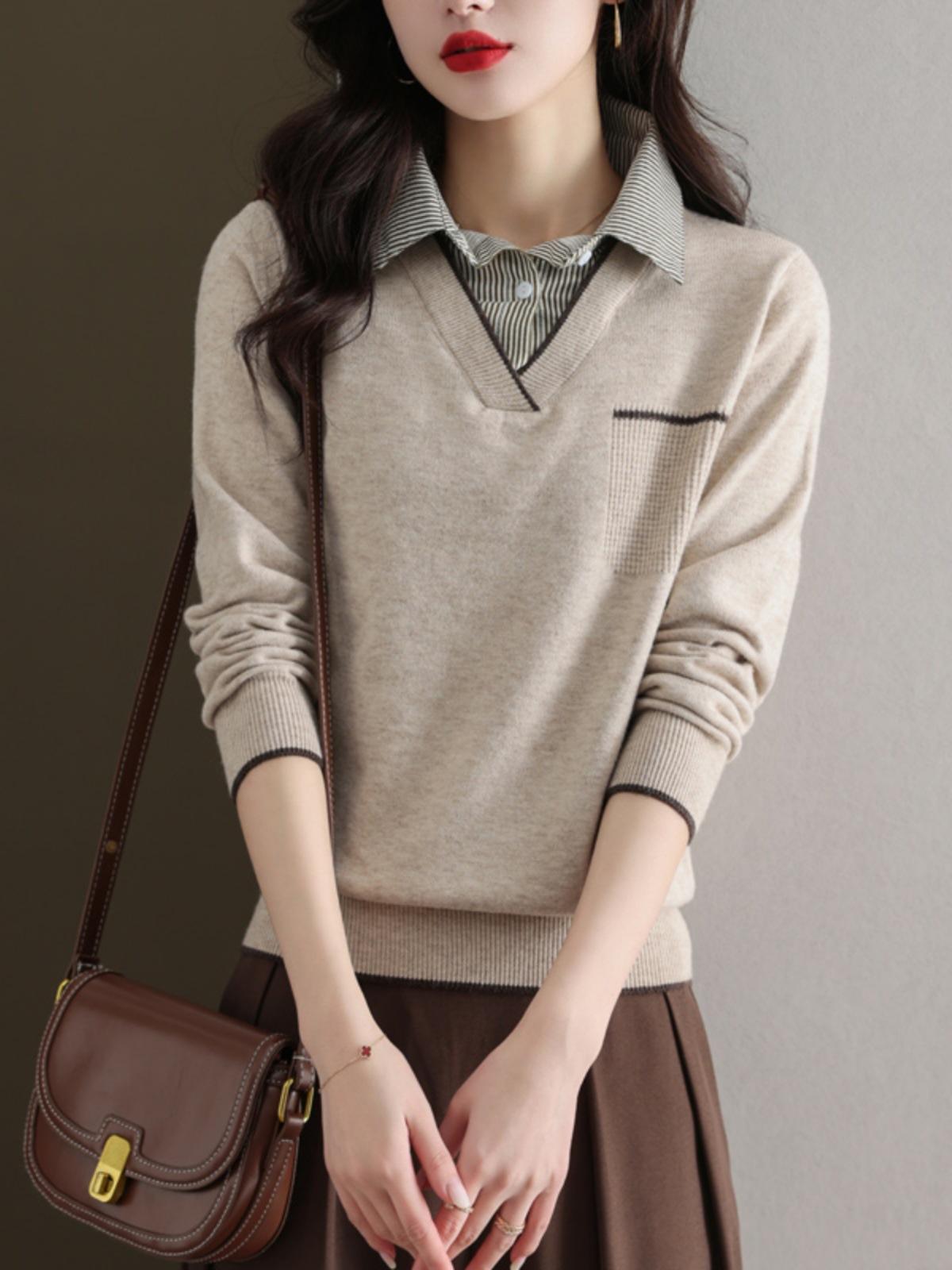 Tejido de punto falso de dos piezas para mujer, nuevo de primavera, suéter de manga larga con cuello de camisa, sentido básico, jersey, top patchwork para mujer