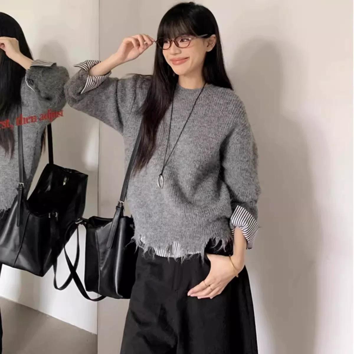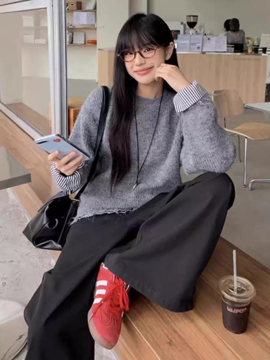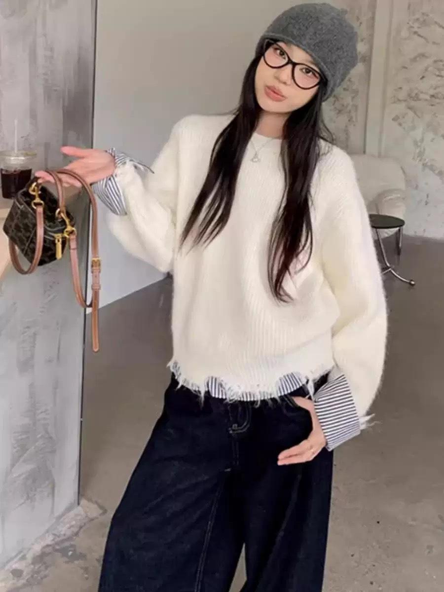 Suéter Base de Patchwork con Manga Rayada Estilo Coreano para Mujer Otoño/Invierno 2025 Nuevo Suelto Suave Versátil Top de Punto