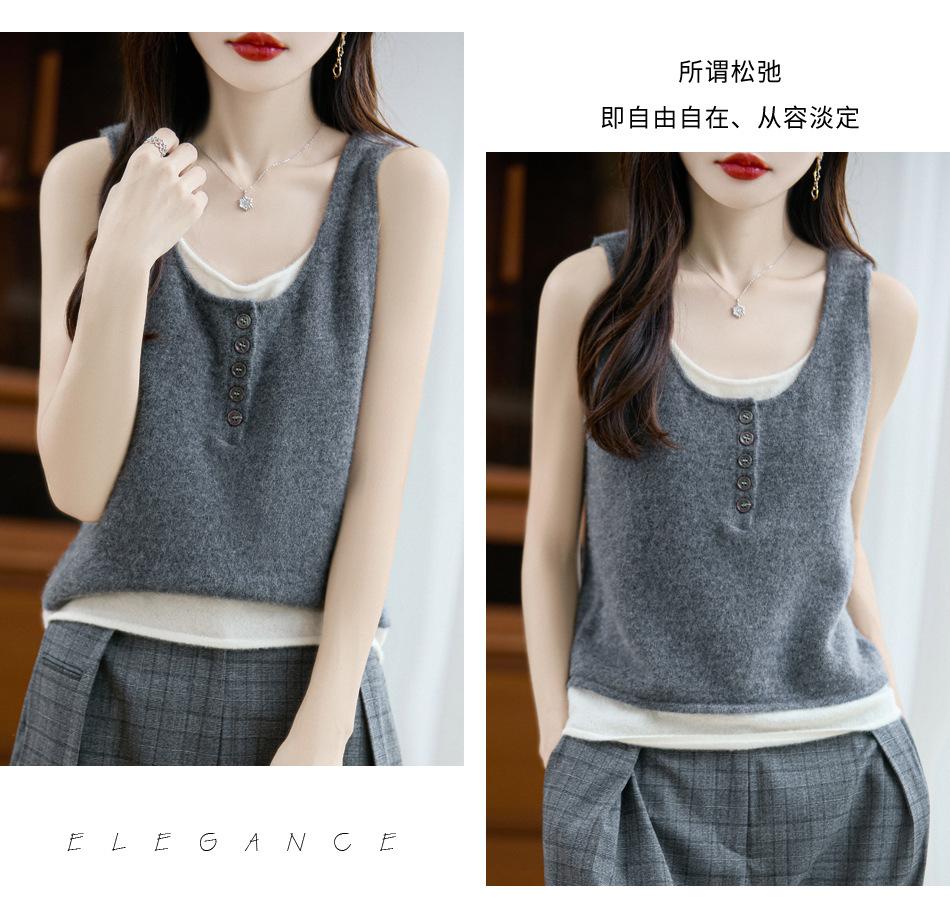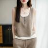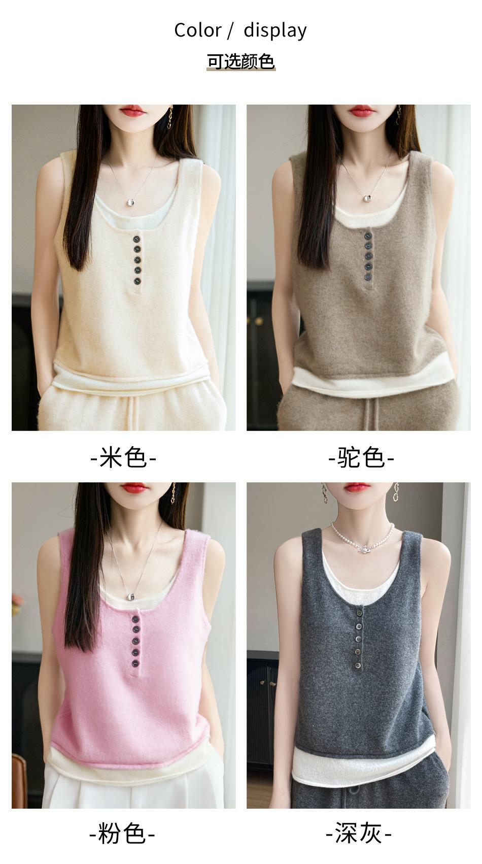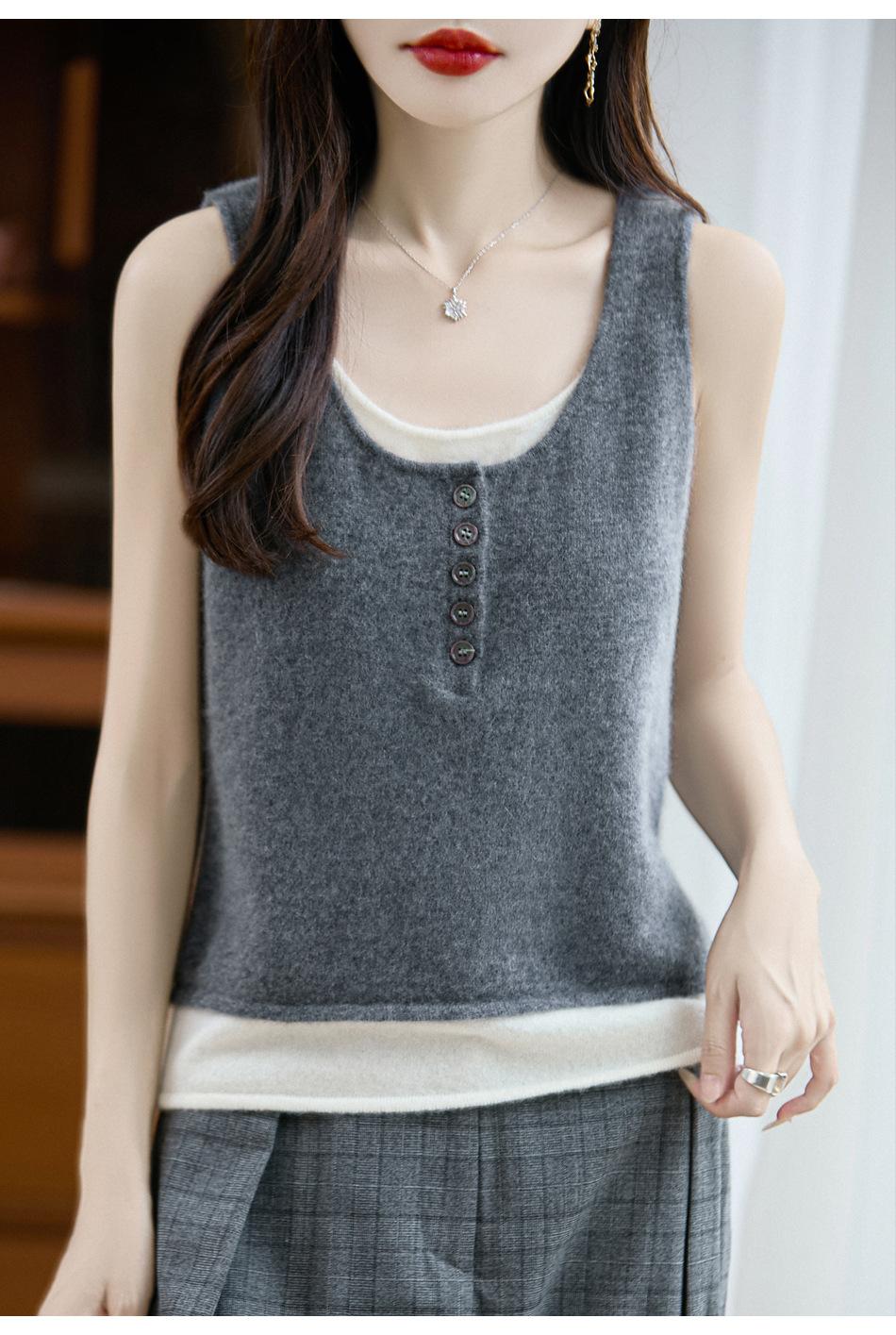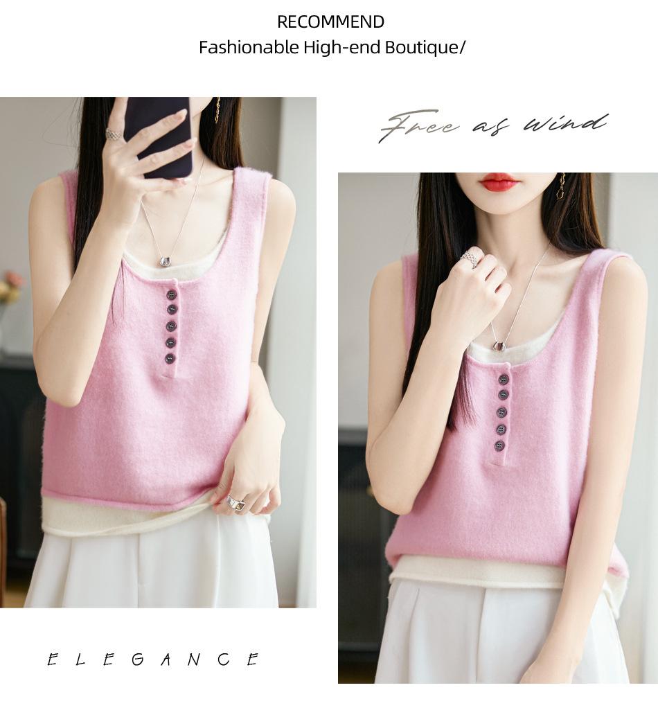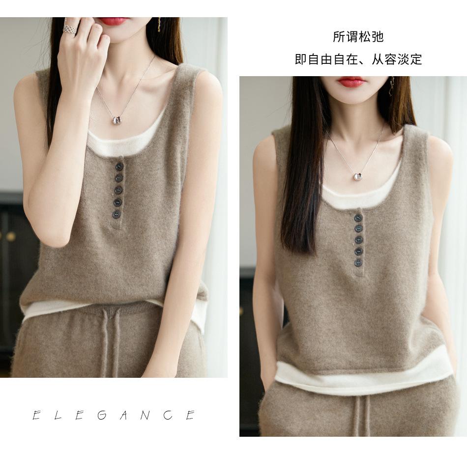 Chaleco de Lana 100% de Dos Piezas Falso para Mujer Otoño Invierno Doble Capa Tejido de Lana Capa Interior Versátil Adelgazante Suéter para Exterior