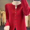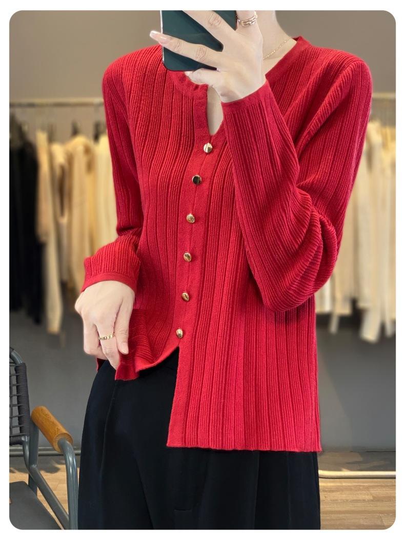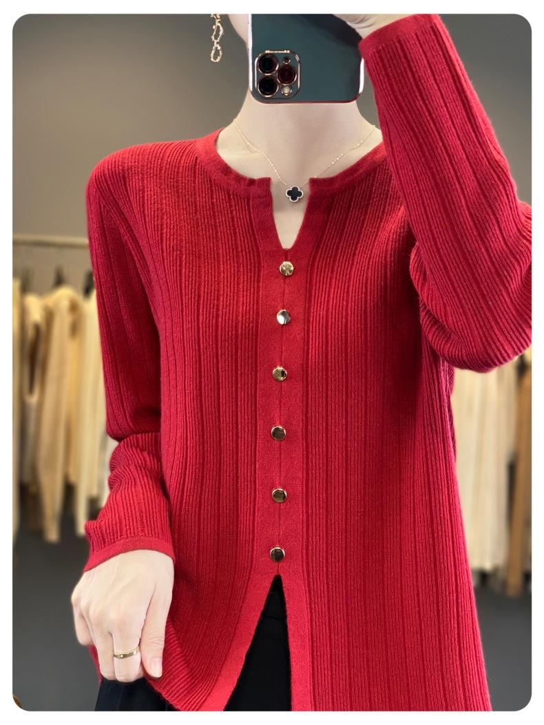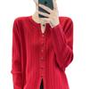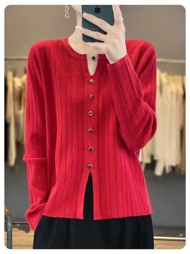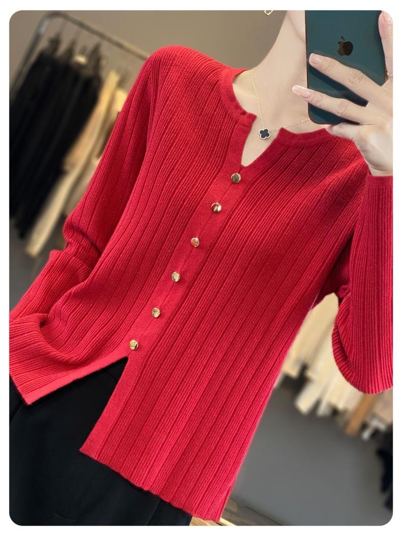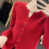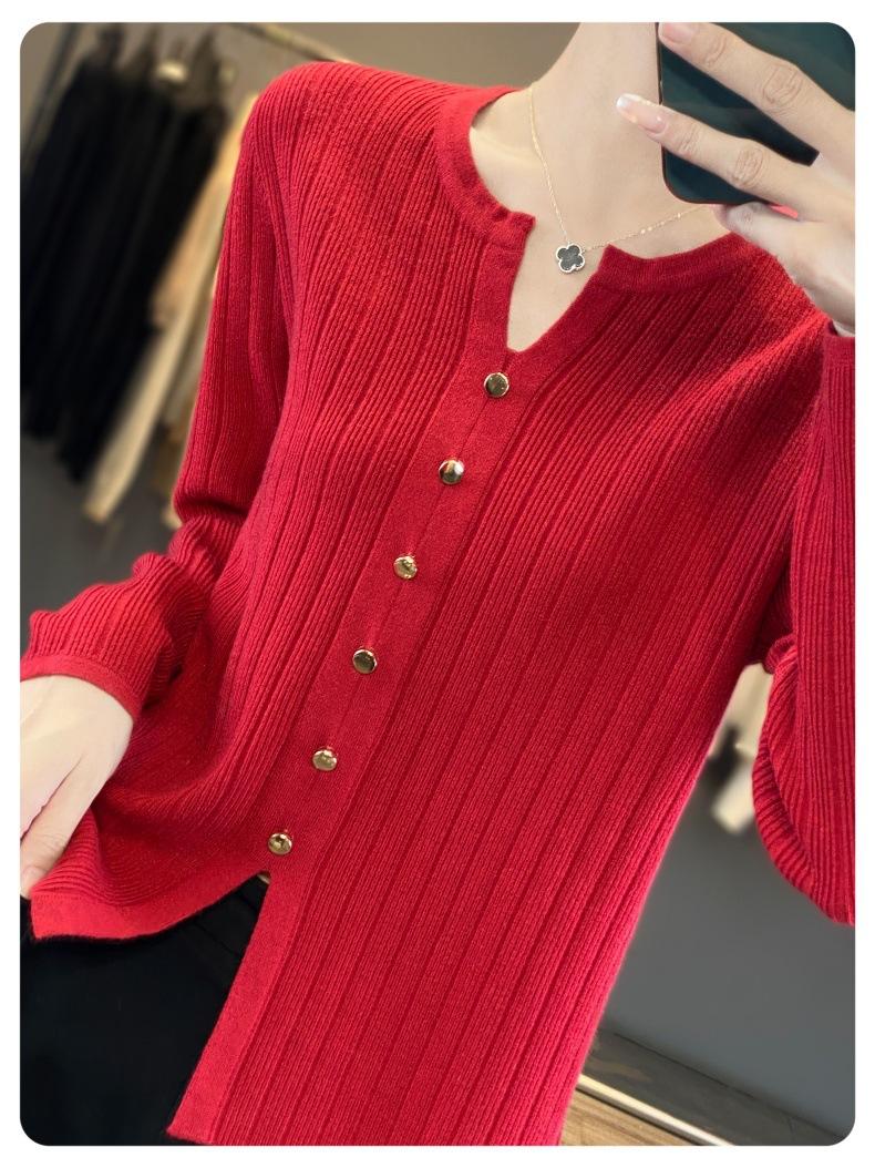 Suéter de punto rojo transfronterizo de cuello en V pequeño de imitación lana de manga larga para mujer otoño 2025 suéter versátil de punto abrigo top
