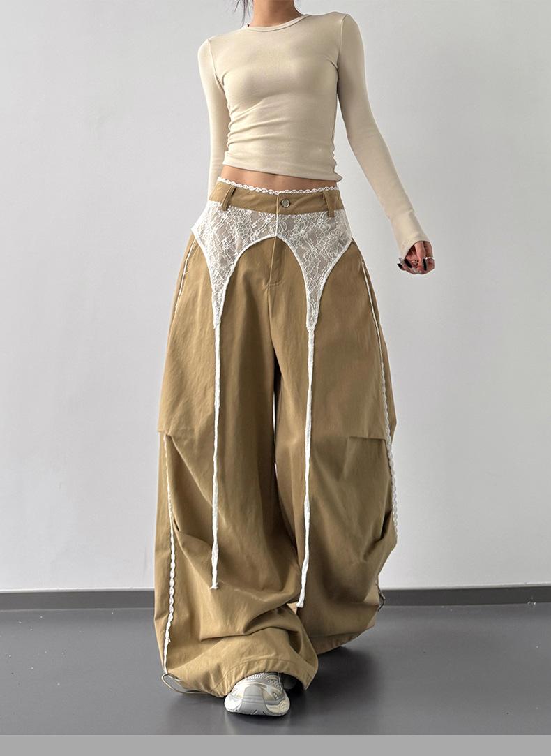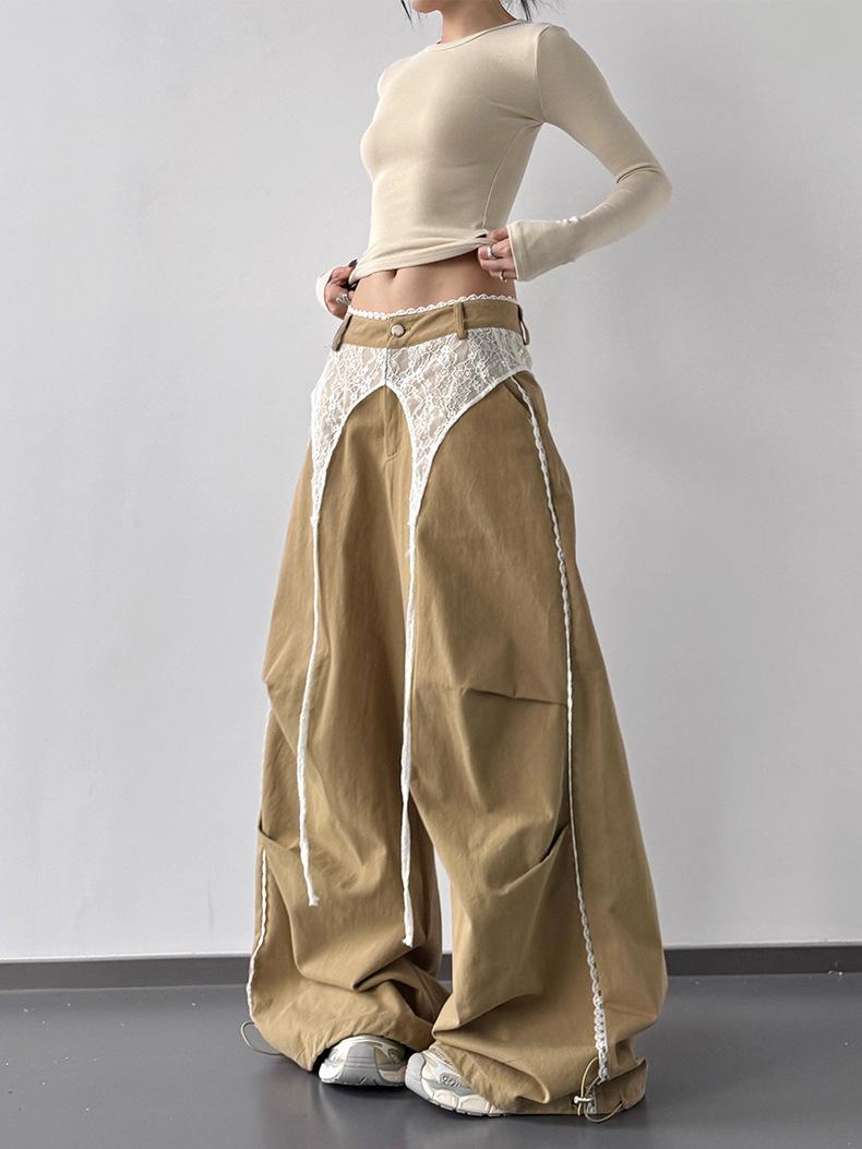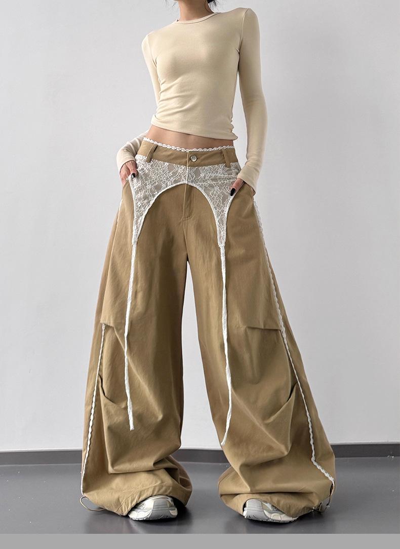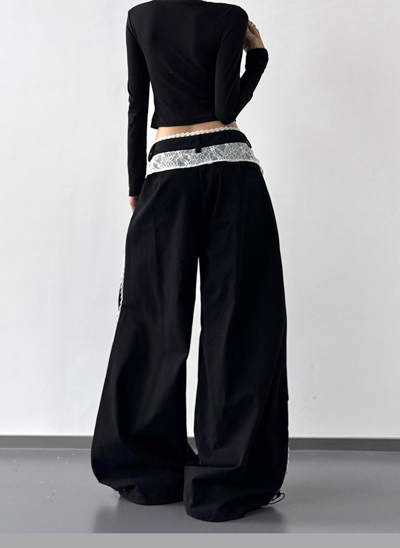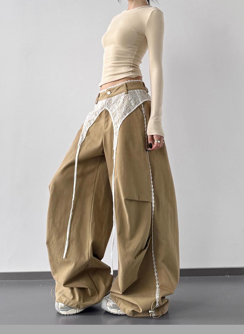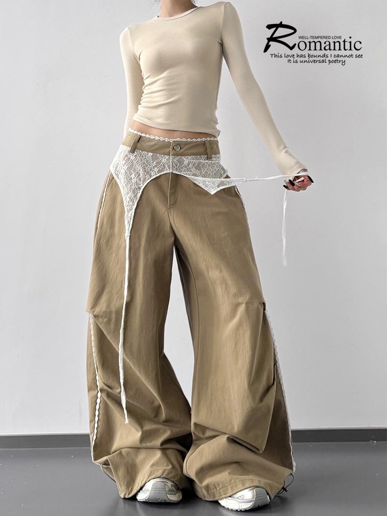 Pantalones Casuales Americanos Retro con Encaje Patchwork y Lazo para Mujer Otoño 2025 Nuevo Cintura Alta Adelgazantes Pierna Ancha Largos