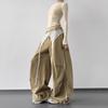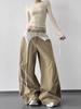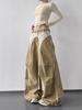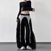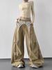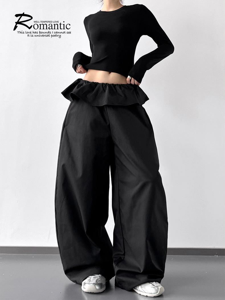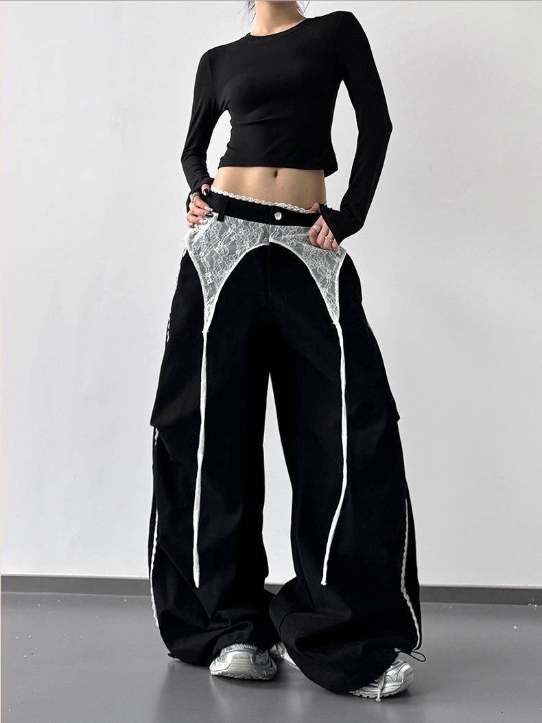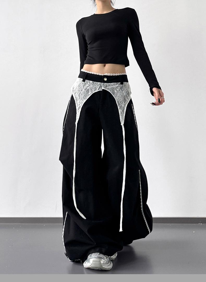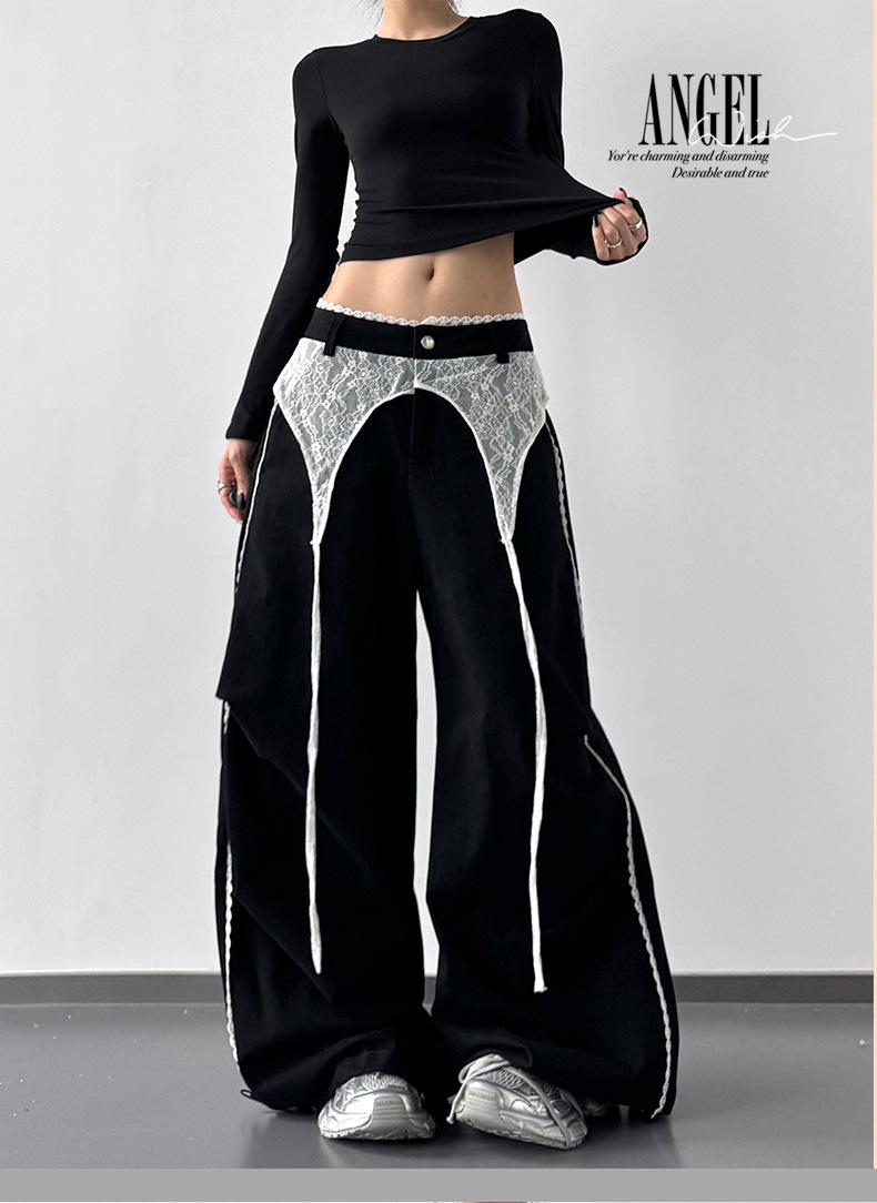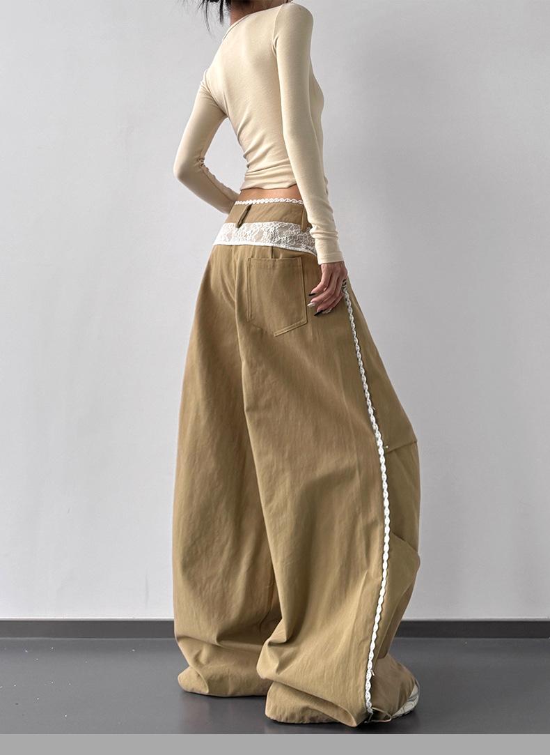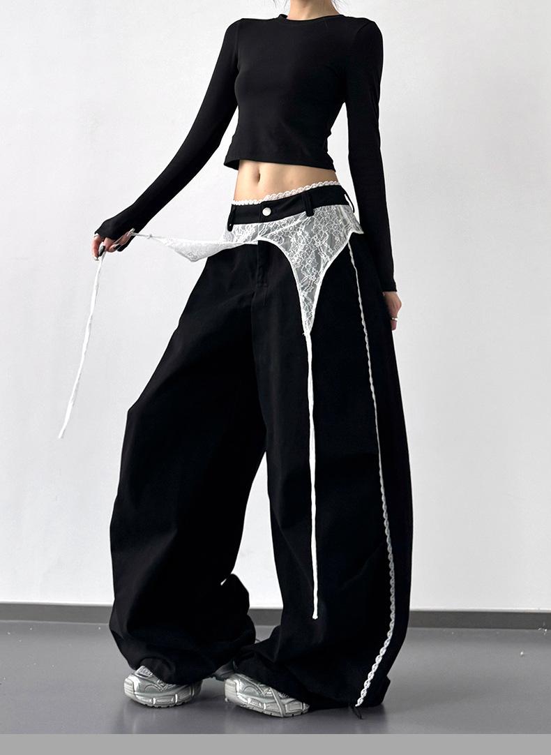 Pantalones Casuales Americanos Retro con Encaje Patchwork y Lazo para Mujer Otoño 2025 Nuevo Cintura Alta Adelgazantes Pierna Ancha Largos