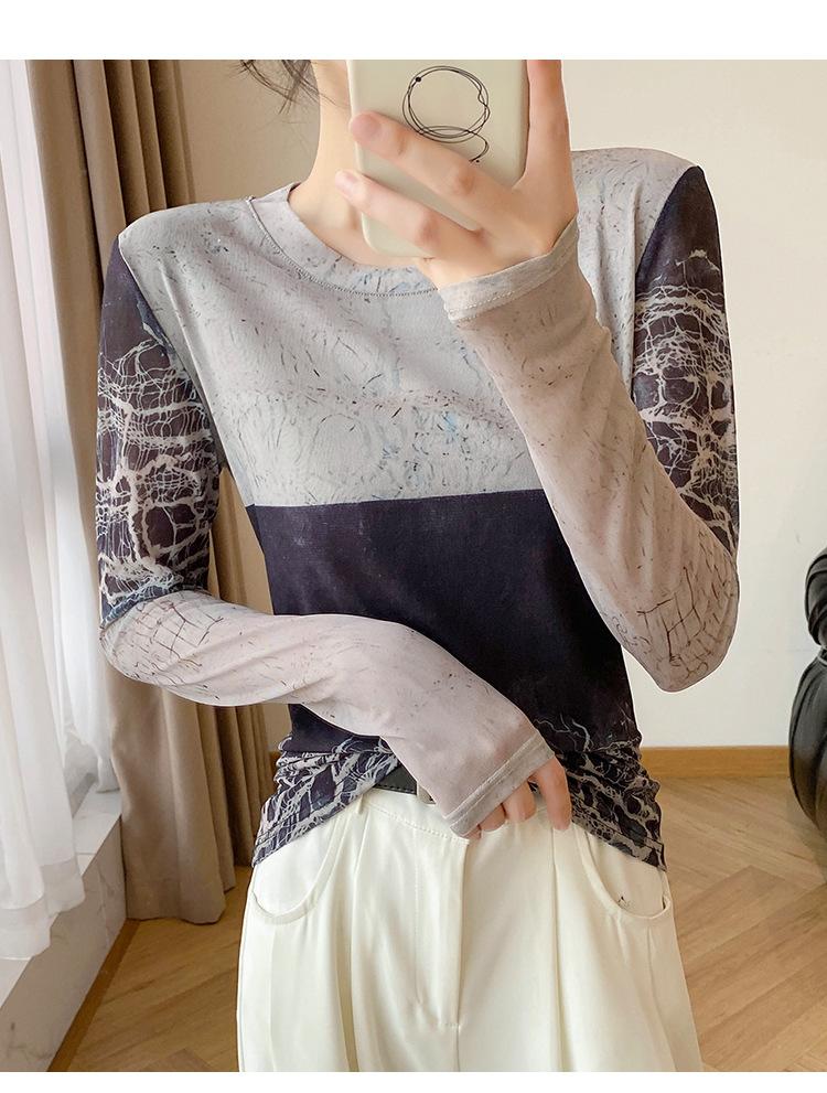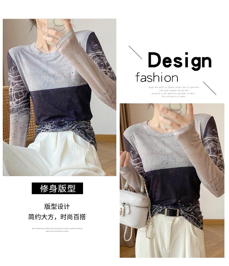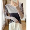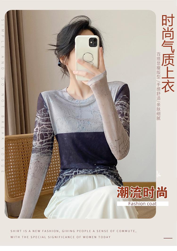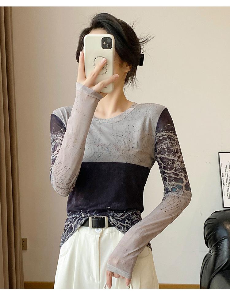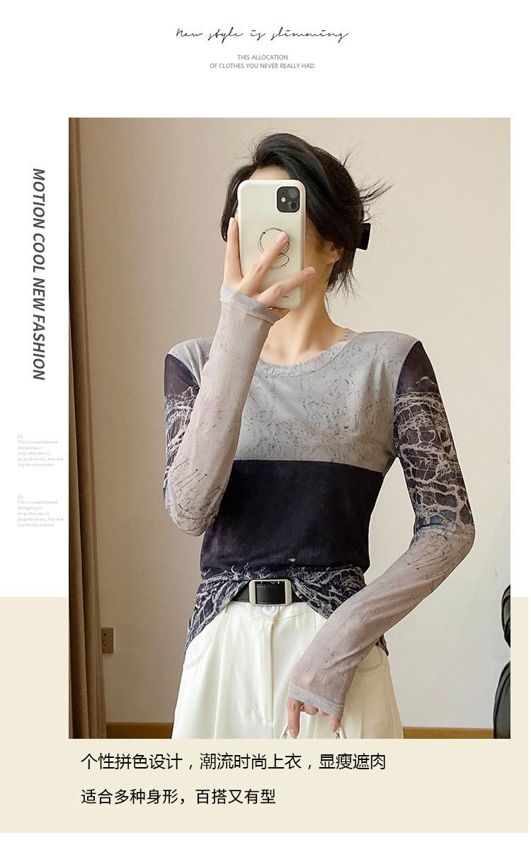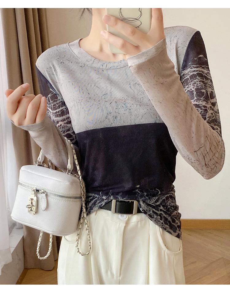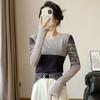 Camiseta Base de Bloques de Color a la Moda para Mujer Manga Larga Otoño Nueva Llegada Estilo Europeo Cuello Redondo Manga Larga Camiseta Ajustada Capa Interior Top de Malla