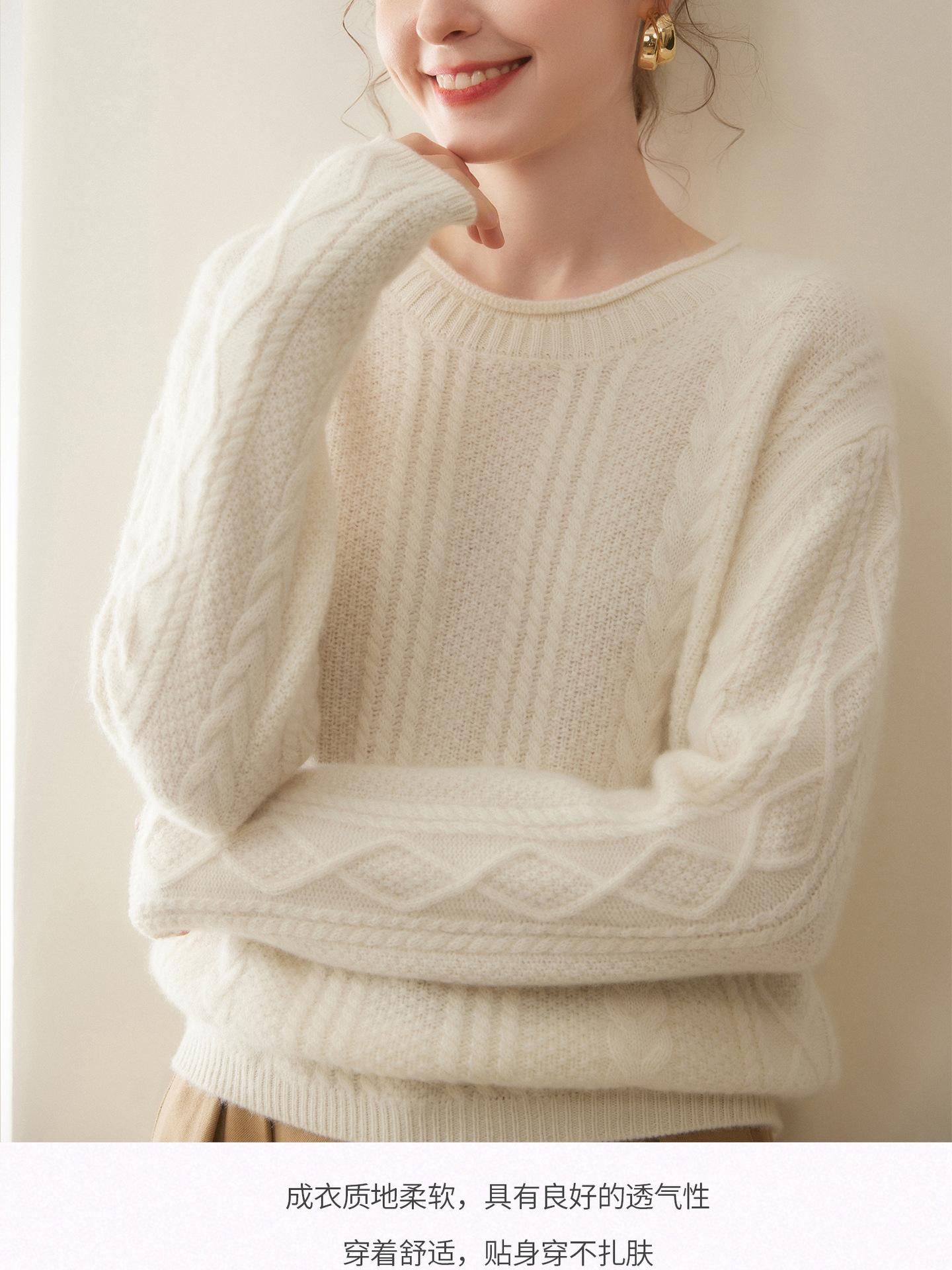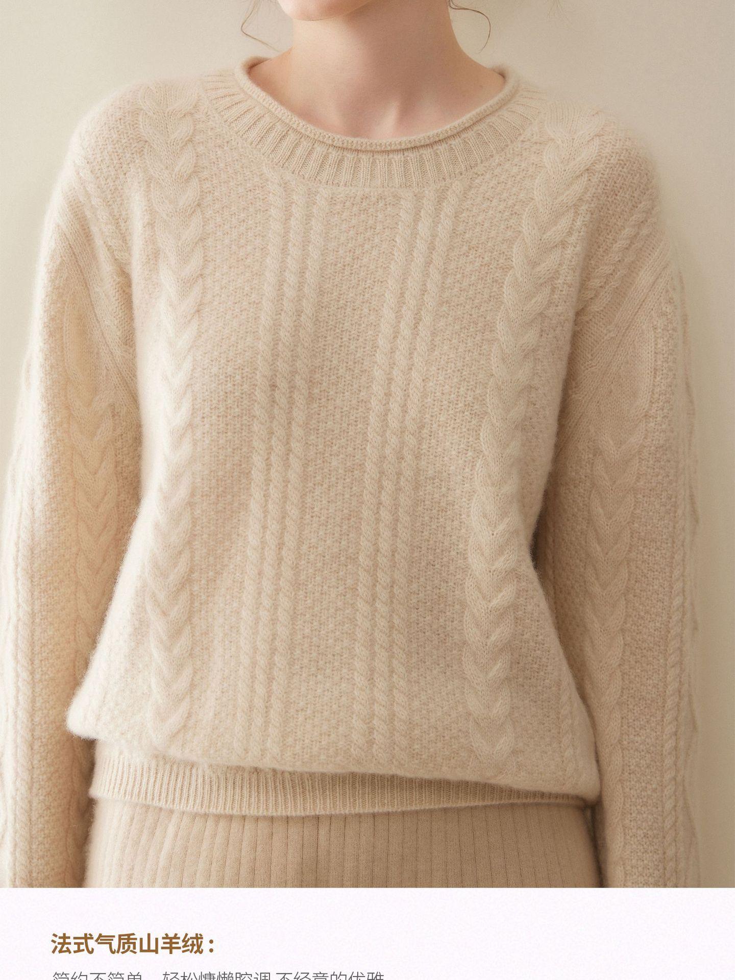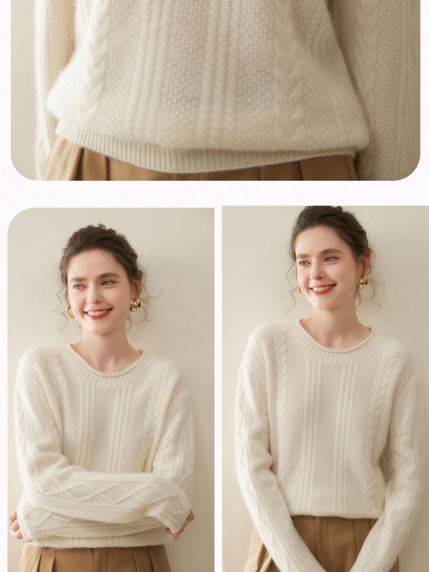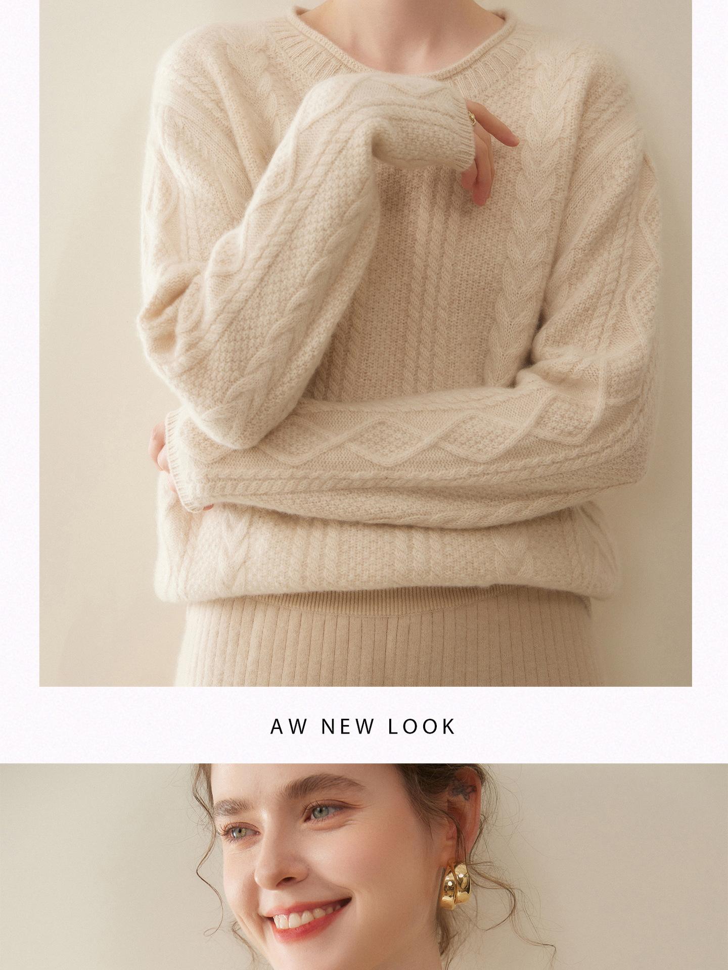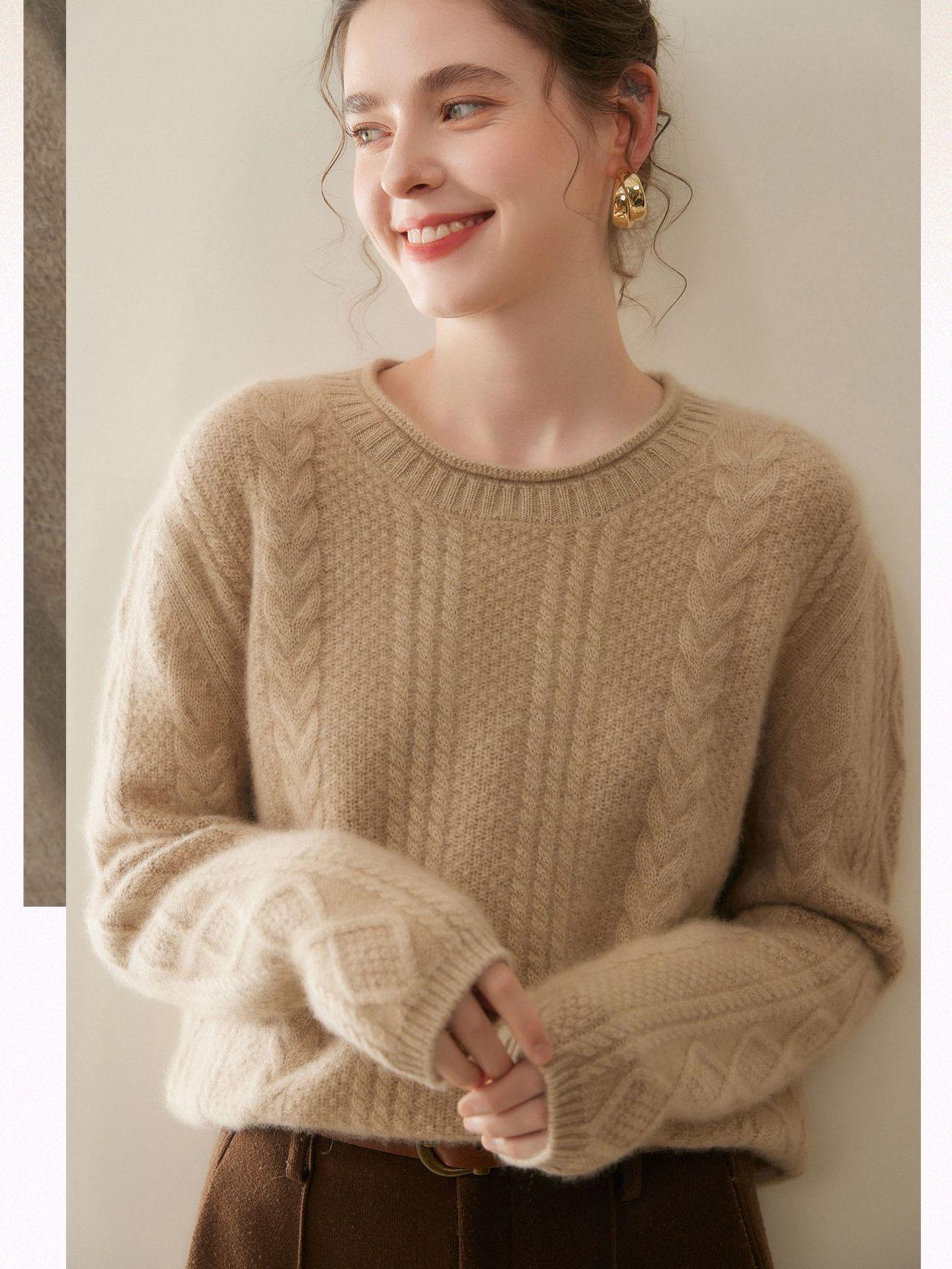 Nuevo Otoño/Invierno Clásico Suéter de Cachemira de Punto Cable con Cuello Redondo de Tres Hebras y Borde Enrollado para Mujer, Moda, Jersey de Punto Extra Grueso de Manga Larga