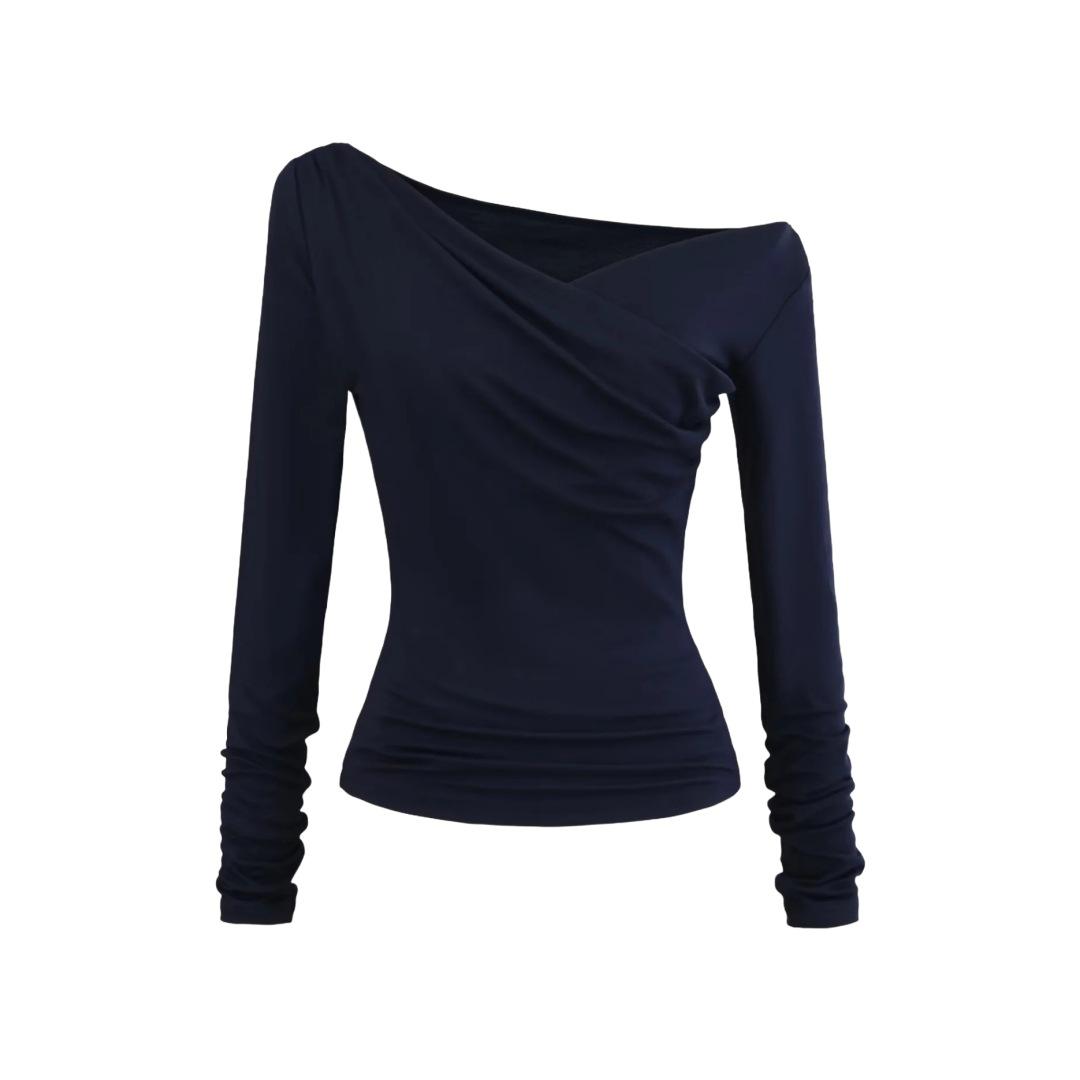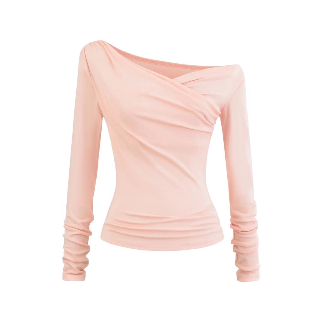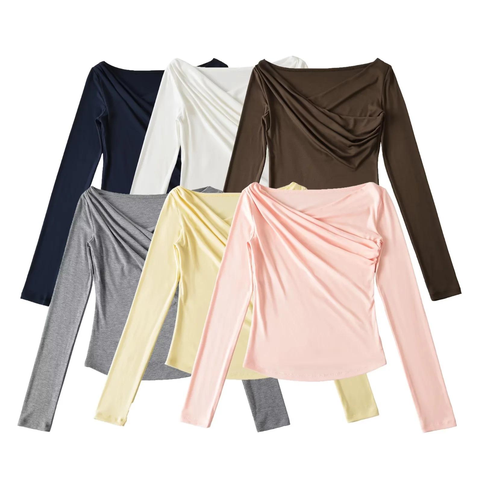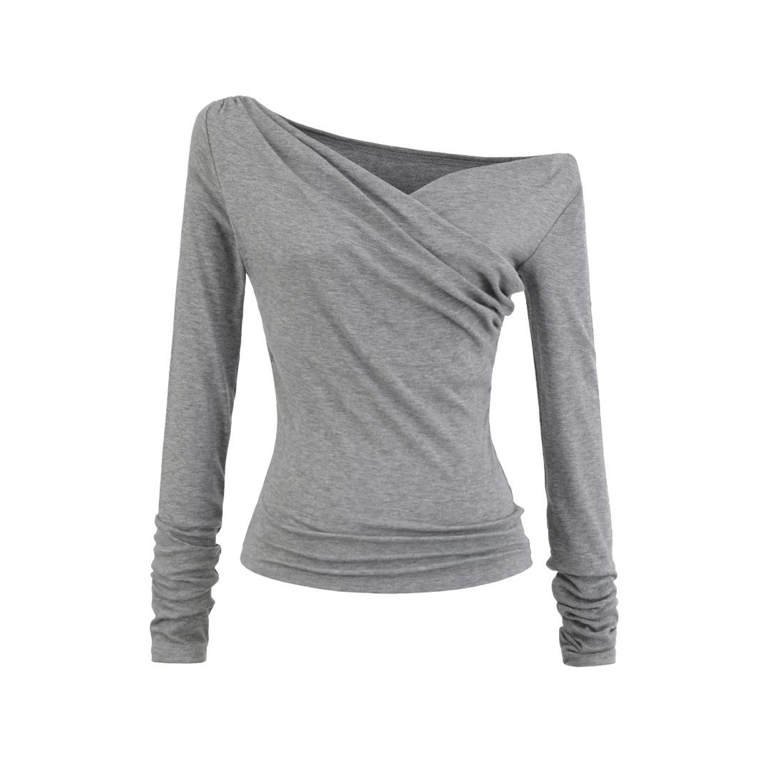 Diseño de Color Sólido Fruncido de un Hombro Camiseta Básica para Mujer Pura y Sexy Chica Caliente Sexy Fuera del Hombro Ajustada Manga Larga